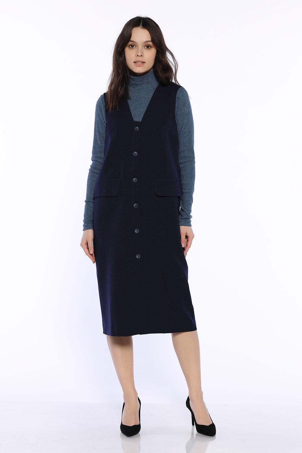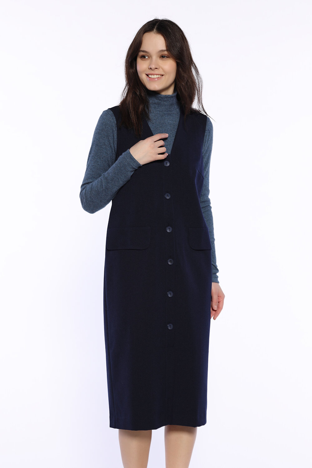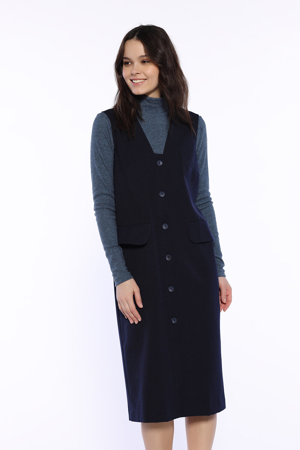 Комфортное осеннее платье-сарафан длины миди придаст особого шарма осенним образам. На передней части платья декоративные клапана, карманов нет. Осенью наденьте под платье свитер,джемпер или водолазку.