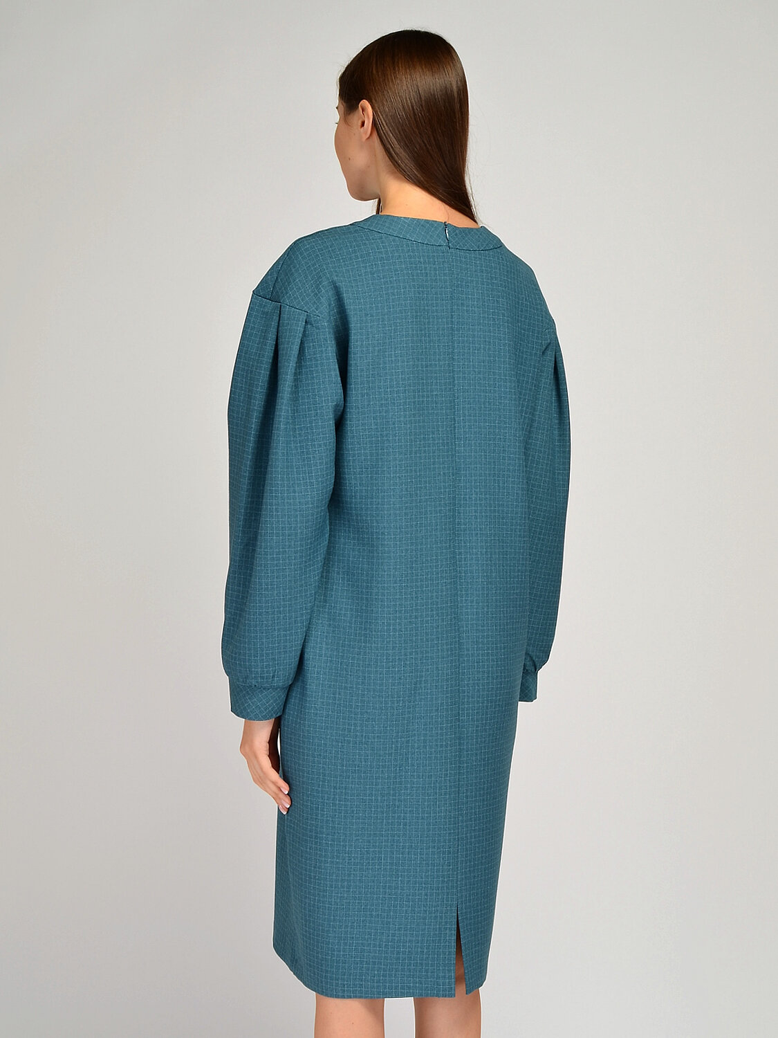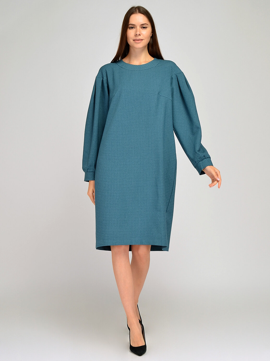 Удобное женское платье миди свободного кроя с объемными рукавами со складками станет беспроигрышным вариантом в осеннем гардеробе. Свободный фасон скроет возможные недостатки фигуры, а разрез сзади позволит чувствовать себя комфортно при ходьбе. Прямое платье будет уместно смотреться в офисе, на прогулке, на торжественном мероприятии или в театре. Чтобы подчеркнуть талию и вытянуть силуэт, подберите к платью ремень и обувь на высоком ходу. Дополните образ яркими украшениями, чтобы получился праздничный комплект.