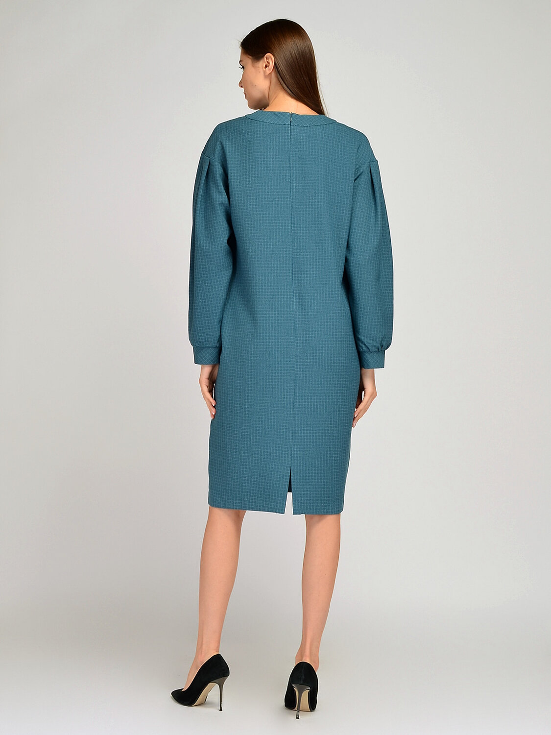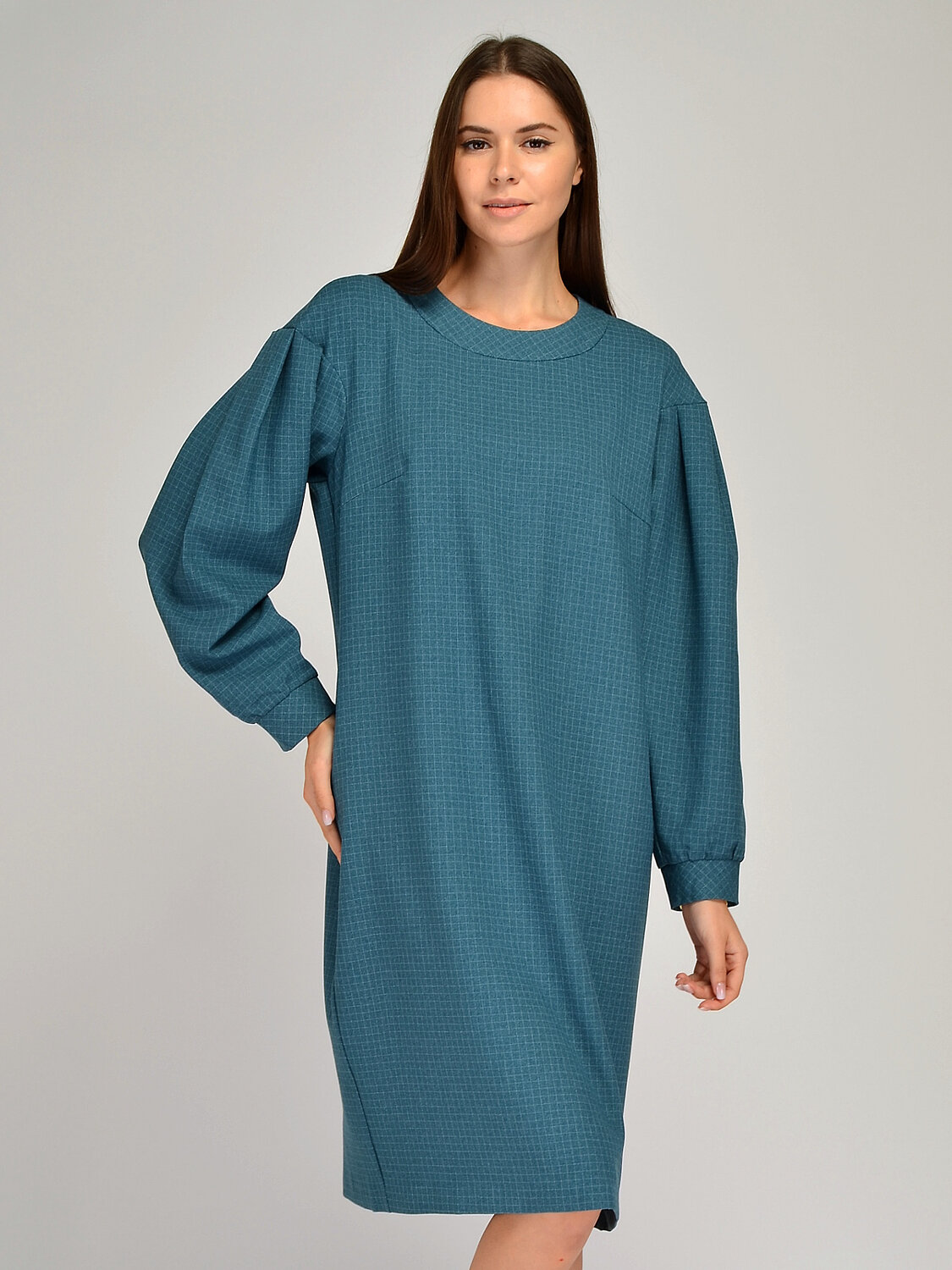 Удобное женское платье миди свободного кроя с объемными рукавами со складками станет беспроигрышным вариантом в осеннем гардеробе. Свободный фасон скроет возможные недостатки фигуры, а разрез сзади позволит чувствовать себя комфортно при ходьбе. Прямое платье будет уместно смотреться в офисе, на прогулке, на торжественном мероприятии или в театре. Чтобы подчеркнуть талию и вытянуть силуэт, подберите к платью ремень и обувь на высоком ходу. Дополните образ яркими украшениями, чтобы получился праздничный комплект.