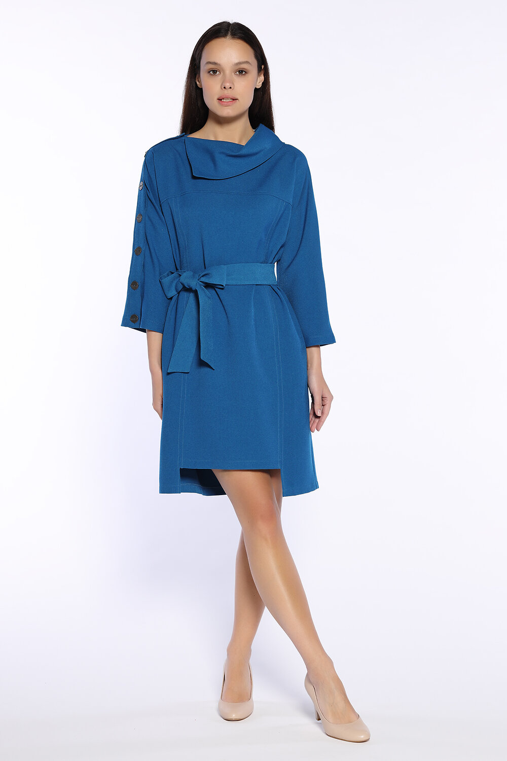 Праздничное платье миди с интересными декоративными деталями создаст неповторимый образ для праздника, торжественного случая или на каждый день. Стильное офисное платье имеет вырез горловины лодочка и эффектный фантазийный воротник. Свободные рукава три четверти ниже локтя декорированы пуговицами с одной стороны и не стесняют движений. Платье выше колена комплектуется длинным поясом в цвет платья, выгодно выделяя талию и создавая женственный силуэт. Платье имеет асимметричную длину (спереди квадратный вырез выше колена), визуально вытягивает фигуру. Для удобства современных девушек шикарное нарядное платье дополнено практичными боковыми карманами. Лаконичный приталенный полуприлегающий крой идеально сядет на любую фигуру и скроет ее возможные недостатки. Платье выполнено из приятной плотной ткани и идеально подойдет для весны, осени, зимы. Универсальное платье впишется в гардероб как взрослой женщины, так и молодой девушки.