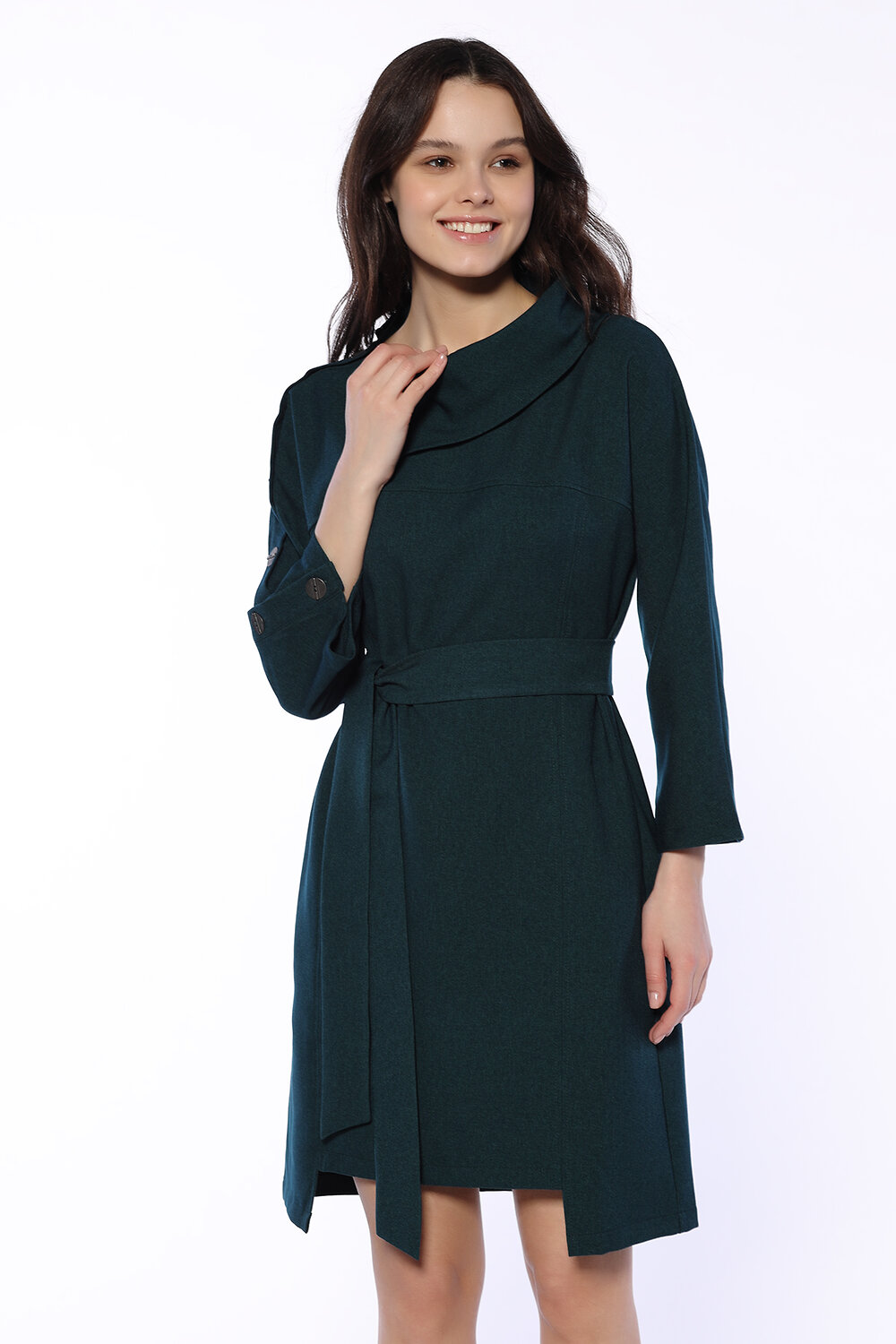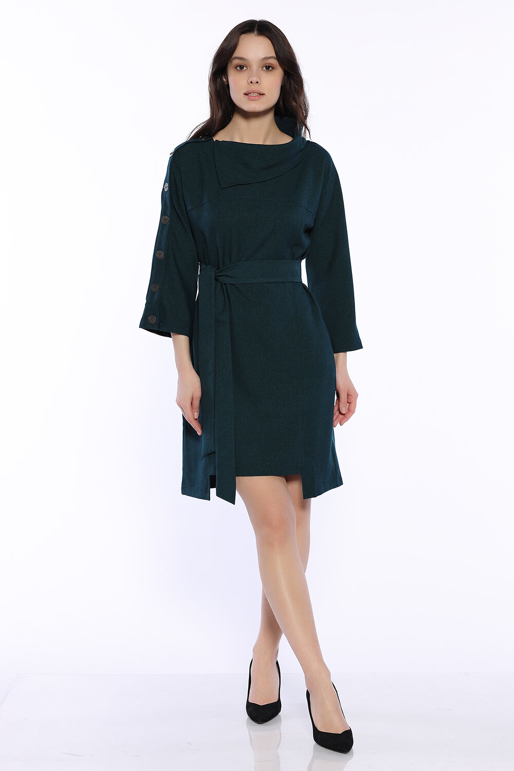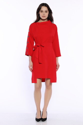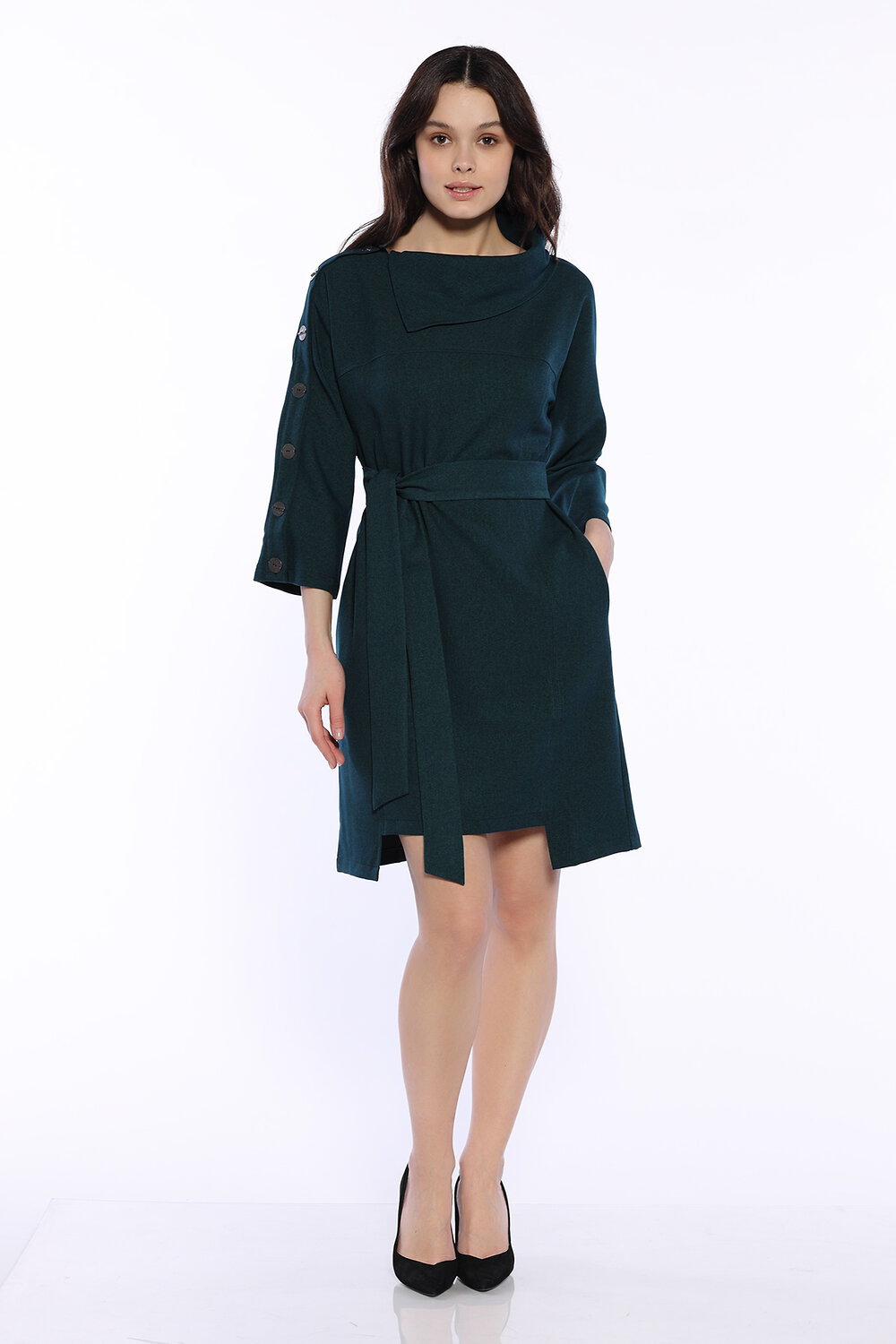 Праздничное платье миди с интересными декоративными деталями создаст неповторимый образ для праздника, торжественного случая или на каждый день. Стильное офисное платье имеет вырез горловины лодочка и эффектный фантазийный воротник. Свободные рукава три четверти ниже локтя декорированы пуговицами с одной стороны и не стесняют движений. Платье выше колена комплектуется длинным поясом в цвет платья, выгодно выделяя талию и создавая женственный силуэт. Платье имеет асимметричную длину (спереди квадратный вырез выше колена), визуально вытягивает фигуру. Для удобства современных девушек шикарное нарядное платье дополнено практичными боковыми карманами. Лаконичный приталенный полуприлегающий крой идеально сядет на любую фигуру и скроет ее возможные недостатки. Платье выполнено из приятной плотной ткани и идеально подойдет для весны, осени, зимы. Универсальное платье впишется в гардероб как взрослой женщины, так и молодой девушки.