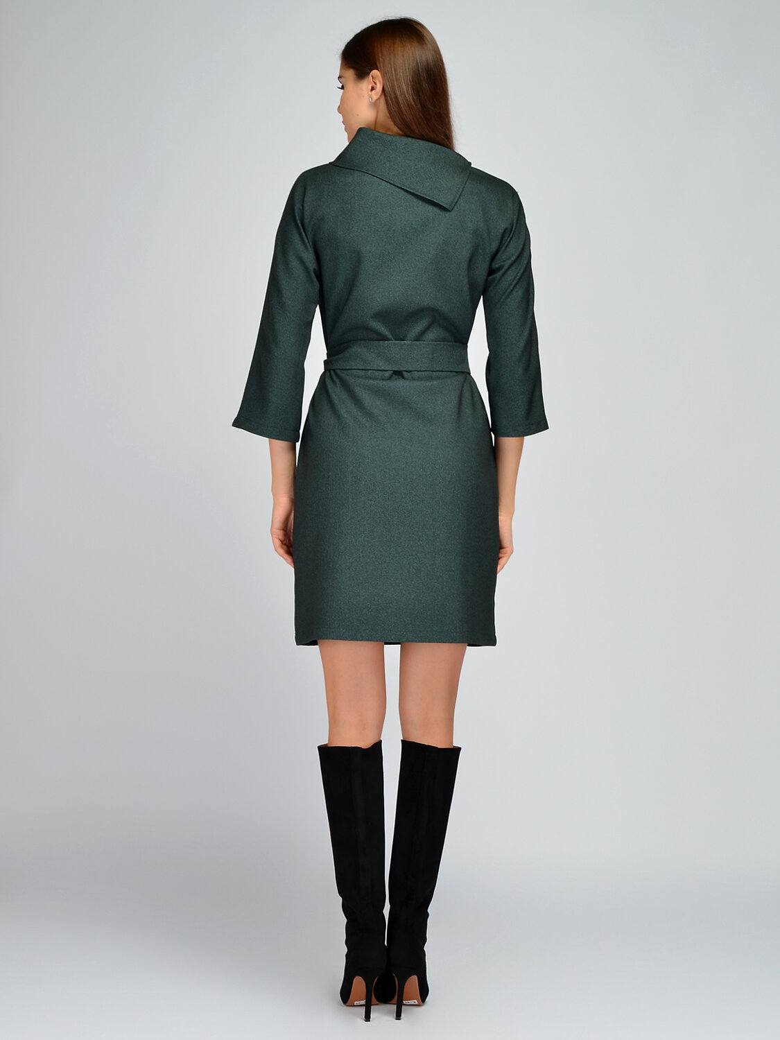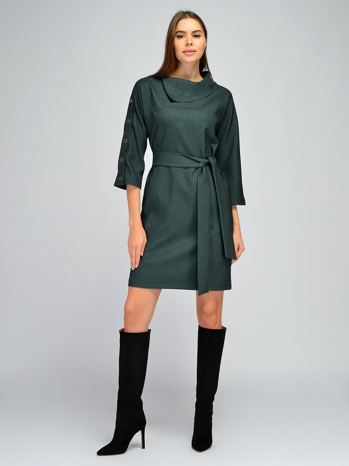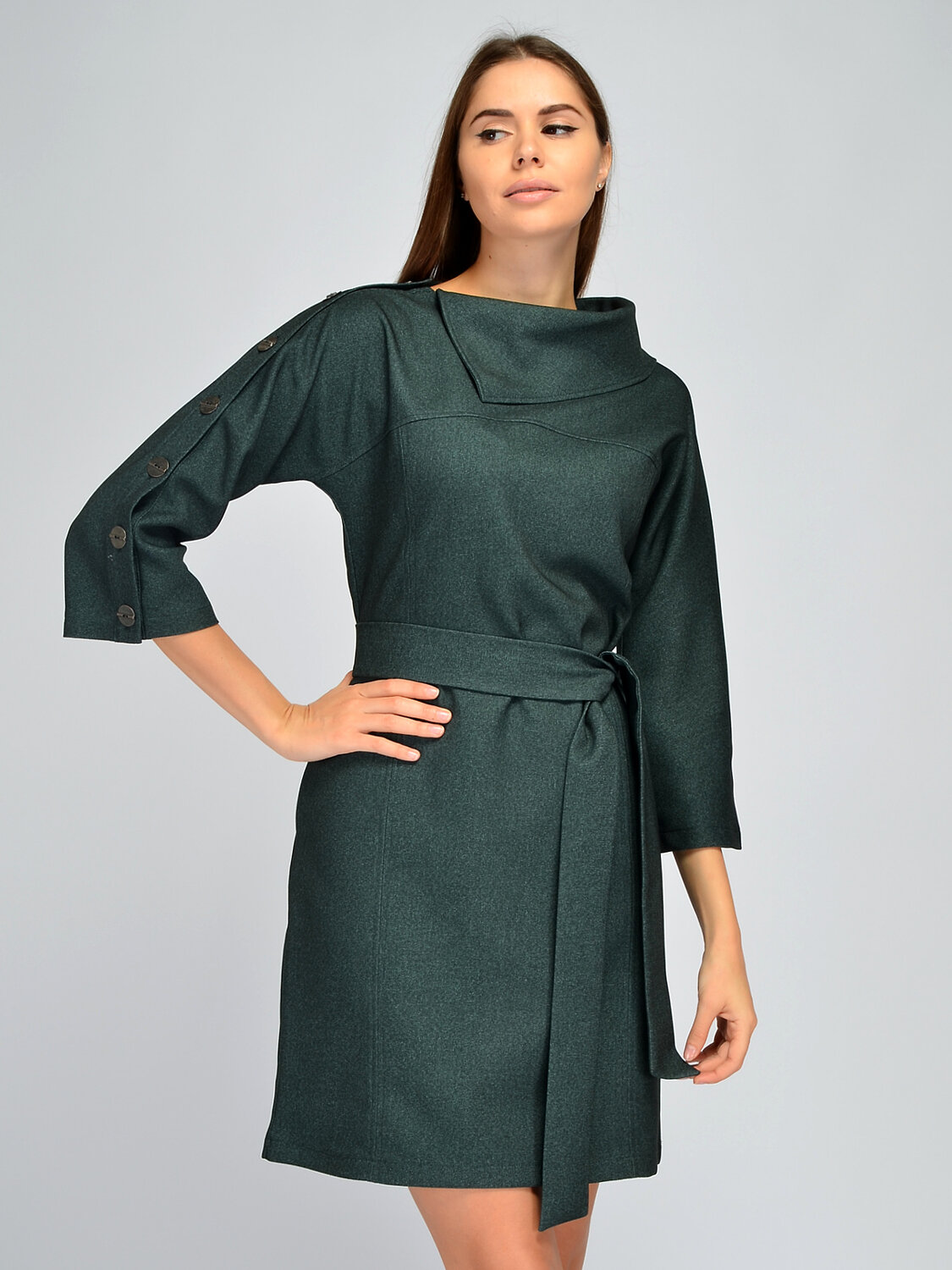 Оригинальное платье мини поможет создать элегантный образ для работы, учебы или торжественных мероприятий. Платье выполнено из качественной плотной ткани, которая сохранит свой первоначальный вид после многих стирок. Модель имеет укороченные рукава три четверти. Свободные рукава не облегают руки и скрывают возможные недостатки. Короткое платье застегивается на пуговицы, которые проходят по рукаву, что придает изюминку всему образу. Осеннее платье имеет изящный фантазийный воротник асимметричного кроя, подчеркивая шею. Стильное платье комплектуется поясом в цвет изделия, акцентируя линию талии и создавая элегантный силуэт. Свободный крой платья может скорректировать нюансы фигуры. По бокам располагаются практичные карманы, делая модель актуальной и современной. Приталенное платье выше колена подойдет как взрослым женщинам, так и молодым девушкам. Базовая модель подойдет для повседневной носки, деловых встреч или праздников. Обувь желательно выбирать на высоком ходу, чтобы добавить образу женственности и подчеркнуть длину ног.