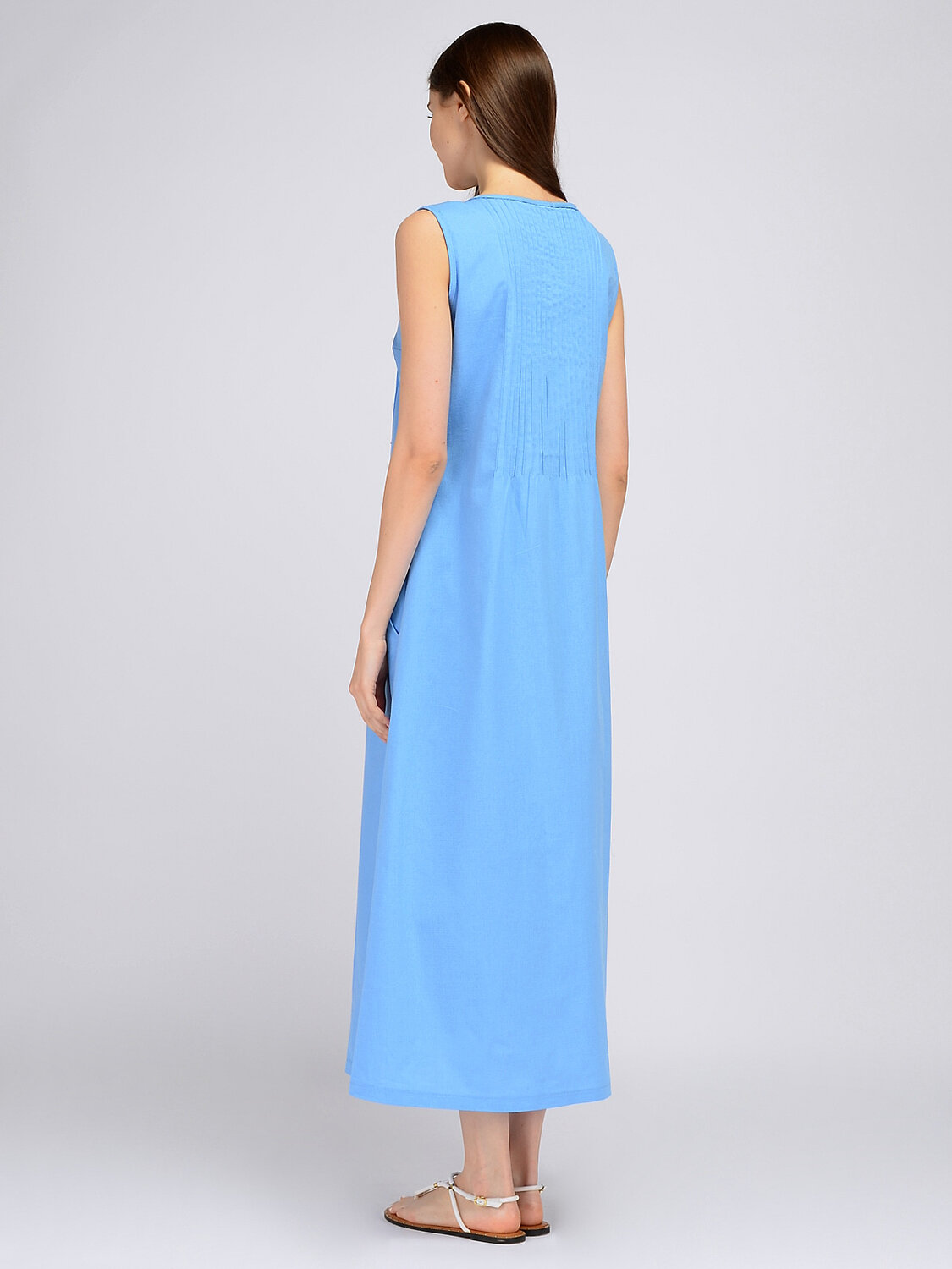 Платье макси без рукавов.Полуприлегающее платье без рукавов - идеальная летняя модель. В составе платья лён, благодаря которому Вы будете чувствовать себя максимально комфортно в жаркое время года. На спинке и полочке расположены декоративные защипы до линии талии. А для удобства современной девушки на платье предусмотрены карманы в шве Без отделки горловины. Без рукава. Без застёжки. Длина макси. Крой прямой. Карманы в шве. Платье женское полуприлегающего силуэта без рукавов. На спинке и полочке защипы до линии талии. В боковых швах карманы. Рекомендована стирка при температуре не более 30С.Лёгкое летнее платье без рукава Вы сможете надеть летом и в офис, и на прогулку, и на свидание. Надев джинсовку и спортивную обувь на низком ходу и завязав высокий хвост, получится комфортный образ в стиле кэжуал. А чтобы завершить романтичный образ, наденьте босоножки, распустите волосы и при необходимости накиньте на плечи палантин.