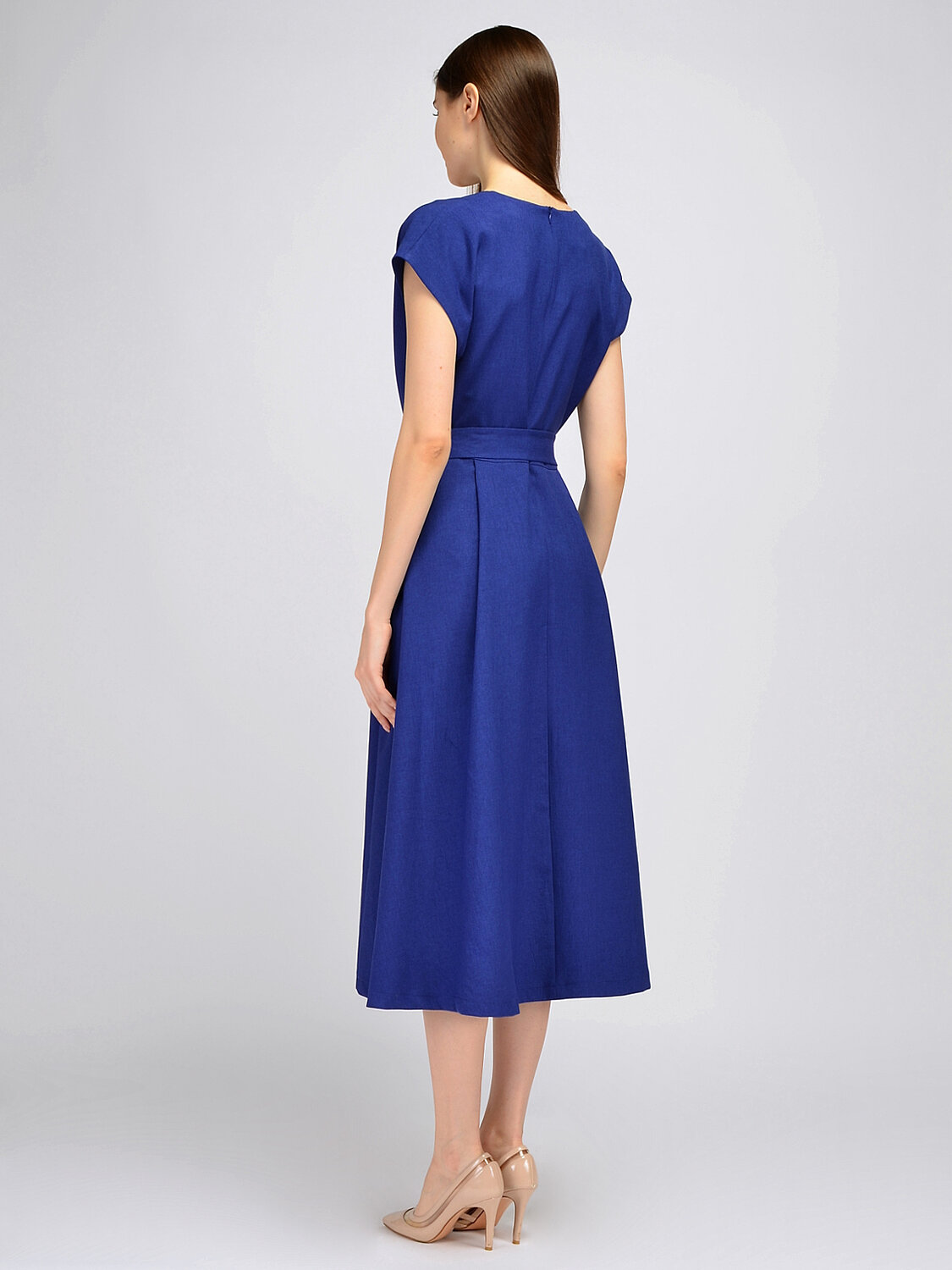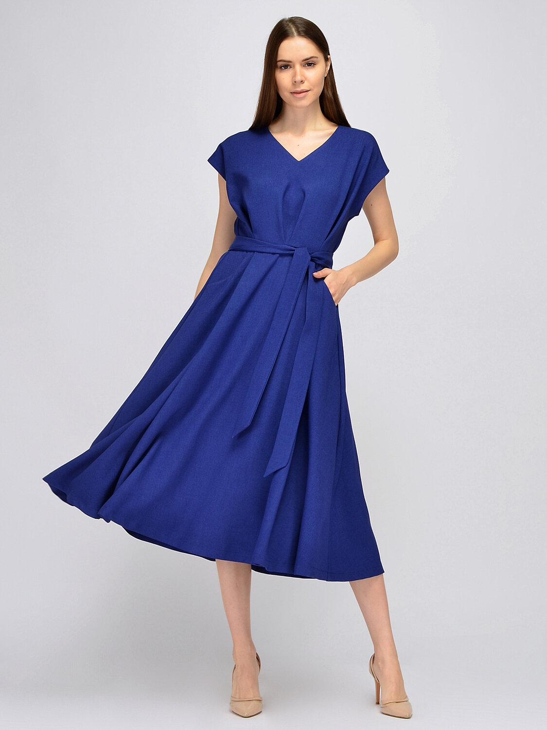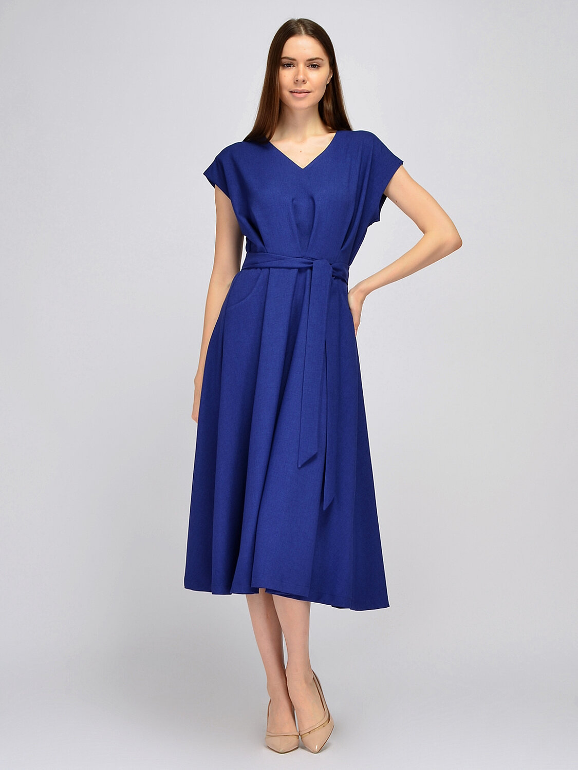 Платье миди с поясом. Если Вы ищете элегантное летнее платье на выход или на работу, обратите внимание на платье миди с акцентным поясом. Деликатный V-образный вырез приоткрывает ключицу, а струящаяся ткань платья будет притягивать взгляды к Вашей походке. На платье миди предусмотрены удобные втачные карманы. V-образный вырез. Без отделки горловины. Рукава короткие. Рукава цельнокроеные. Комплектация пояс. Вид застежки молния. Декоративные элементы складки, карманы. Карманы втачные. Длина миди. Крой приталенный. Рекомендована стирка при температуре не более 30С. Приталенное платье миди с комплектным поясом поможет создать нужное настроение на торжественном мероприятии или на романтической встрече. Завершите утонченный образ обувью на каблуке, небольшой сумочкой на тонком ремешке и лаконичными украшениями.