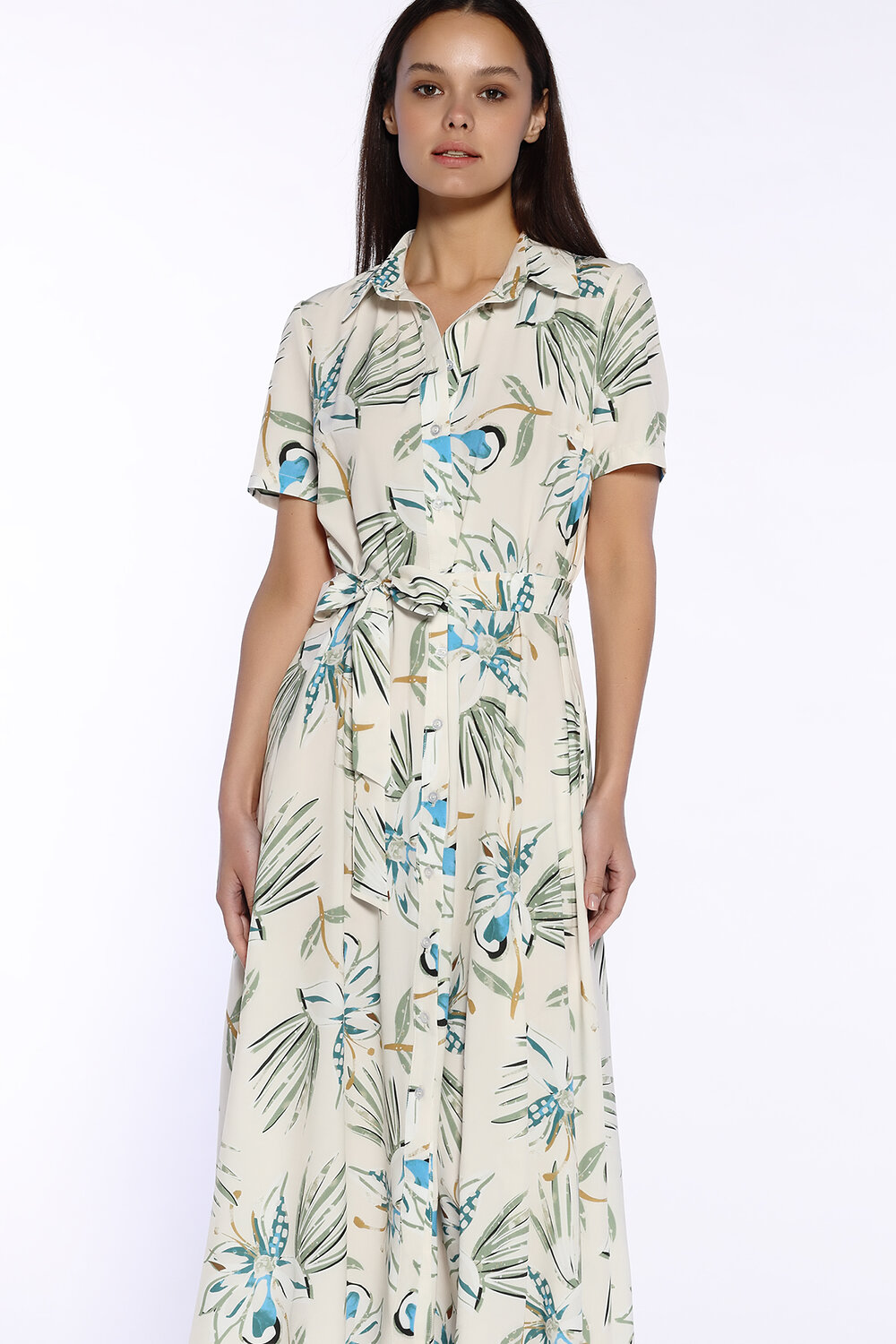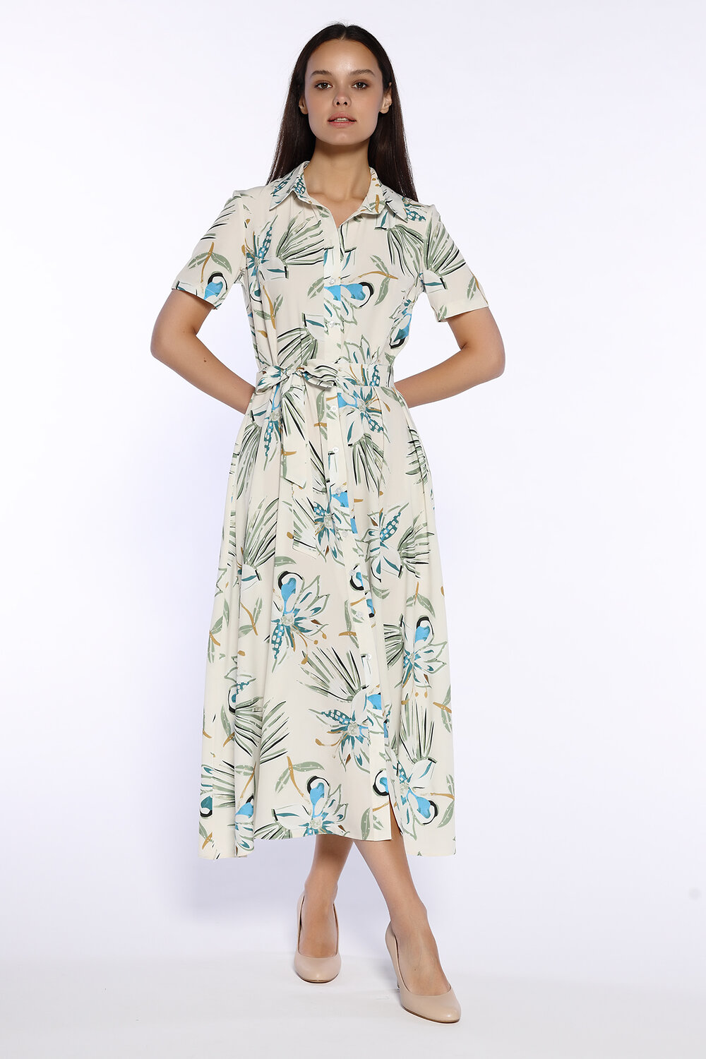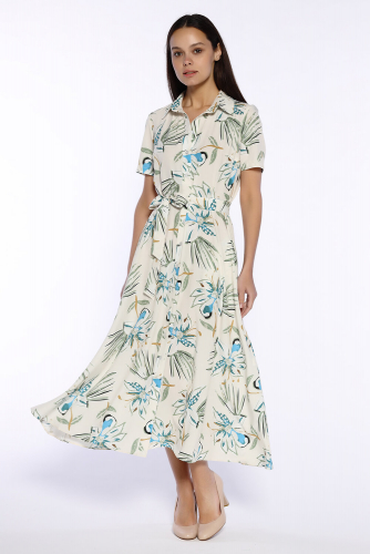 Шелковистое платье рубашка станет неотъемлемой частью летнего гардероба. Платье миди выполнено из легкой струящейся ткани в нарядных расцветках. Вы будете чувствовать себя комфортно даже в жаркую погоду. У платья классический отложной воротник, планка с застежкой на пуговицы по всей длине. У платья халат аккуратные короткие рукава, плечи закрыты. К платью прилагается комплектный пояс в цвет, который завязывается на талии и помогает смоделировать изящный женственный силуэт. Нарядное изделие можно носить каждый день в офис, на работу или прогулку или взять с собой на отдых на море, в отпуск, носить на пляже. Повседневное платье можно трансформировать в праздничный образ, если добавить к нему обувь на каблуке и соответствующие яркие аксессуары. Идеальный свободный фасон будет прекрасно смотреться на любой фигуре. Эффектная легкая модель подойдет для варианта платья на выпускной. А силуэт с широкой юбкой красиво струиться при ходьбе и придает воздушности походке. Базовое летнее платье с карманами подойдет и взрослым женщинам, и молодым девушкам. Каждая будет выглядеть элегантно и чувствовать себя уверенно.