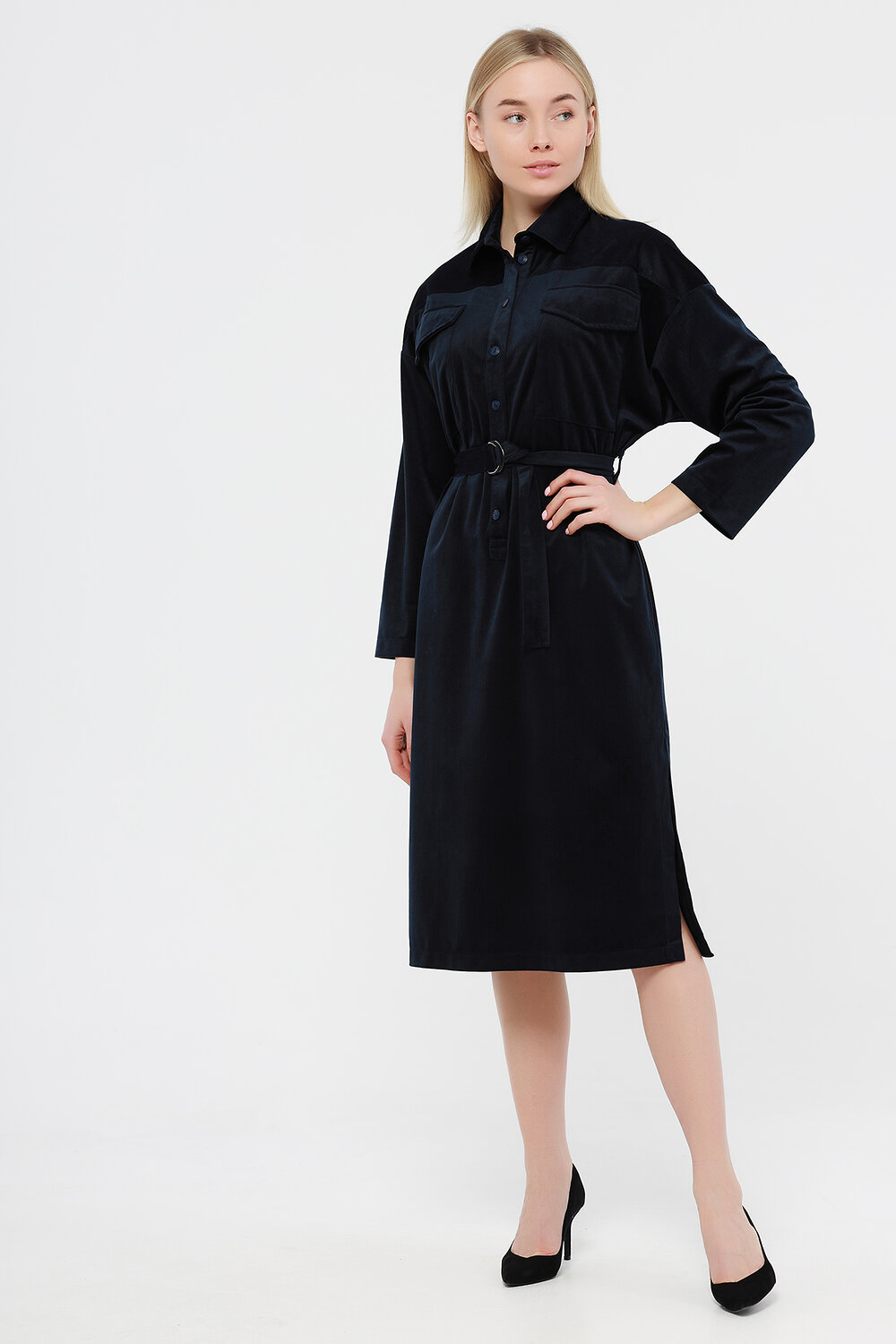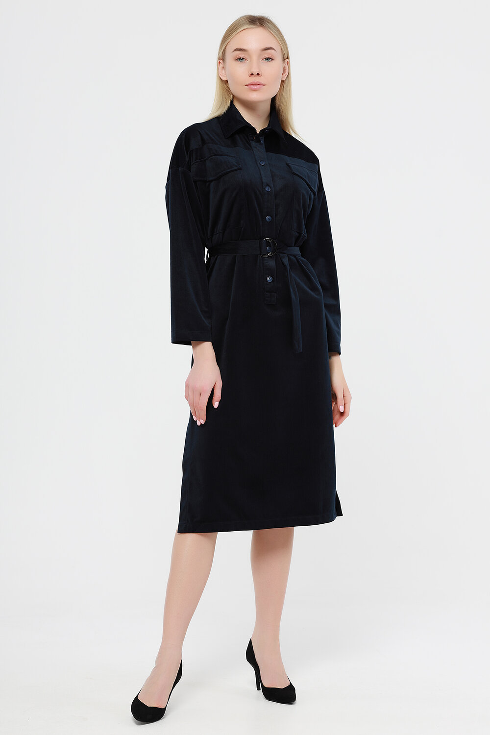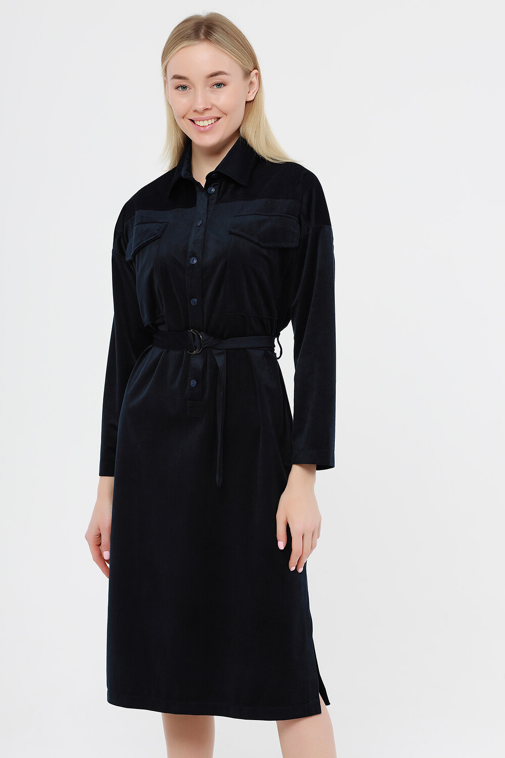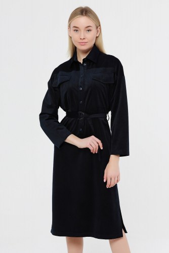 Платье-рубашка женское свободного силуэта. Рукав втачной. На полочке накладные карманы с клапанами и планка с застежкой на пуговицы. По боковым швам разрезы. Платье дополнено поясом. Платье - рубашку можно сочетать с любой обувью - кроссовки, туфли, сапоги.