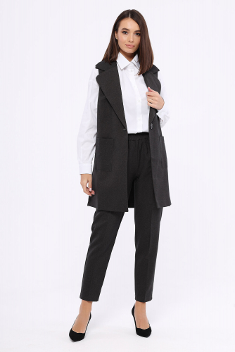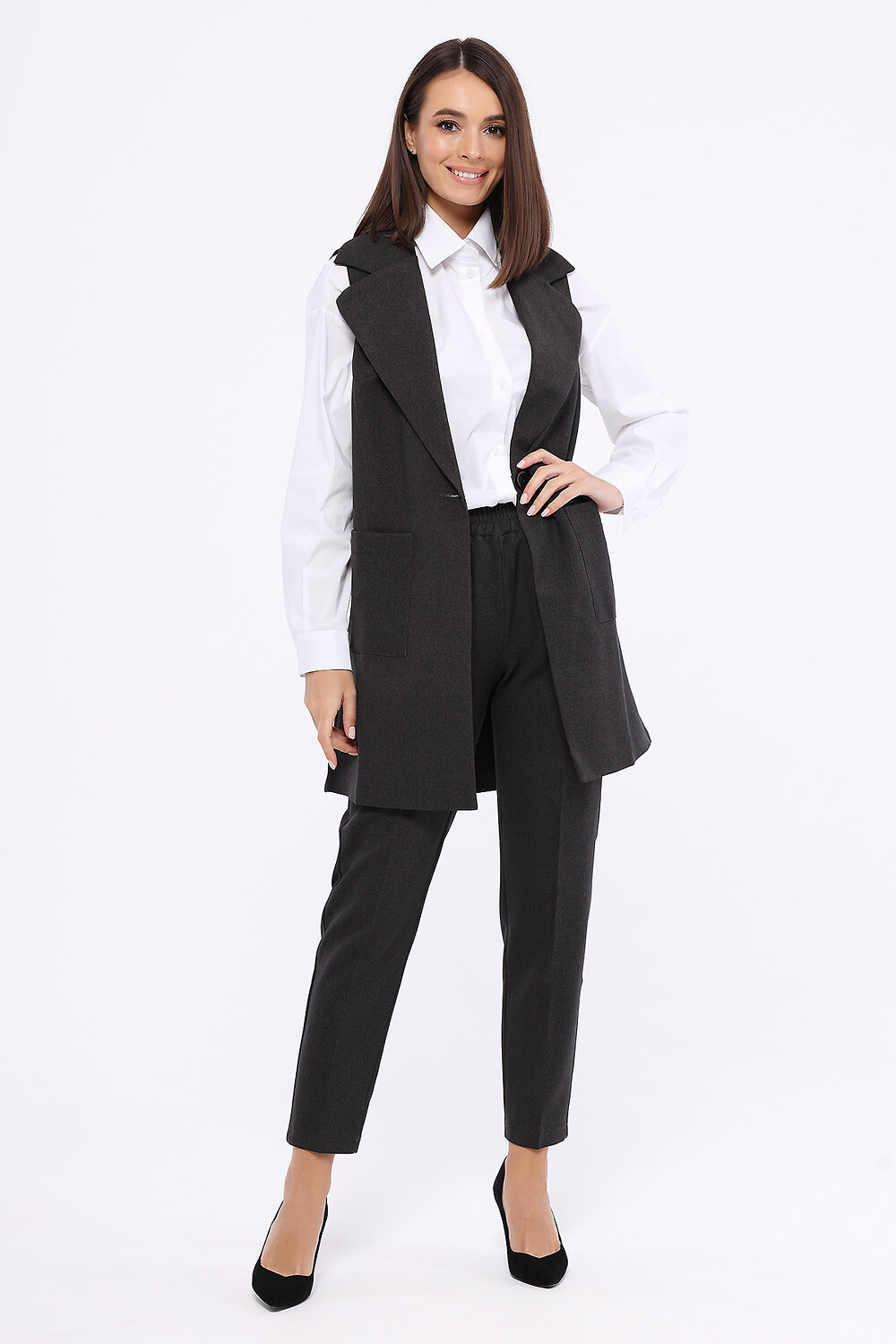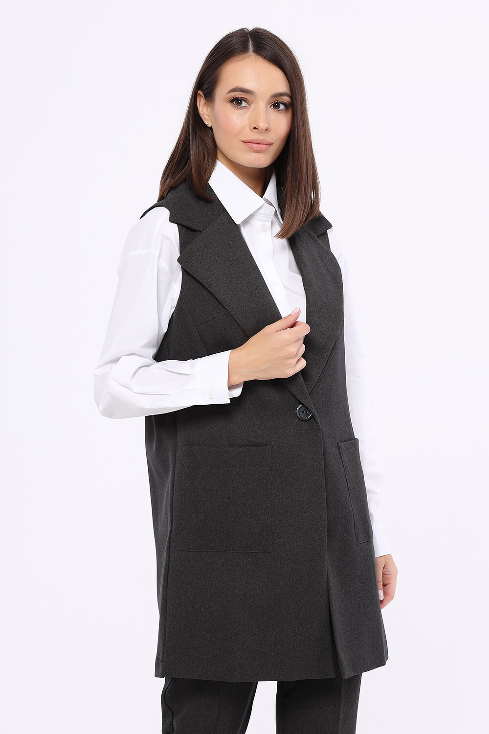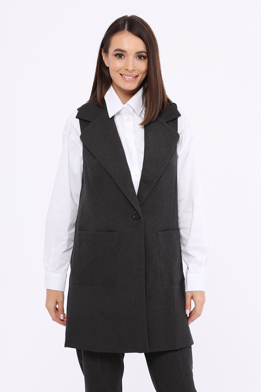 Удлинённый жакет без рукавов.Жакет прямого кроя без рукавов найдёт своё место в гардеробе современной девушки. Классический фасон с отложным воротником дополнит как строгий, так и повседневный образы. На передней части жакета расположены два накладных кармана.V-образный вырез. Отделка горловины - воротник.Воротник отложной. Без рукава. Вид застёжки - пуговицы. Крой прямой. Карманы накладные. Рекомендована стирка при температуре не более 30С.Жакет с отложным воротником идеально сочетается с укороченными брюками на резинке из нашей коллекции, которые выполнены из идентичного материала. Создай свой деловой образ, дополнив жакет брюками, блузкой с длинным рукавом и закрытой обувью. Или заверши городской образ, поддев под жакет футболку, худи или свитер оверсайз, удобные брюки или джинсы и обувь на низком ходу.