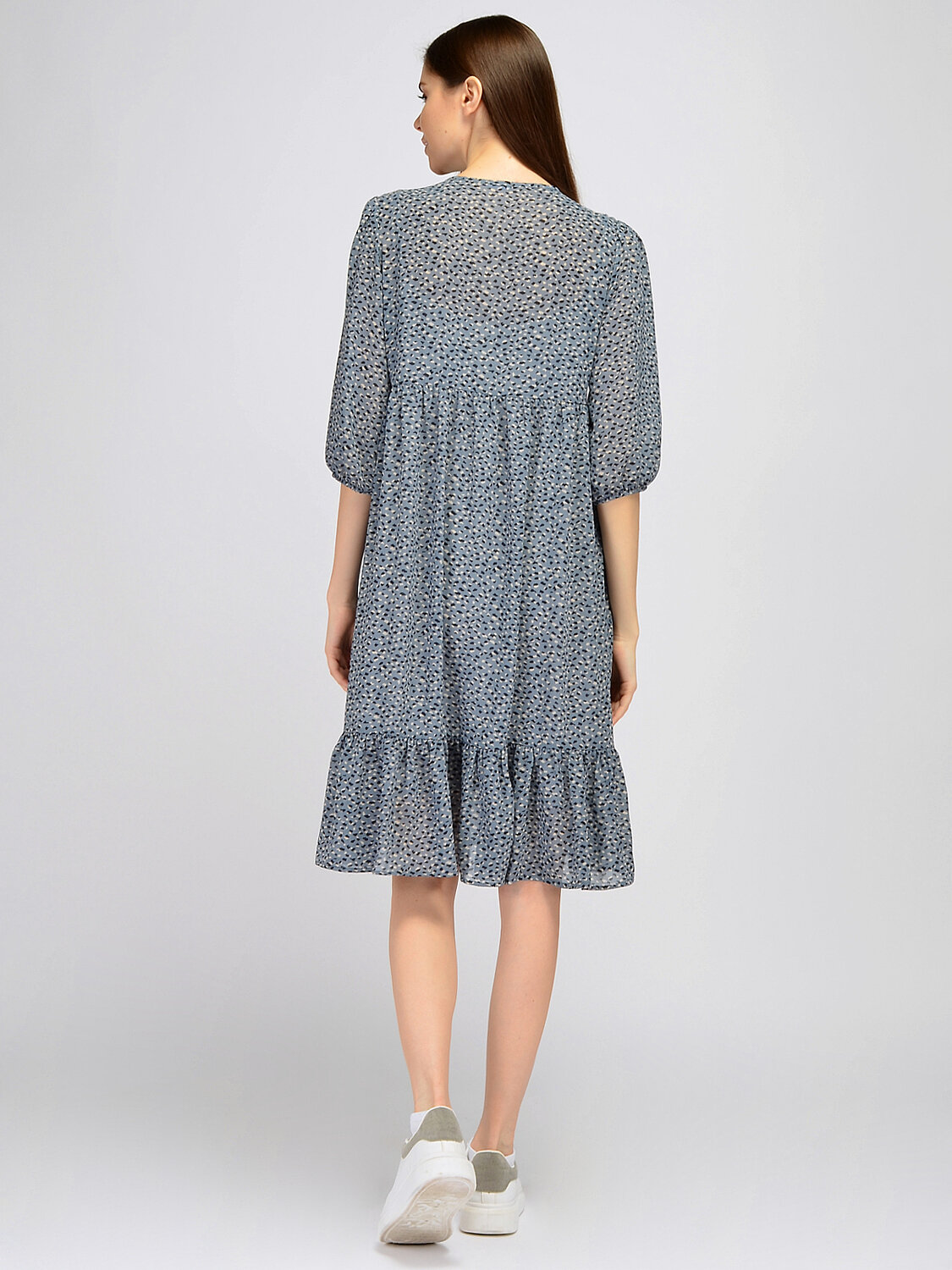 В составе платья полиэстер 100%. Вырез горловины - круглый. Без отделки горловины. Рукава до локтя. Без застёжки. Декоративный элемент - оборки. Длина миди. Подкладка - нижнее платье. Крой широкий. Модель платья - прямое. Покрой свободный. Без карманов. Рукав втачной. Рекомендована стирка при температуре не более 30С.
