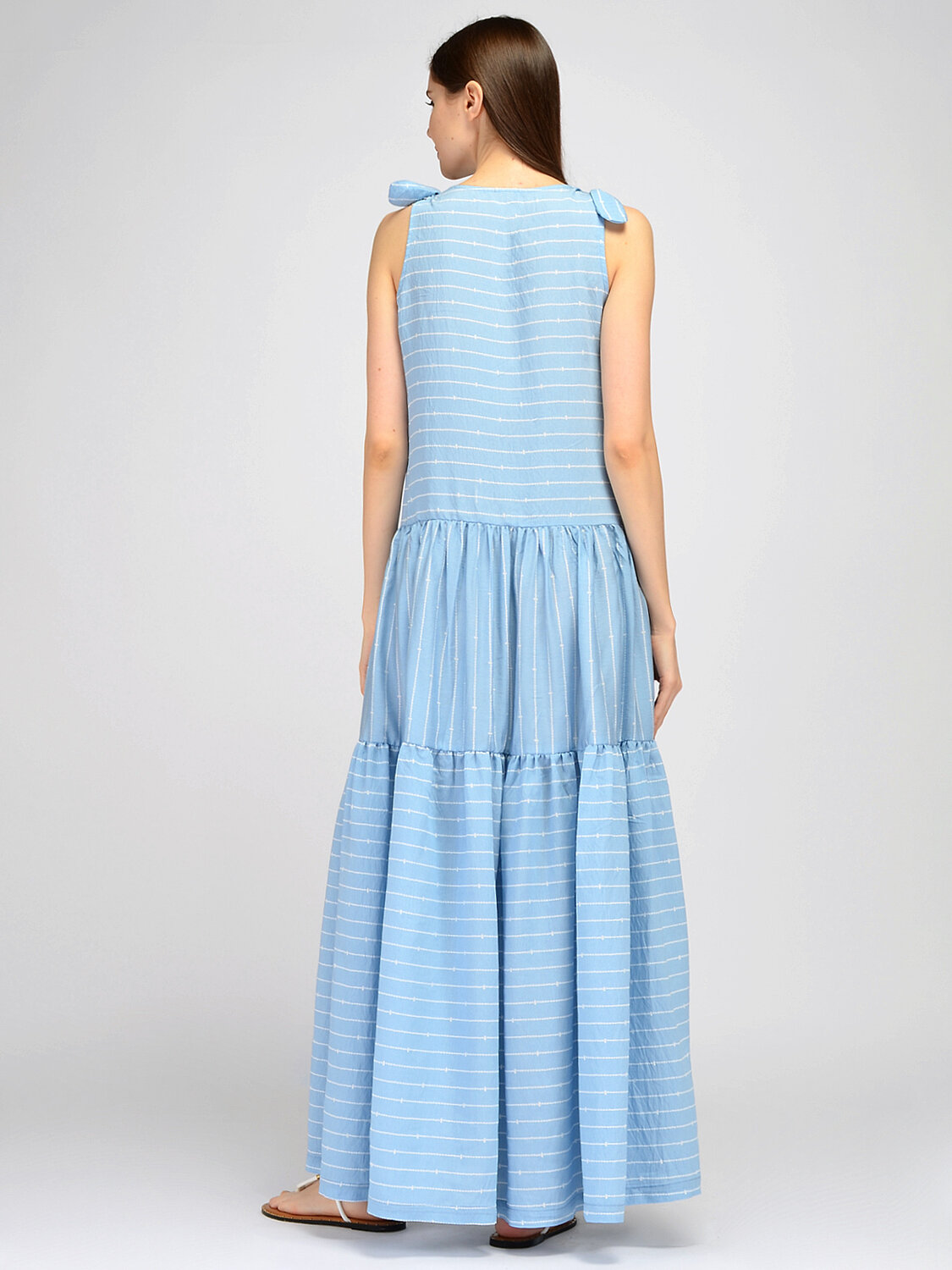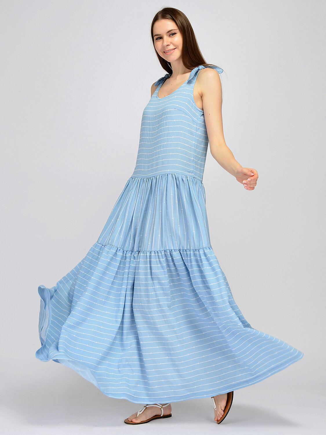 Платье макси без рукавов. Широкое платье макси без рукавов подарит ощущение свободы и легкости в жаркое время года. Лаконичный фасон выполнен в нежных современных расцветках, которые идеально подойдут для летнего гардероба. Платье макси без рукавов с завязками на плечах позволит Вам чувствовать себя комфортно и женственно на прогулке и на отдыхе. А широкая двухъярусная юбка с воланами придает образу игривости и романтичности. Вырез горловины круглый. Без отделки горловины. Без рукава. Без застежки. Длина макси. Крой широкий. Конструктивный элемент волан. Без карманов. Покрой свободный. Рекомендована стирка при температуре не более 30С. Платье макси с округлым вырезом создает свежий летний образ. Дополните его удобной открытой обувью на низком ходу или на каблуке, сумкой шоппером и широкополой шляпой. Заверши образ, подобрав подходящие аксессуары. Если вечером станет прохладно, накиньте на плечи яркий однотонный палантин или джинсовку.