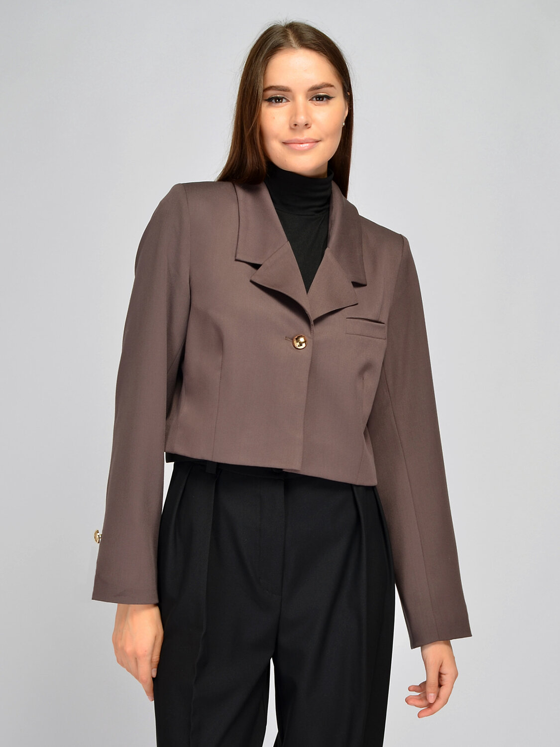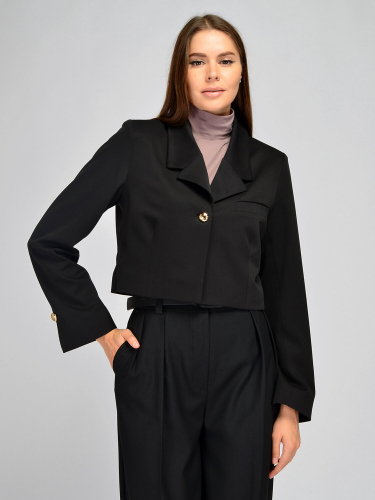 Изящный укороченный жакет станет эффектным дополнением Вашего гардероба. Классический отложной воротник и V-образный вырез горловины визуально вытянут линию шеи. На изделии предусмотрены вертикальные вытачки. На полочке находится аккуратный карман. Главной отличительной особенностью модели являются эффектные свободные рукава с разрезом и золотистой пуговицей. Короткий теплый жакет выполнен из приятной плотной ткани, благодаря чему изделие будет радовать Вас не один сезон! Прямой крой до линии талии скорректирует пропорции фигуры, визуально удлиняя нижнюю часть тела и добавляя несколько дополнительных сантиметров к росту. Носите жакет с застегнутой пуговицей или нараспашку. Базовая вещь придется по вкусу и взрослым женщинам, и молодым девушкам, и даже подросткам, чтобы создать модный образ для школы. Вы можете носить модель на работу, в офис, на праздники и культурные мероприятия. Дополните образ однотонной блузкой, рубашкой, топом или водолазкой, строгими брюками или юбкой, аккуратной обувью на высоком ходу и подходящими украшениями и аксессуарами.