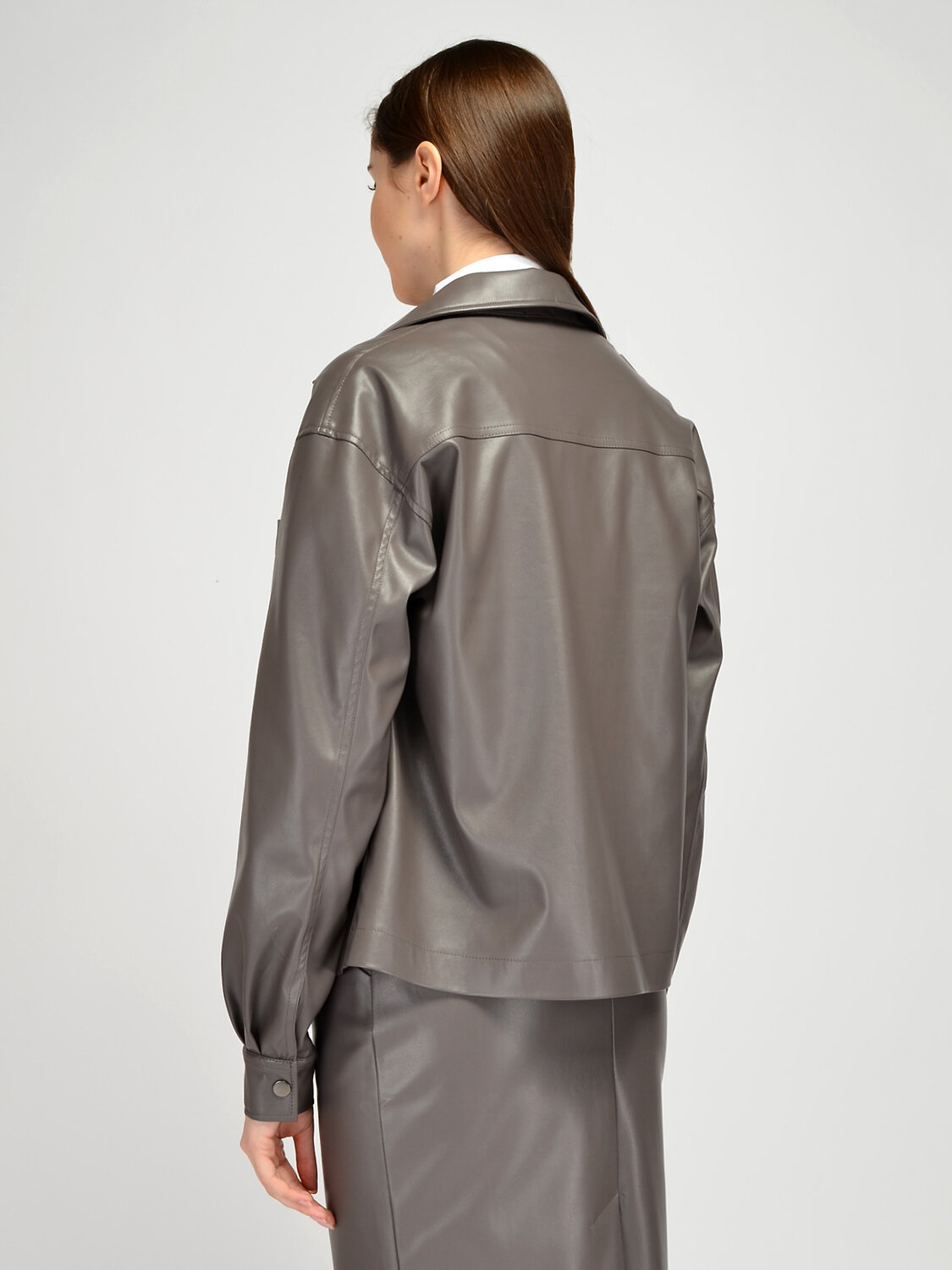 Стильный жакет из экокожи станет ярким дополнением Вашего гардероба. Жакет оверсайз рубашечного фасона имеет отложной воротник. Классический силуэт свободного кроя имеет спущенную линию плеча и не облегает фигуру. Застегивается кожаная рубашка на кнопки. На полочке, спереди, находится накладной карман. Длинные рукава на манжете имеют широкий крой и не стесняют движений. Теплый жакет с длинными рукавами выполнен из качественной экокожи, а это значит, он будет радовать Вас не один сезон. Куртка из экокожи впишется как в повседневные, так и более строгие образы. Кожаный бомбер подчеркнет Вашу индивидуальность и станет одним из самых любимых элементов стиля. Модная кожаная рубашка оверсайз будет особенно уместна весной и осенью, а также ее можно надеть прохладным летним вечером или носить зимой. Универсальный базовый жакет из кожзама это тренд сезона, который будет уместен при любых обстоятельствах. Дополните деловой образ рубашкой, юбкой карандаш и ботильонами. Для более расслабленного, городского образа выбирайте футболку, джинсы и удобную обувь на плоском ходу.