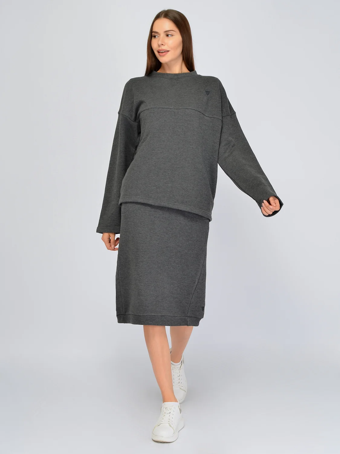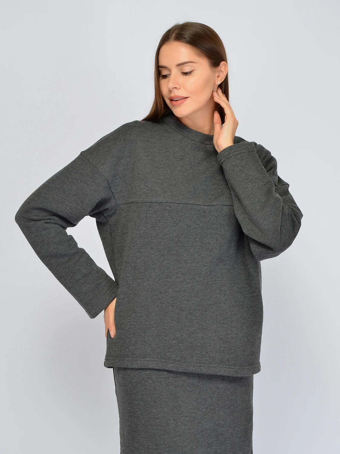 Современный свитшот оверсайз с воротником-стойкой прекрасно впишется в спортивный и повседневный стиль. У кофты удобные длинные рукава со спущенной линией плеча. На полочке вышит фирменный логотип в тон изделия. Свободный крой свитшота не облегает фигуру и поможет скрыть возможные недостатки в области живота. Объемный фасон по достоинству оценят будущие мамы. На уровне груди проходит горизонтальная строчка, придавая изделию оригинальности. Практичная длина позволяет носить изделие как навыпуск, так и заправлять его за пояс, чтобы подчеркнуть фигуру. Свитшот оверсайз выполнен из высококачественной хлопковой ткани, которая обладает высокой износостойкостью, сохраняет первоначальный вид после множества стирок. Натуральный материал обеспечит Вам максимальный комфорт и позволит коже дышать. Прямая спортивная кофта идеально сочетается с комплектной юбкой в цвет из нашей коллекции, а также с другими спортивными изделиями или джинсами. Качественная, удобная и современная вещь подарит Вам уверенность в себе. Актуальный свободный свитшот придется по вкусу тем, кто ведет активный образ жизни и выбирает практичные и удобные вещи на каждый день. Плотный теплый свитшот будет радовать Вас не один сезон!