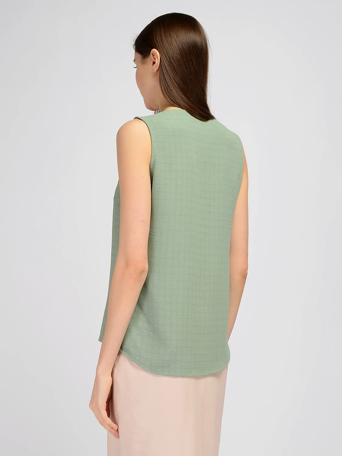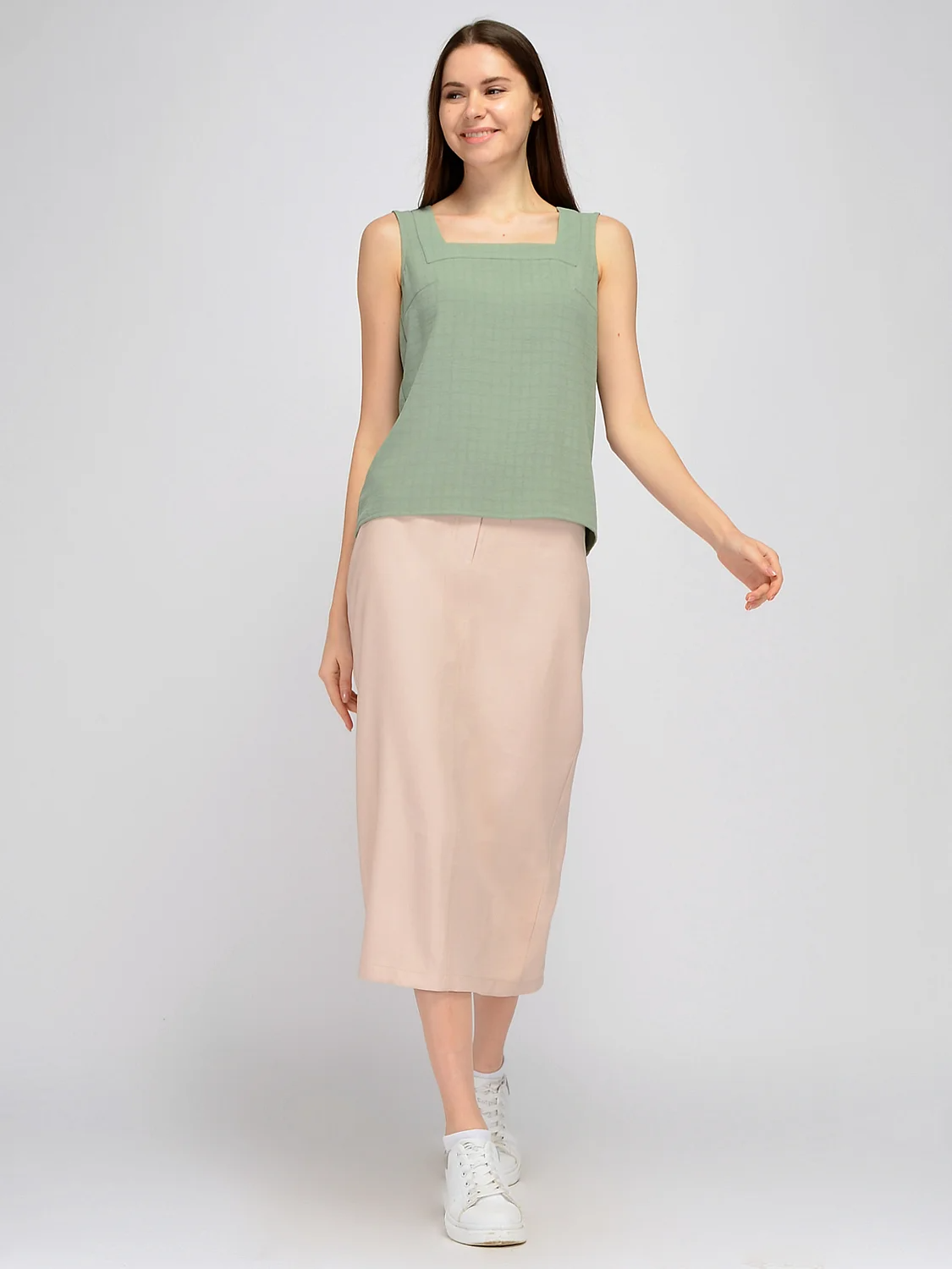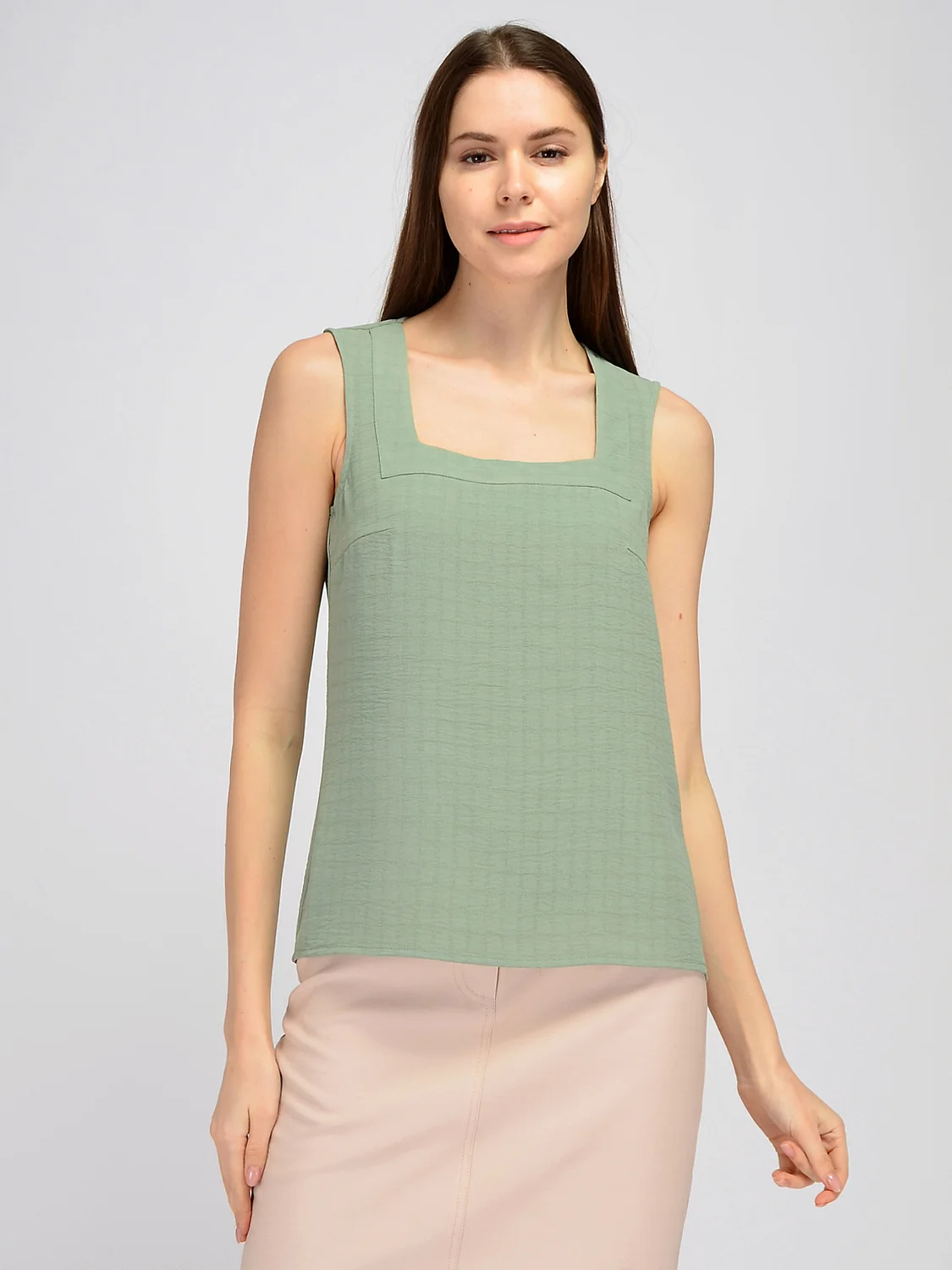Топ прямого кроя с квадратным вырезом. Базовый топ с нестандартным квадратным вырезом выгодно дополнит летний гардероб. Горловина топа оформлена деликатной строчкой, придавая ему строгости. Для удобной посадки в груди на топе предусмотрены вытачки. В свободном топе без рукавов Вы будете чувствовать себя комфортно в жаркое время года. Вырез горловины квадратный. Без отделки горловины. Без рукавов. Крой прямой. Рекомендована стирка при температуре не более 30С. Универсальный топ сочетается с различными элементами гардероба. Однотонный лаконичный фасон прекрасно подходит для создания офисного образа, если дополнить его классическими брюками или юбкой и закрытой обувью. А для создания городского образа в стиле кэжуал подберите джинсы, шорты или юбку и удобную обувь. Носите топ навыпуск или заправленным за пояс.