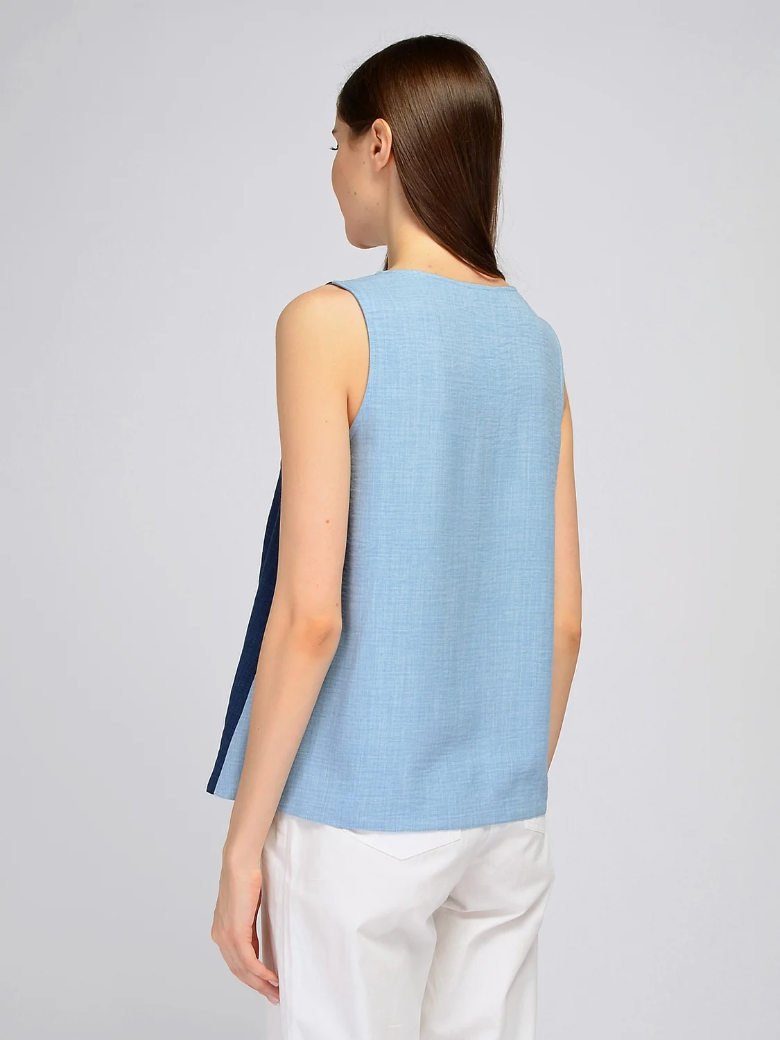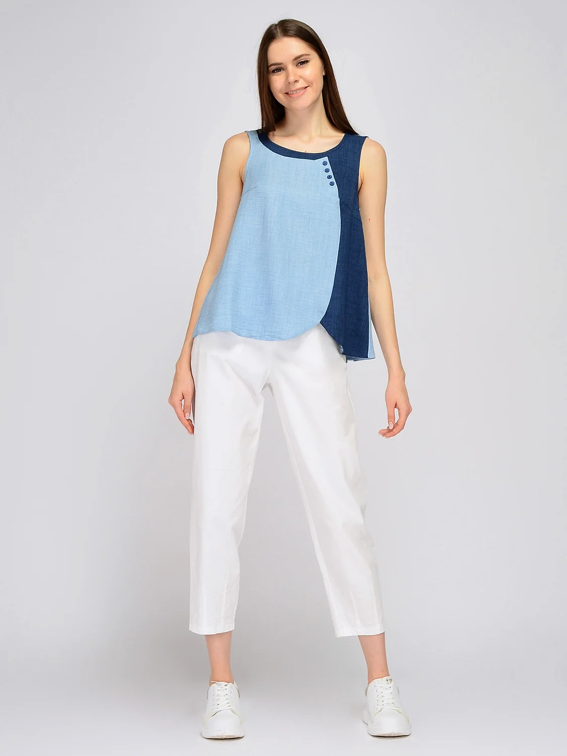 Летний двухцветный топ. Эффектный топ свободного фасона выигрышно дополнит различные летние образы. Топ состоит из двух цветовых сочетаний, лаконично перекликающихся между собой. На передней части топа расположены декоративные пуговицы контрастного цвета, придавая образу изюминку. Вырез горловины округлый. Без отделки горловины. Без рукавов. Без застежки. Декоративный элемент пуговицы. Конструктивный элемент фигурный низ. Крой расклешенный к низу. Покрой свободный. Рекомендована стирка при температуре 30С. Выбирайте расклешенный к низу топ для офисного образа, на прогулку или на свидание. Завершите нужный стиль брюками или джинсами, шортами или юбкой и подходящими аксессуарами. Носите топ навыпуск или заправленным за пояс.