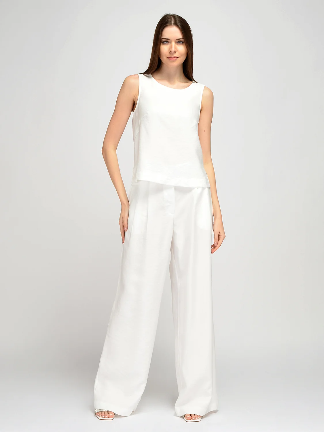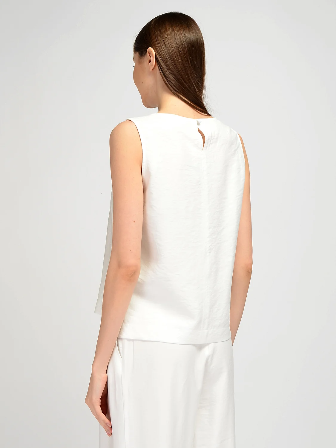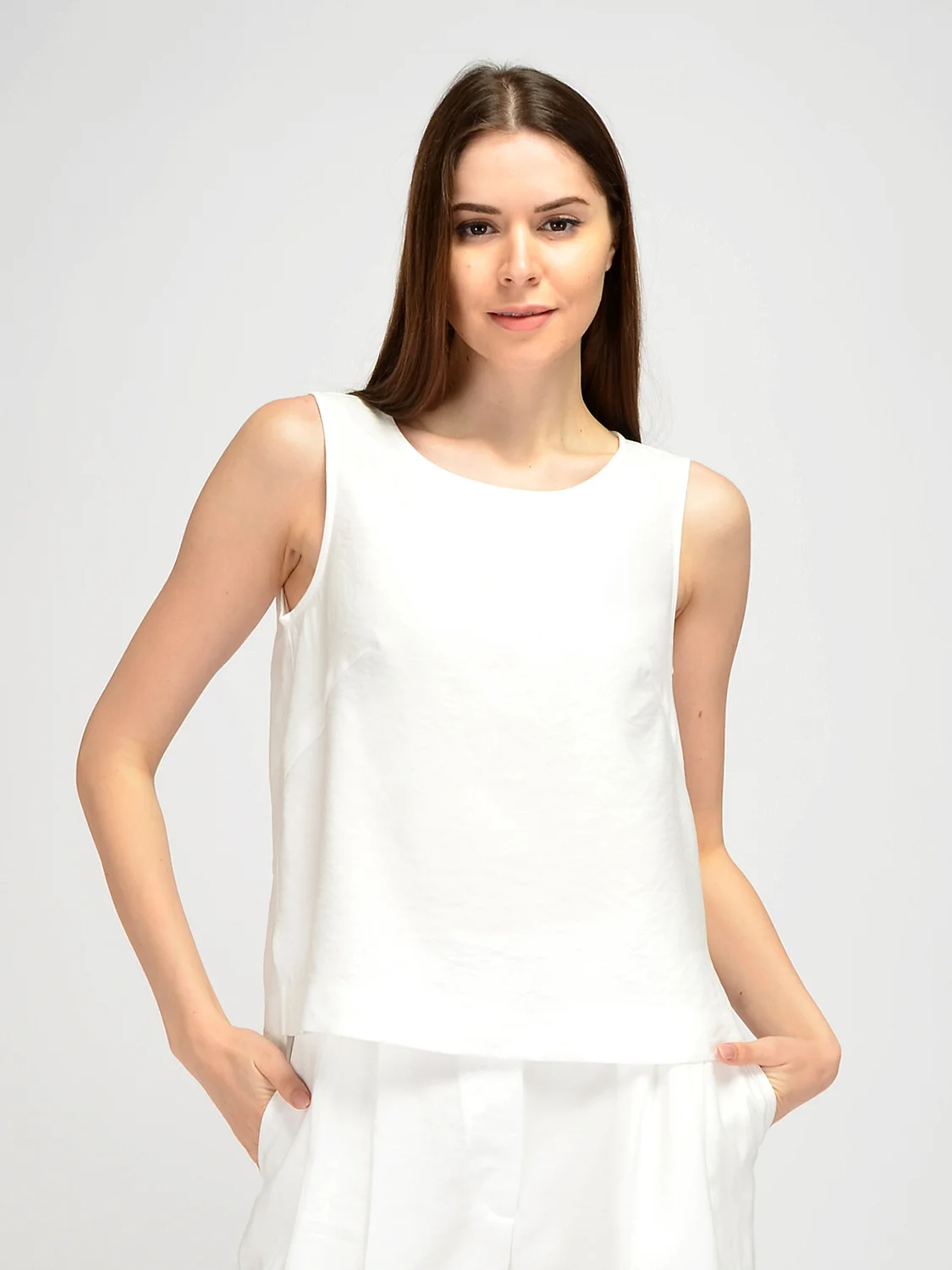 Свободный топ без рукавов идеально подойдет для весенних и летних образов. Прямой топ имеет округлый вырез горловины, подчеркивая ключицу и не выделяет зону декольте. Широкие бретели скрывают детали нижнего белья. Летний топ имеет асимметричную длину, спереди он немного короче, а по бокам располагаются небольшие разрезы. Топ имеет застежку в виду пуговицы с аккуратным разрезом капелька на спине. Базовый легкий топ выполнен из натурального дышащего материала, с большим процентом хлопка в составе. А это значит, что Вы будете чувствовать себя комфортно на протяжении всего дня, даже в жаркий летний день. Лаконичная модель подойдет как взрослым женщинам, так и молодым девушкам. Хлопковый топ прямого кроя впишется как в строгие образы, так и в праздничные и повседневные. Вы можете дополнить образ украшениями и аксессуарами на свой вкус. Топ из хлопка сочетается с классическими жакетами, брюками и юбками, джинсами. Вы можете носить топ навыпуск или заправленным за пояс. Дополните свой летний гардероб базовым топом, который сохранит свою актуальность на долгие годы.