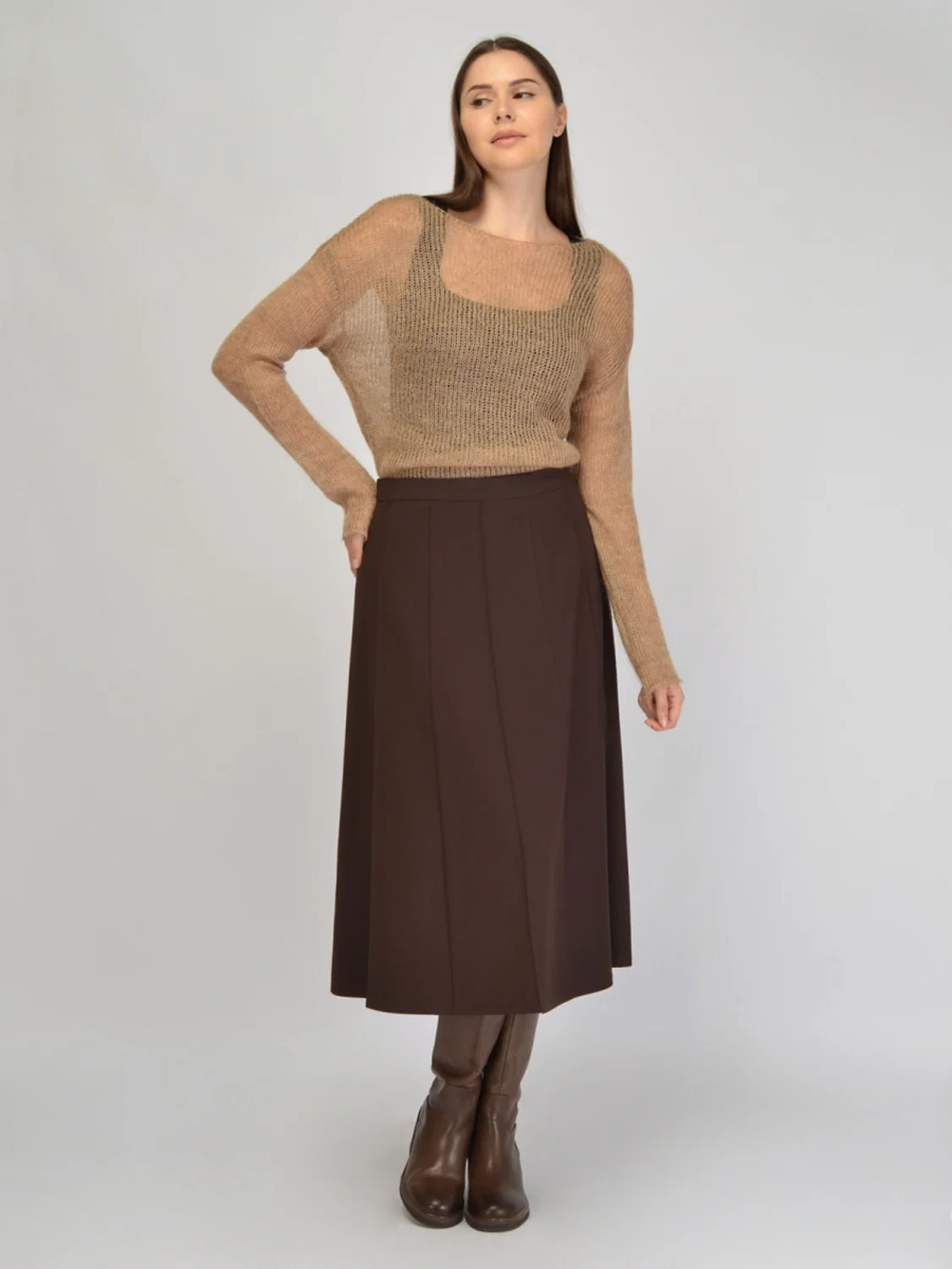 Теплая юбка миди в классическом стиле украсит Ваши повседневные и нарядные образы. Высокая посадка на талии моделирует гармоничные пропорции фигуры, а в сочетании с вертикальными вытачками визуально вытягивается силуэт и удлиняются ноги. Благодаря свободному крою трапеция юбка не облегает фигуру, скрывает возможные недостатки в области бедер, и ткань красиво струится при ходьбе. Застегивается юбка миди на потайную молнию. Модель имеет удобную и практичную подкладку. Базовая юбка в универсальных расцветках легко впишется в любой гардероб для осенне-зимнего сезона. Строгая юбка выполнена из приятной плотной ткани, которая практически не мнется и сохранит опрятный вид на протяжении всего дня. Дополните образ блузкой или джемпером и подберите обувь на высоком ходу. Теплая длинная юбка идеальна для офиса, а также для создания образа для культурных или праздничных мероприятий. Модель будет интересна и молодым девушкам, и дама постарше, даже в размере плюс сайз.
