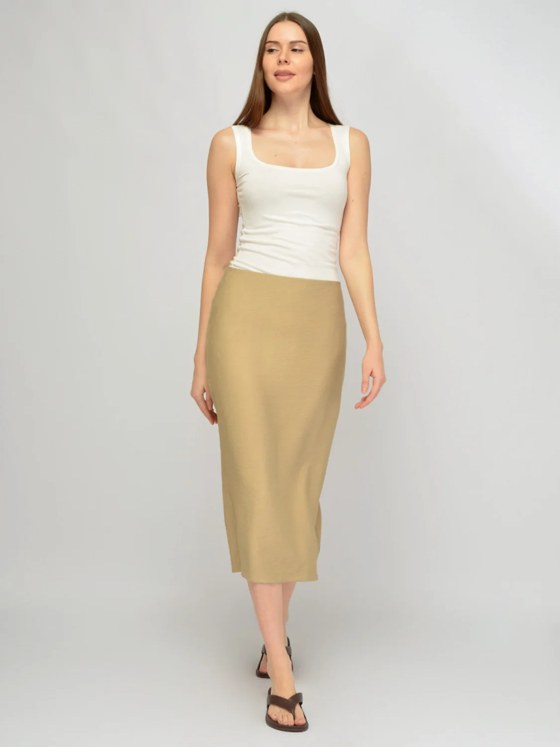 Длинная летняя юбка карандаш станет элегантным дополнением летнего гардероба модниц, которые предпочитают классический стиль в одежде. Средняя посадка визуально удлиняет верхнюю часть тела и создает гармоничные пропорции фигуры. Лаконичный фасон без декоративных деталей и карманов дополнен лишь изящной шлицей сзади. Шлица позволяет чувствовать себя более раскованно при ходьбе. Сзади на юбочке предусмотрены вертикальные вытачки, чтобы изделие прекрасно село на любую фигуру. Облегающий крой юбки миди подчеркнет изгибы фигуры и создаст запоминающийся образ. Юбка макси выполнена из приятной плотной ткани с большим процентом вискозы в составе, поэтому Вы будете чувствовать себя комфортно на протяжении летнего дня. Летняя облегающая юбка подойдет для офиса и деловых встреч, праздников и культурных событий. Дополните образ топом или блузкой, а также подберите удобную обувь на высоком ходу, чтобы выглядеть еще стройнее и женственнее.