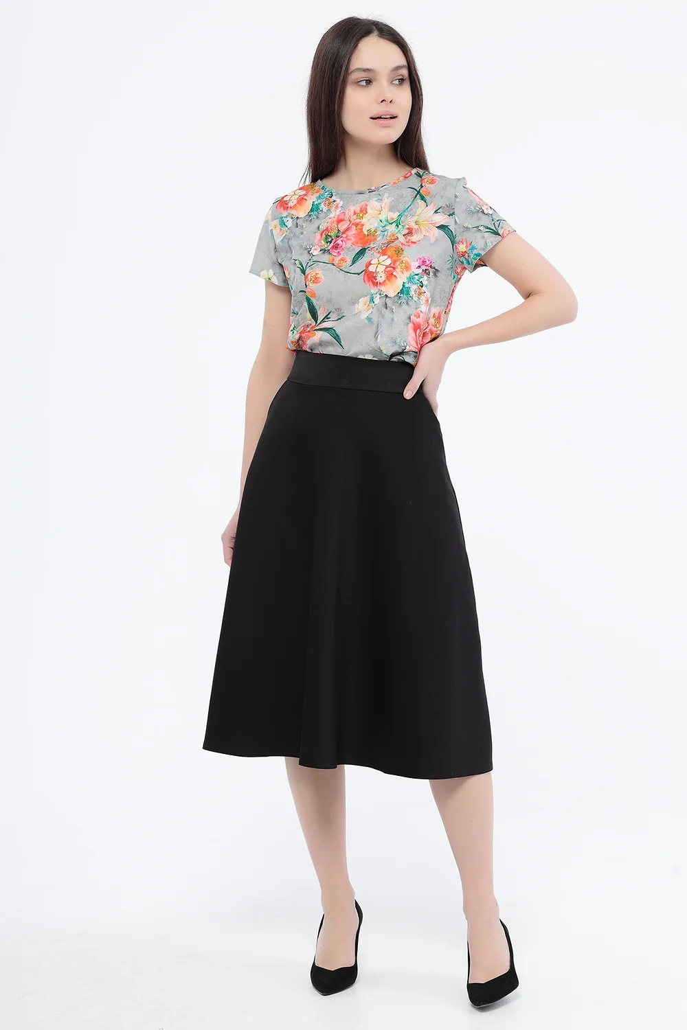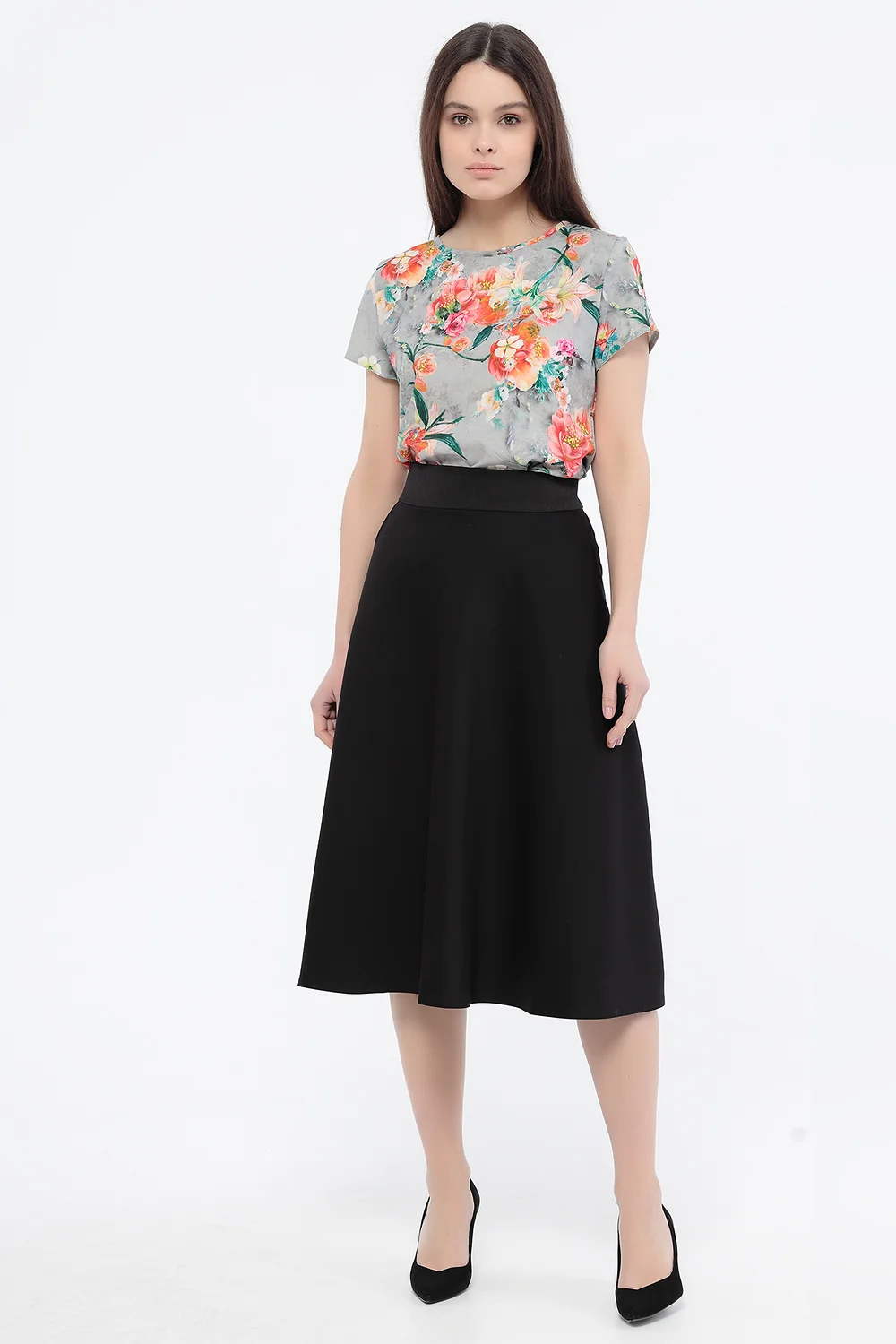 Юбка женская на кокетке клешеного силуэта. В боковых швах карманы. Изделие на подкладке.