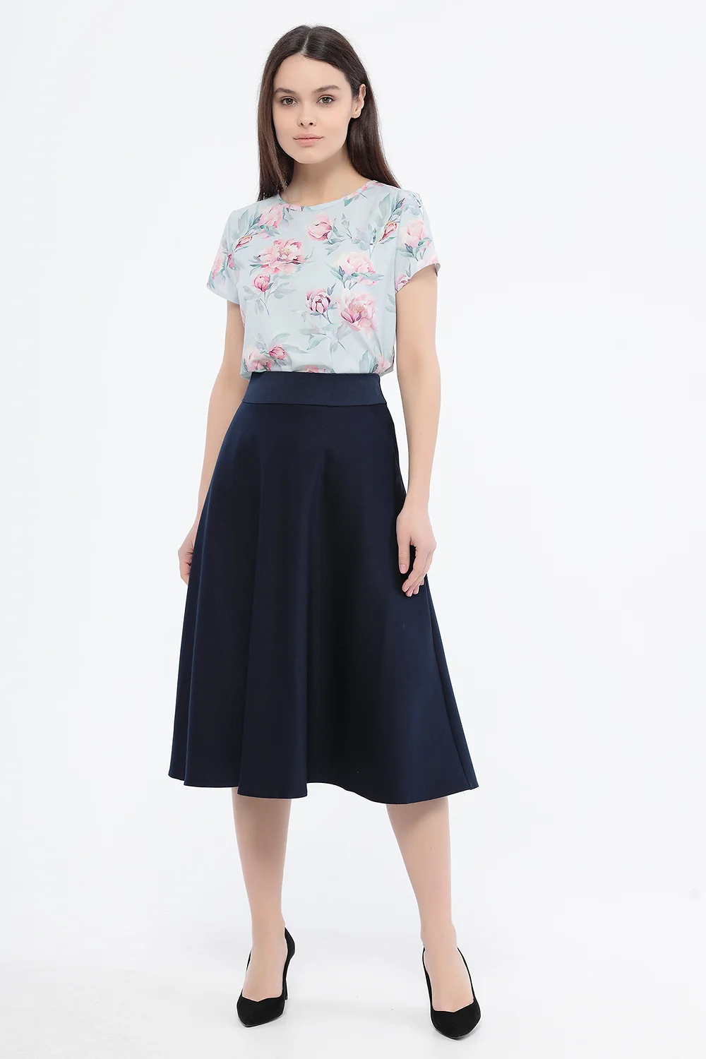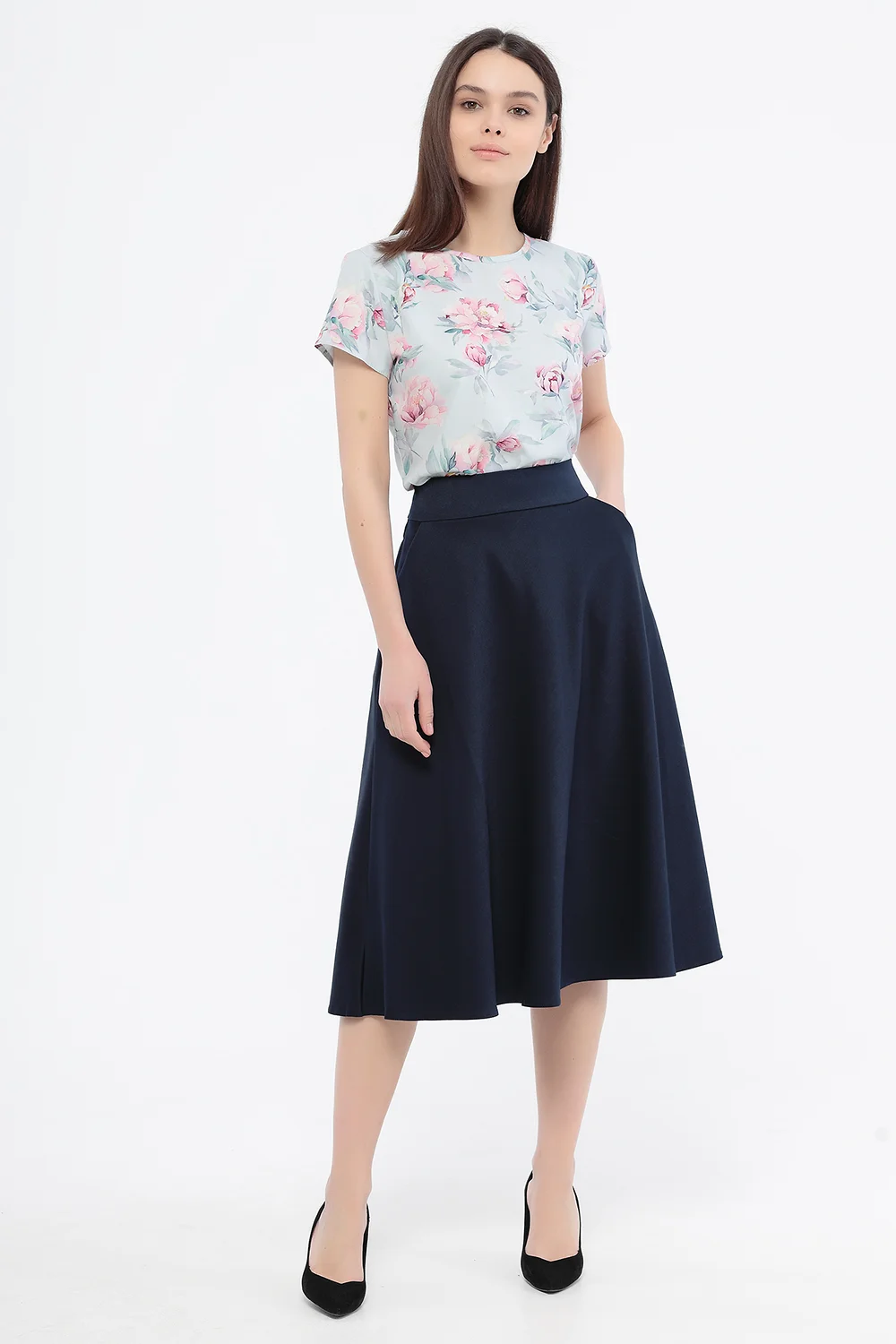 Юбка женская на кокетке клешеного силуэта. В боковых швах карманы. Изделие на подкладке.