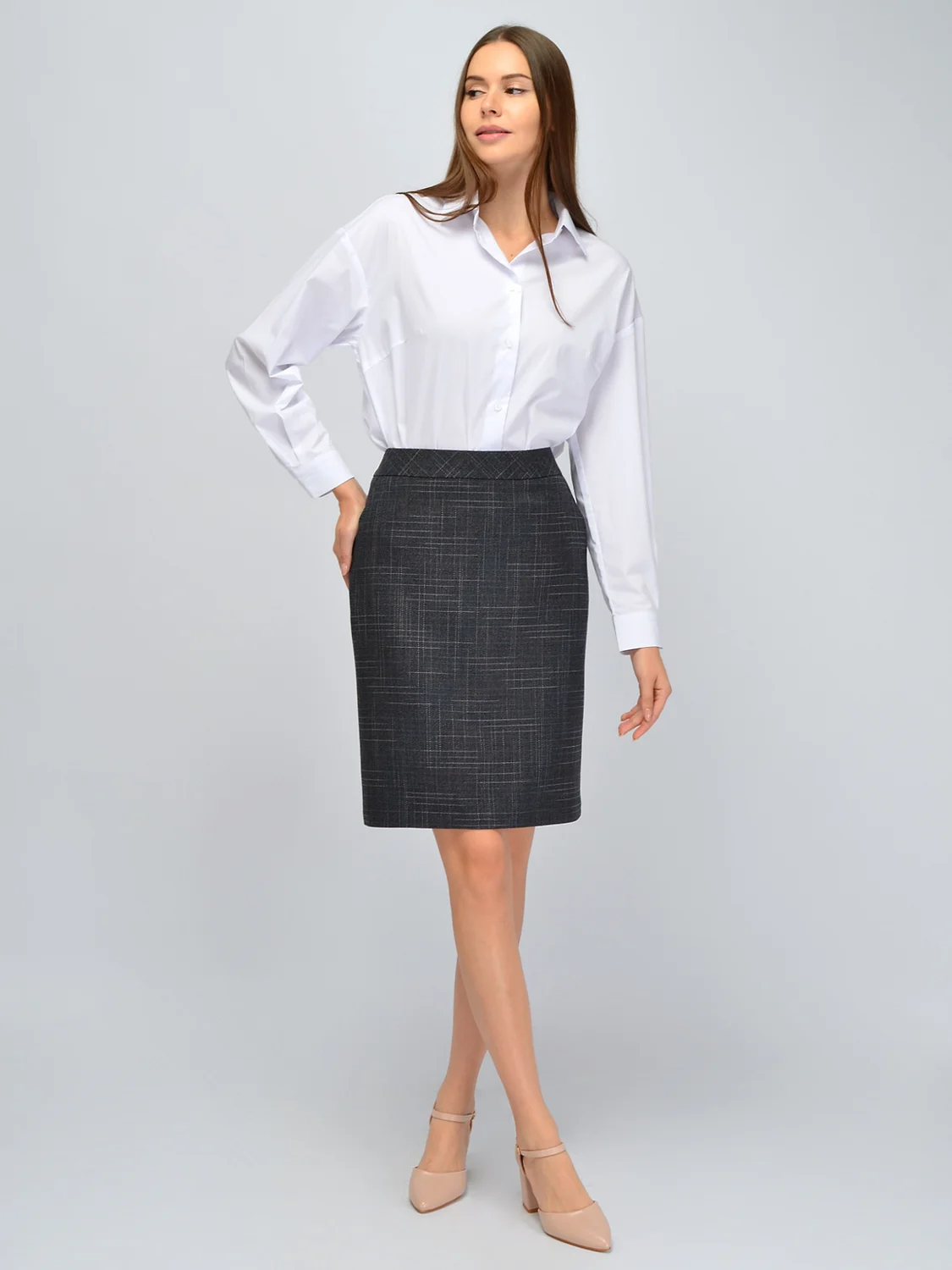 Теплая юбка карандаш обязательно должна быть в гардеробе женщин, которые стремятся выглядеть строго и женственно. Высокая посадка на талии и оптимальная длина до колена смоделируют гармоничные пропорции фигуры и визуально вытянут силуэт. По бокам располагаются практичные и удобные карманы. Застегивается прямая юбка миди на потайную молнию сзади. Для удобства при ходьбе и приданию элегантного образа сзади находится шлица. На юбке предусмотрена комфортная подкладка, которая скроет контуры белья и обеспечит скольжение ткани. Юбочка до колена выполнена из приятной плотной ткани в клетчатой расцветке. Осенняя юбка в клетку придется по вкусу и взрослым женщинам, и молодым девушкам. Классическую юбку миди можно надеть на работу в офис, культурное или торжественное мероприятие. Строгая юбка карандаш сочетается с однотонными блузками, рубашками, водолазками и обувью на высоком ходу. Деловая клетчатая юбка до колена станет базовым элементом Вашего гардероба.