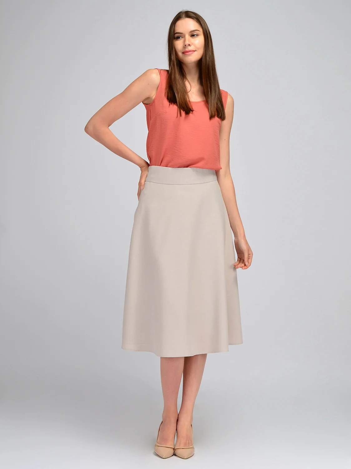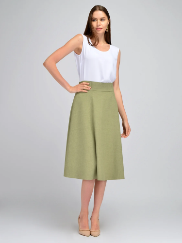 Летняя юбка трапеция гармонично впишется в гардероб любой модницы. Пояс юбки дополнен скрытой резинкой и выполнен в виде кокетки, а это значит, что модель прекрасно сядет в талии в не зависимости от размера. Юбка застегивается на поташную молнию сбоку. Расклешенная юбка имеет подкладку. Стильная юбка ниже колена впишется в различные по стилю и настроению образы. Дополните ее блузкой или свободным топом, подберите туфли-лодочки и добавьте аккуратных украшения, чтобы получился классический деловой образ для работы и офиса на лето. Босоножки и шляпа дополнят более расслабленный образ для пляжа, отпуска на море или торжественного мероприятия на природе. Базовая модель понравится как молодым девушкам, так и женщинам более взрослого поколения. Свободный широкий крой скроет возможные недостатки фигуры, а высокая талия поможет сформировать женственный силуэт. Идеальная длина ниже колена подойдет на разный рост: высоким девушкам и дамам среднего роста. Лаконичная однотонная юбка выполнена из качественной легкой ткани с большим процентом хлопка в составе. А это значит, что Вы не только будете чувствовать себя комфортно в течение всего дня, но и изделие сохранит свой первоначальный вид после многих стирок.