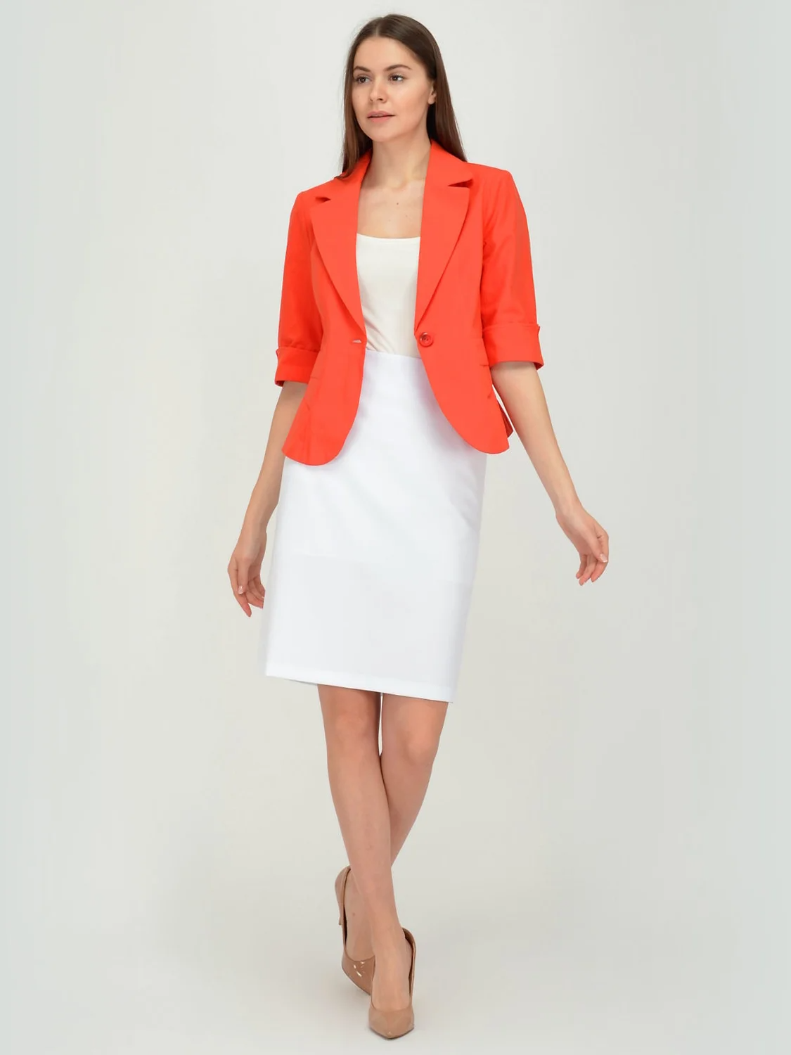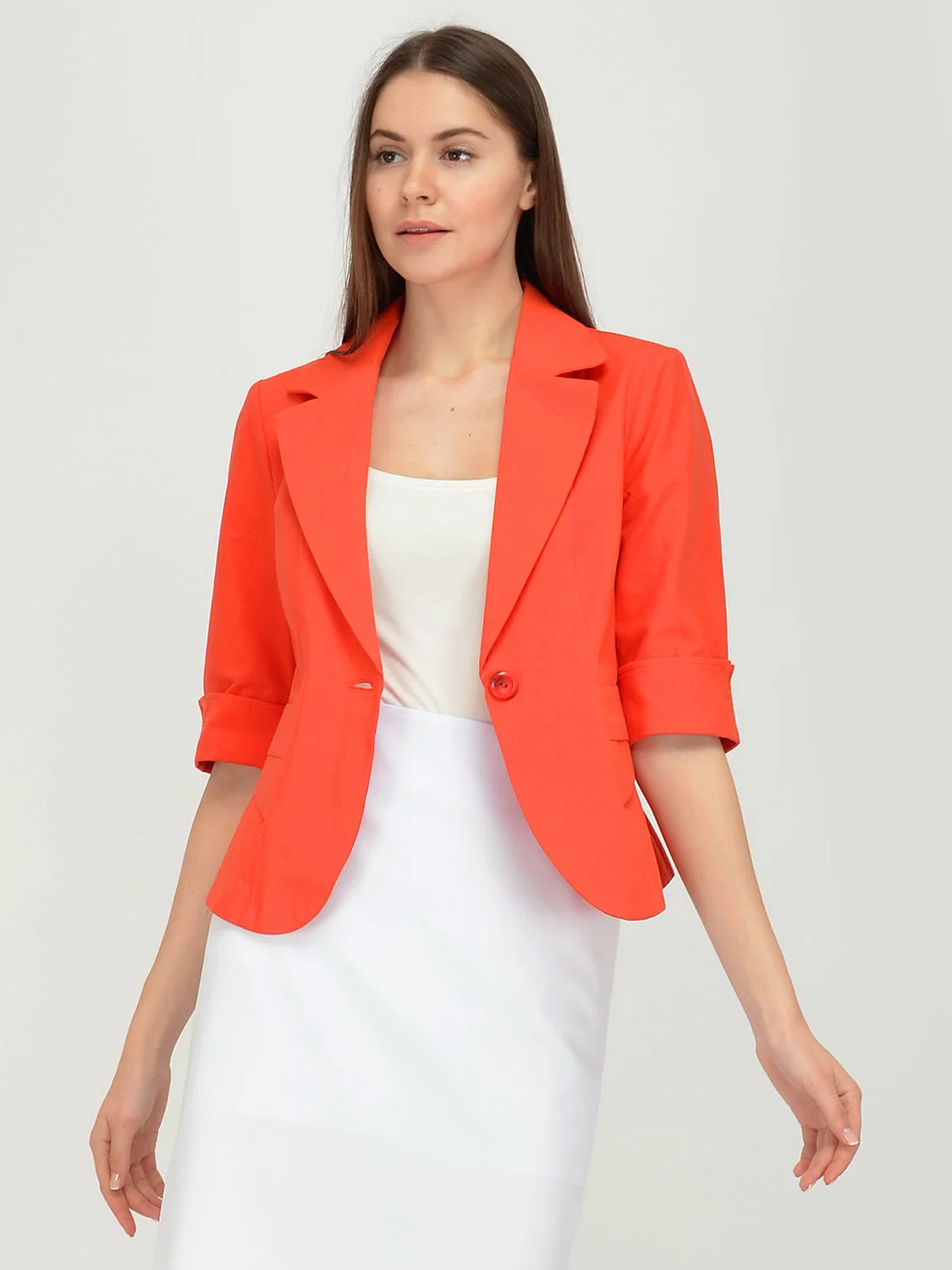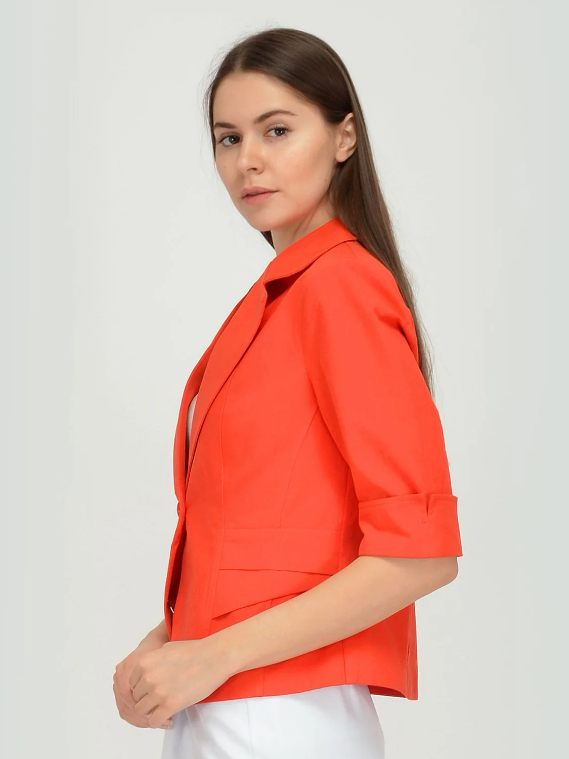Жакет женский приталенного силуэта. Рукав три четверти с отворотом. Застежка на пуговицу. На полочке в рельефах декоративные детали. Жакет без подклада.