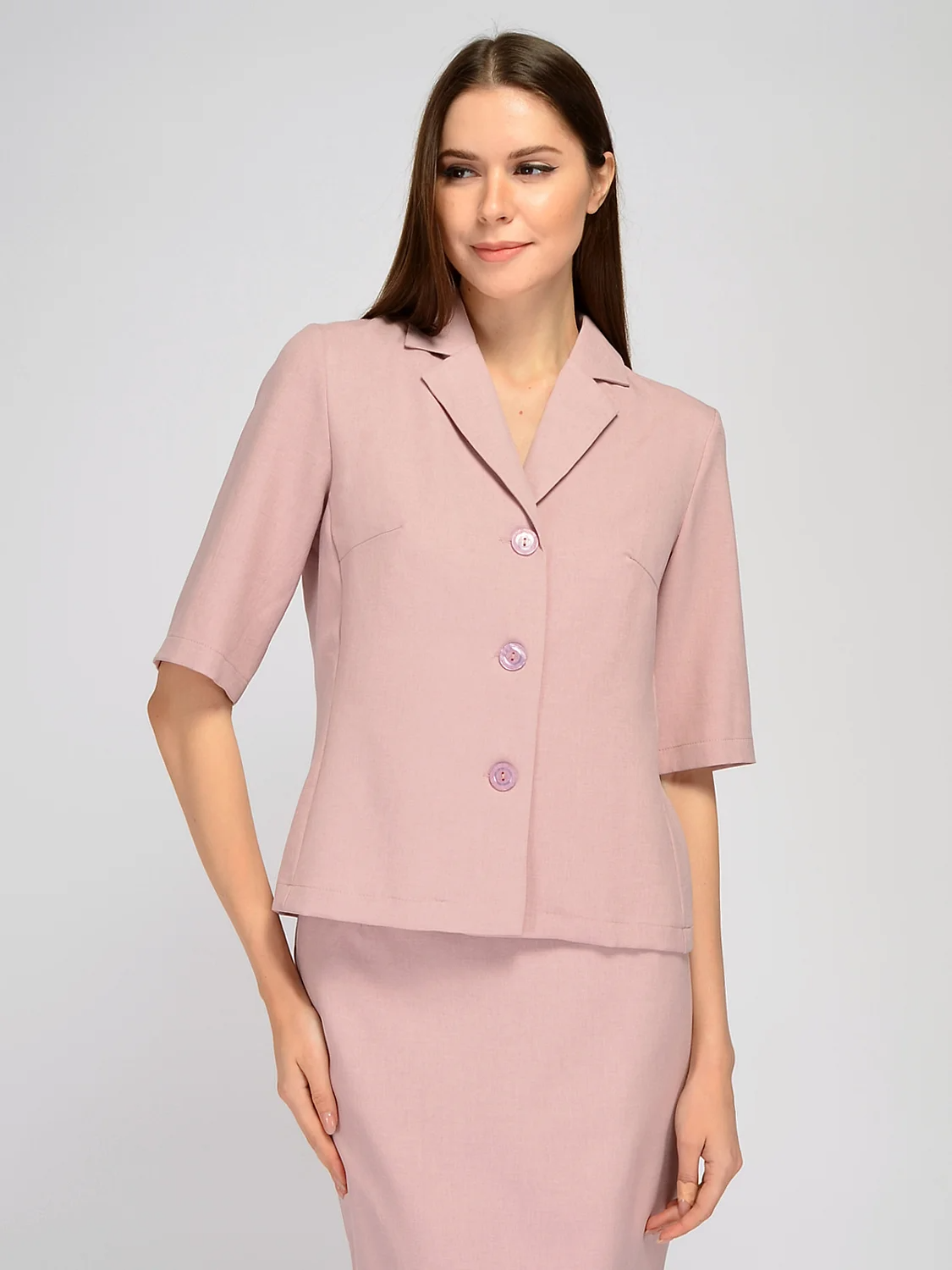 Укороченный жакет на пуговицах уверенно дополнит Ваш весенний офисный гардероб. Классический отложной воротник и V-образный вырез добавляют всему образу строгости. Прямой крой и укороченные рукава до локтя позволят Вам чувствовать себя комфортно и свободно в жаркую погоду. Укороченная длина жакета выгодно подчёркивает линию талии . Отделка горловины - воротник. Рукав укороченный. Вид застёжки - пуговицы. Воротник отложной. V-образный вырез. Длина - укороченная. Крой прямой. Рекомендована стирка при температуре не более 30С.