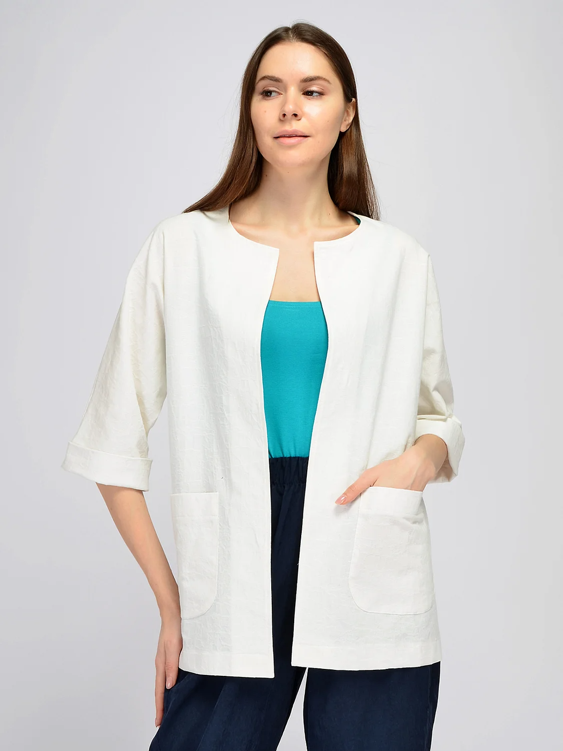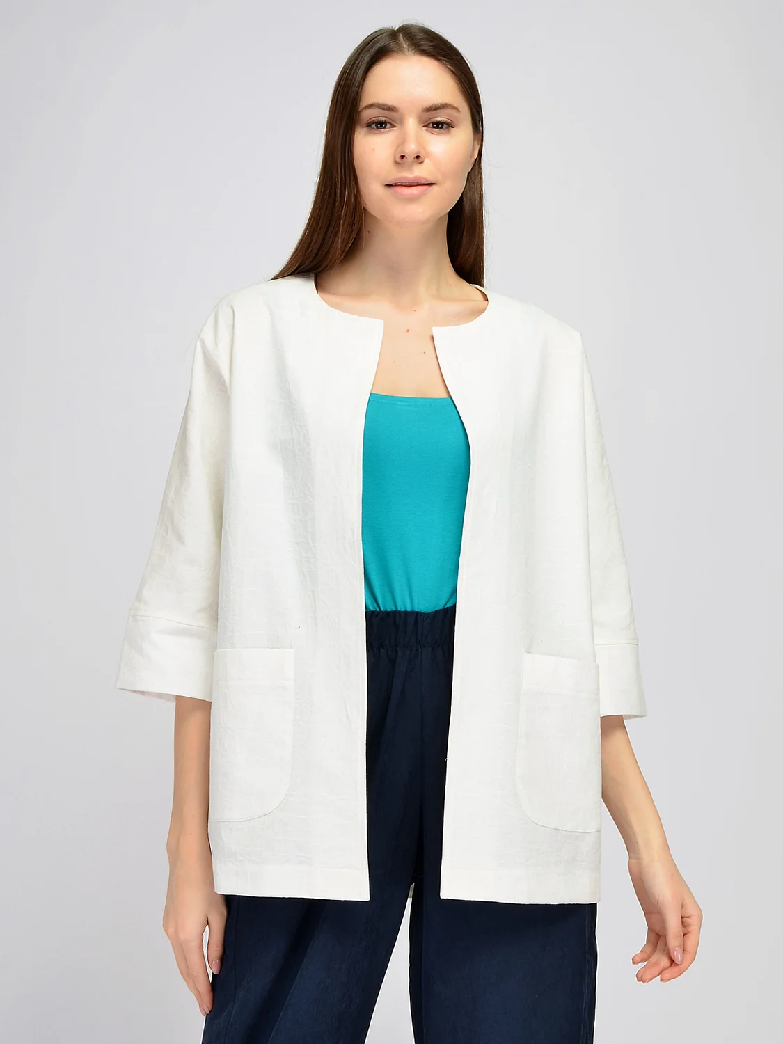 Хлопковый жакет без застежки. Элегантный жакет без застежки станет важным дополнением Вашего весеннего и летнего гардероба. Округлый вырез и укороченные рукава придадут образу легкости и подчеркнут Вашу женственность. На передней части жакет расположены удобные накладные карманы. Вырез горловины круглый. Без отделки горловины. Длина рукава до локтя. Рукава цельнокроеные. Форма рукавов летучая мышь. Без застежки. Крой прямой. Карманы накладные. Рекомендована стирка при температуре 30С. Свободный фасон оверсайз с цельнокроеными рукавами формы летучая мышь обеспечит Вам комфорт и стильный образ. Жакет прямого кроя выполнен из хлопка высочайшего качества, что позволит ему прослужить не один сезон. Хлопковый жакет сможет дополнить как деловой, так и повседневный стиль. Подбирайте топы(блузки) и брюки(юбки) из натуральных материалов для создания гармоничного комплекта.