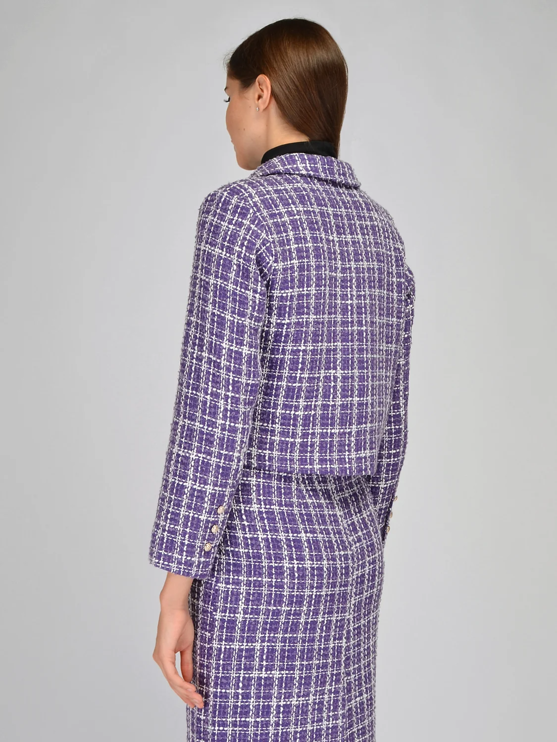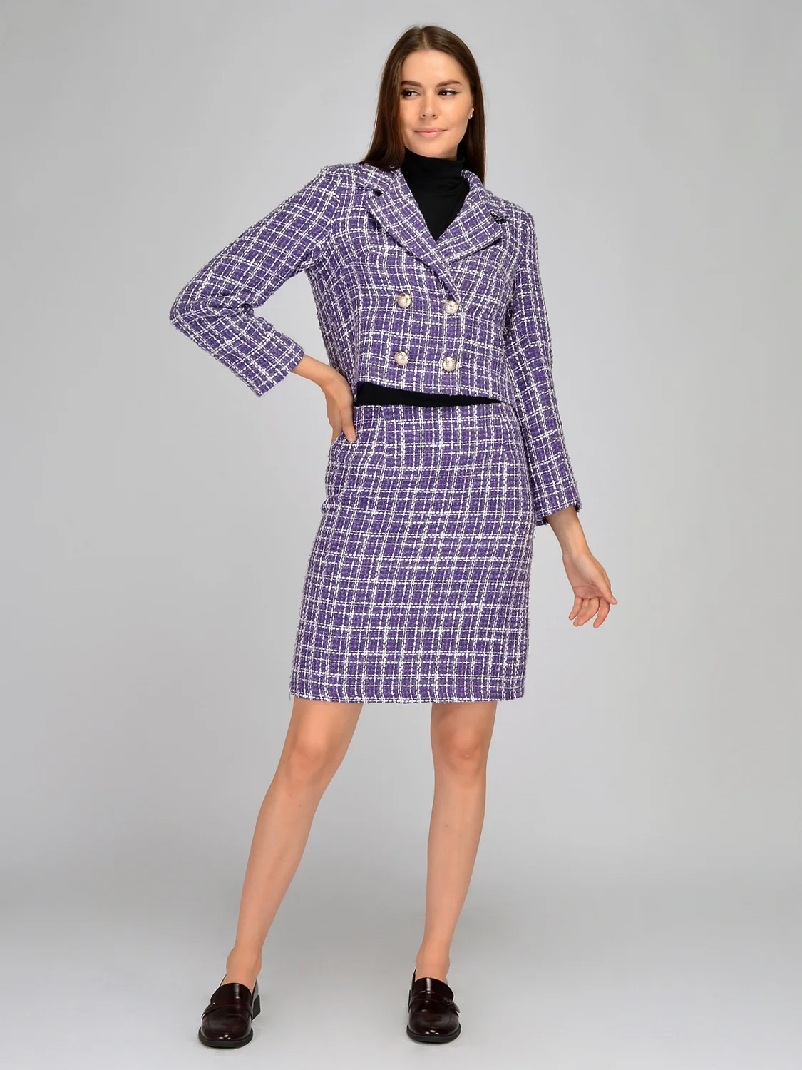Двубортный женский укороченный жакет из твида клетчатой расцветки в сочетании с комплектной юбкой составит элегантный женственный образ для офиса, делового или торжественного мероприятия. Классический отложной воротник и укороченные рукава, декорированные нарядными пуговицами, дополняют строгий и утонченный стиль, подчеркивая чувство вкуса своей владелицы.