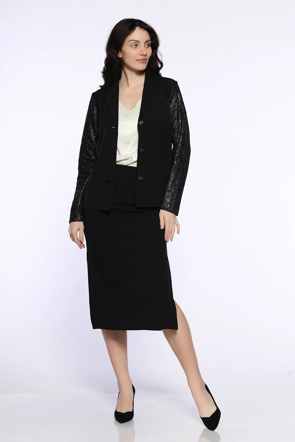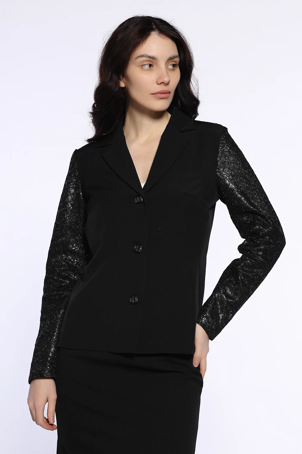 Праздничный жакет прямого кроя впишется как в вечерние и офисные образы. Классический фасон с отложным воротником дополнен эффектными кружевными рукавами с блестками. Вытачки на груди обеспечивают жакету идеальную посадку в области груди. Прямой жакте до бедра застегивается на три пуговицы. Свободная посадка не сковывает движений и скрывает возможные недостатки фигуры. Нарядный жакет идеально гармонирует с комплектными брюками в тон. Вы также можете сочетать его с другими брюками, юбками, топами, блузками. Для завершения вечернего образа на выход, подберите подходящие украшения, аксессуары и оубвь. К классическому жакету подойдет женственная обувь на высоком ходу. Жакет с длинными рукавами подойдет взрослым женщинам и молодым девушкам. Вы легко сможете подобрать нужный размер, ведь данная модель выпускается в широком размерном ряду. Выбирайте классику, которая сохранит свою актуальность на долгие годы!