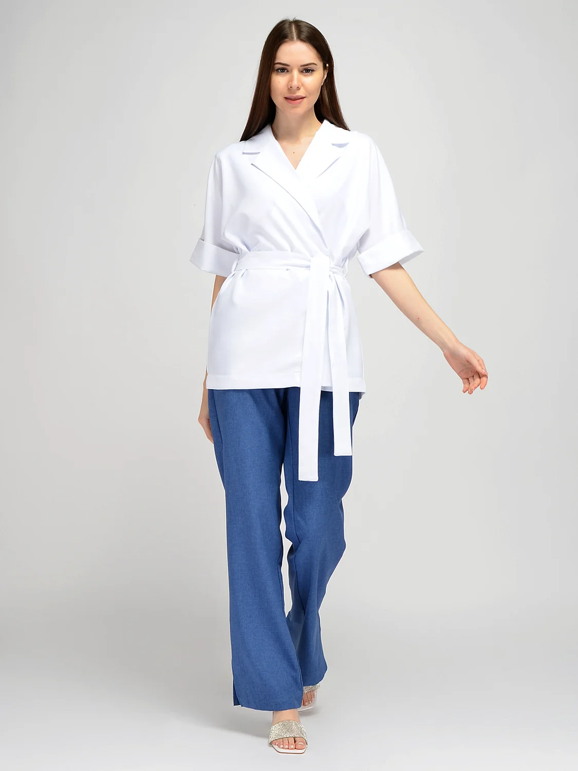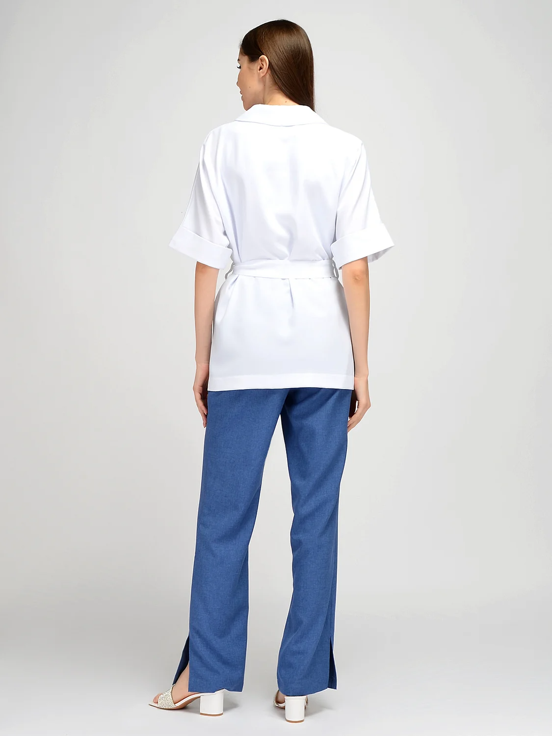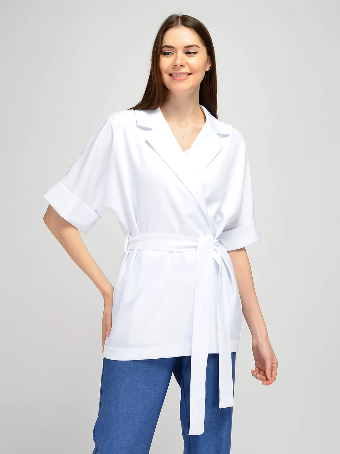 Жакет с отложным воротником свободного кроя дополнит летние образы для офиса, праздника или на каждый день. Легкий жакет на запах не имеет застежки. В комплекте находится пояс в тон изделия и шлевки по бокам. Пояс подчеркивает талию и моделирует изящный женственный силуэт. Свободные рукава до локтя имеют широкие отвороты и не сковывают движений. Стильный фасон удлиненного жакета на запах подойдет на любой тип фигуры. Длинный летний пиджак подойдет как взрослым женщинам, так и молодым девушкам. Легкий жакет с воротником можно носить как самостоятельный элемент одежды или надеть топ, майку или футболку под низ. В таком случае Вы можете распахнуть жакет, и получится воздушный романтичный образ. Свободный жакет оверсайз сочетается с классическими вещами или с повседневными. Вы можете сочетать его с юбками, брюками, джинсами. Обувь может быть как строгой, так и более спортивной. Лаконичная однотонная блузка с поясом выполнена из качественной ткани с добавлением вискозы, обеспечивая комфорт в жаркое время года.