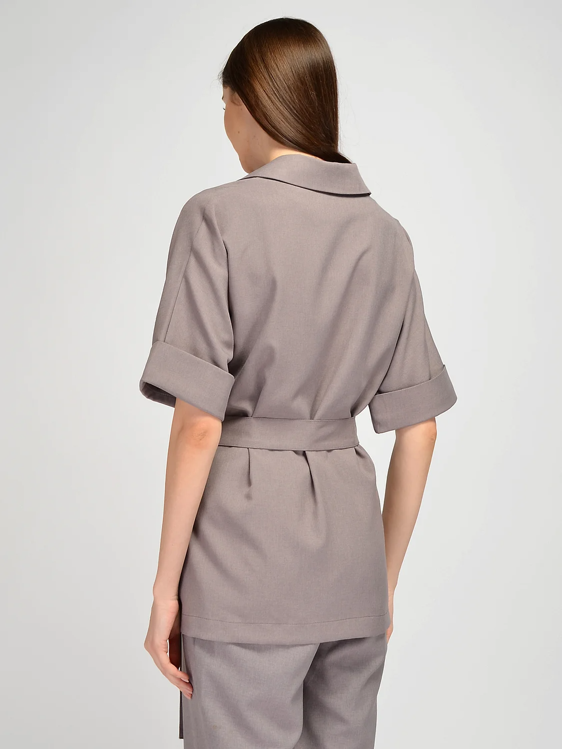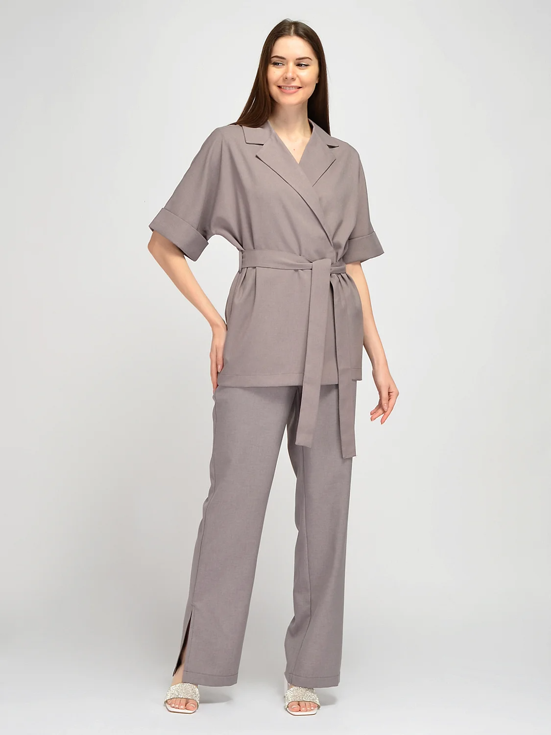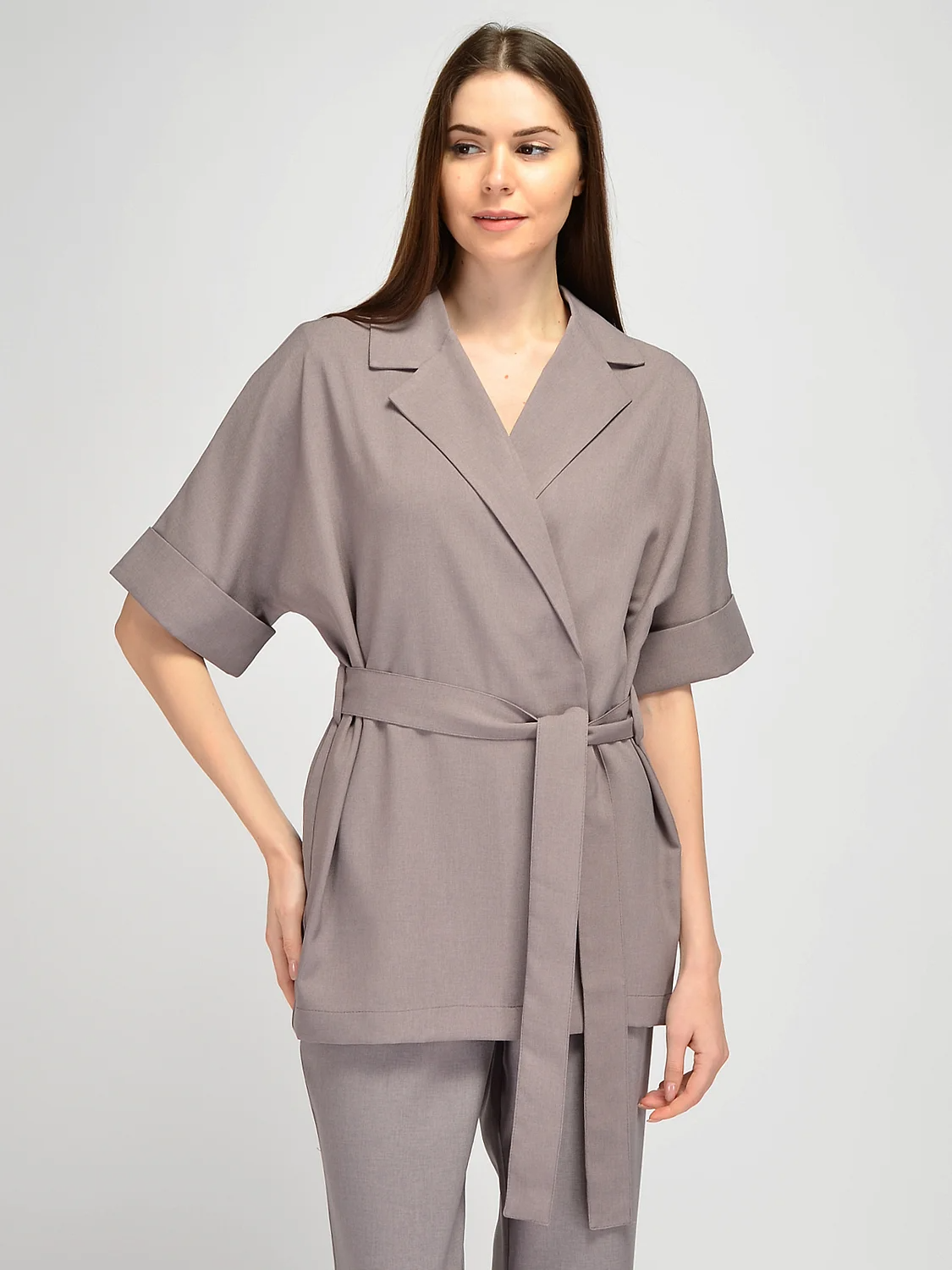 Жакет с отложным воротником свободного кроя дополнит летние образы для офиса, праздника или на каждый день. Легкий жакет на запах не имеет застежки. В комплекте находится пояс в тон изделия и шлевки по бокам. Пояс подчеркивает талию и моделирует изящный женственный силуэт. Свободные рукава до локтя имеют широкие отвороты и не сковывают движений. Стильный фасон удлиненного жакета на запах подойдет на любой тип фигуры. Длинный летний пиджак подойдет как взрослым женщинам, так и молодым девушкам. Легкий жакет с воротником можно носить как самостоятельный элемент одежды или надеть топ, майку или футболку под низ. В таком случае Вы можете распахнуть жакет, и получится воздушный романтичный образ. Свободный жакет оверсайз сочетается с классическими вещами или с повседневными. Вы можете сочетать его с юбками, брюками, джинсами. Обувь может быть как строгой, так и более спортивной. Лаконичная однотонная блузка с поясом выполнена из качественной ткани с добавлением вискозы, обеспечивая комфорт в жаркое время года.