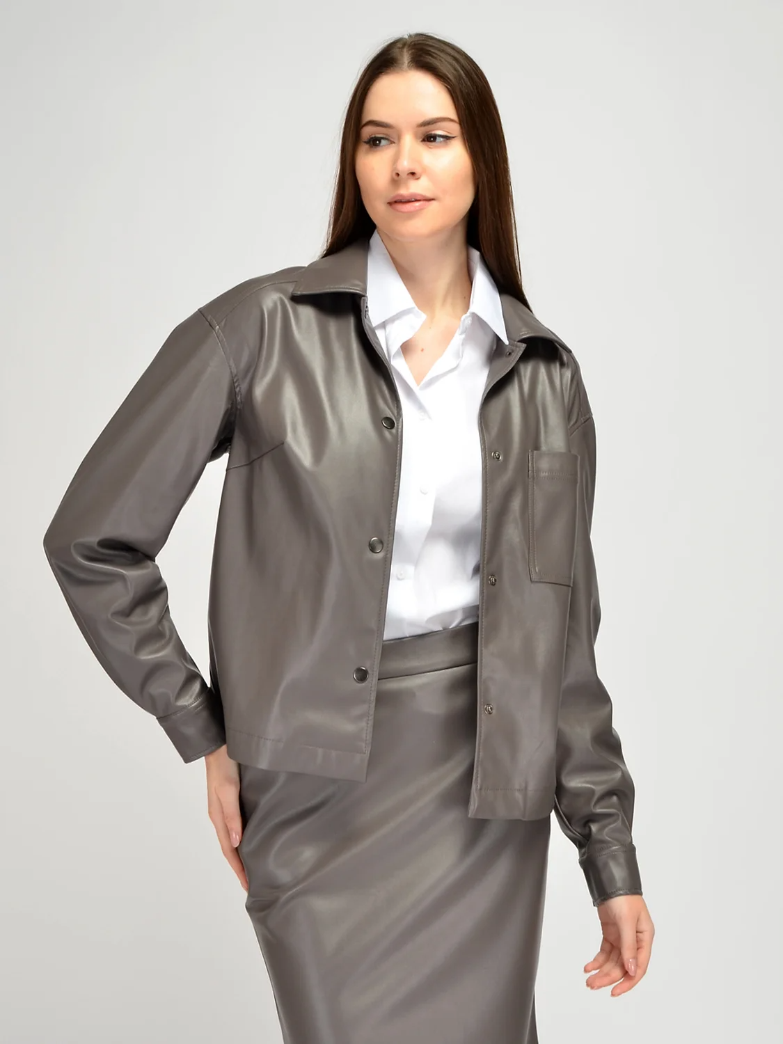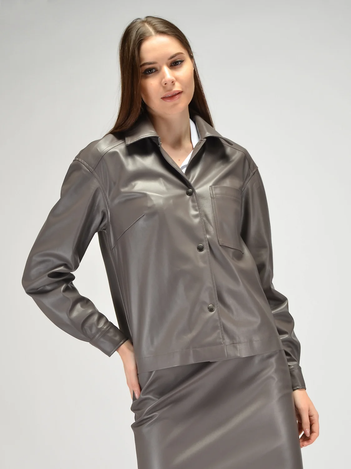 Стильный жакет из экокожи станет ярким дополнением Вашего гардероба. Жакет оверсайз рубашечного фасона имеет отложной воротник. Классический силуэт свободного кроя имеет спущенную линию плеча и не облегает фигуру. Застегивается кожаная рубашка на кнопки. На полочке, спереди, находится накладной карман. Длинные рукава на манжете имеют широкий крой и не стесняют движений. Теплый жакет с длинными рукавами выполнен из качественной экокожи, а это значит, он будет радовать Вас не один сезон. Куртка из экокожи впишется как в повседневные, так и более строгие образы. Кожаный бомбер подчеркнет Вашу индивидуальность и станет одним из самых любимых элементов стиля. Модная кожаная рубашка оверсайз будет особенно уместна весной и осенью, а также ее можно надеть прохладным летним вечером или носить зимой. Универсальный базовый жакет из кожзама это тренд сезона, который будет уместен при любых обстоятельствах. Дополните деловой образ рубашкой, юбкой карандаш и ботильонами. Для более расслабленного, городского образа выбирайте футболку, джинсы и удобную обувь на плоском ходу.