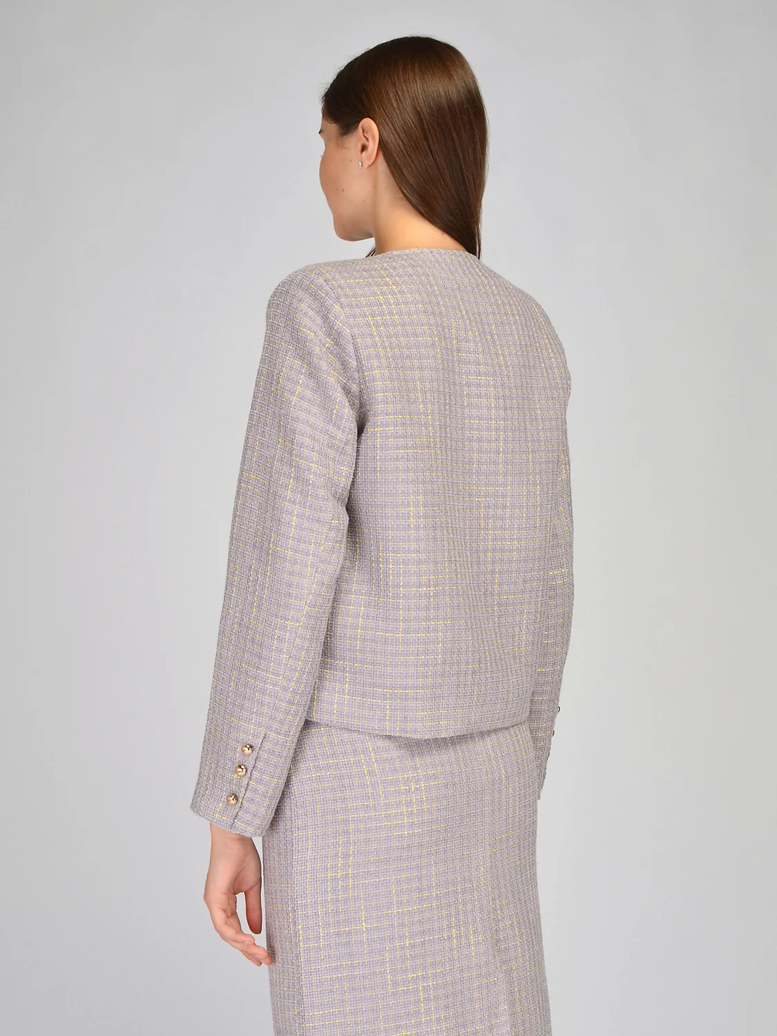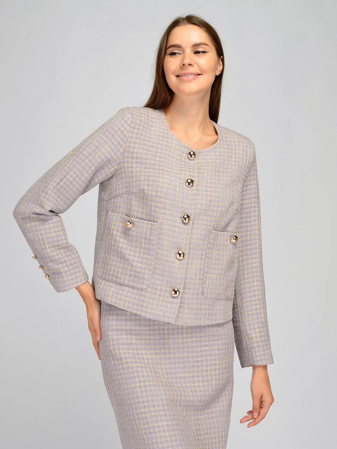 Элегантный жакет в стиле шанель дополнит строгие и нарядные образы. У него аккуратный округлый вырез горловины и рукава полной длины. На груди располагаются вытачки, чтобы жакет прекрасно сел на любую фигуру. Классический прямой крой дополнен двумя накладными карманами спереди, которые застегиваются на выразительные пуговицы, которые также есть на рукавах и на линии застежки. Свободный жакет выполнен из приятной теплой ткани в клетчатый узор. Широкий крой не подчеркивает нюансы фигуры, скрывает возможные ее недостатки, акцентируя все внимание на Вашу утонченность. Оптимальная длина до бедра будет прекрасно смотреться на женщинах разного роста и типа фигуры. Твидовый жакет придется по вкусу не только взрослым женщинам, но и молодым девушкам, которые предпочитают изысканный вкус в одежде. Выбирайте стильную модель для праздников, деловых встреч, культурных мероприятий. Сочетайте эффектную модель с комплектной юбкой из нашего ассортимента или с однотонными брюками или юбками. Вы можете носить жакет застегнутым на все пуговицы или нарспашку, если наденете под него блузку или вечерний топ. Завершите образ строгой обувью и подходящими украшениями и аксессуарами.