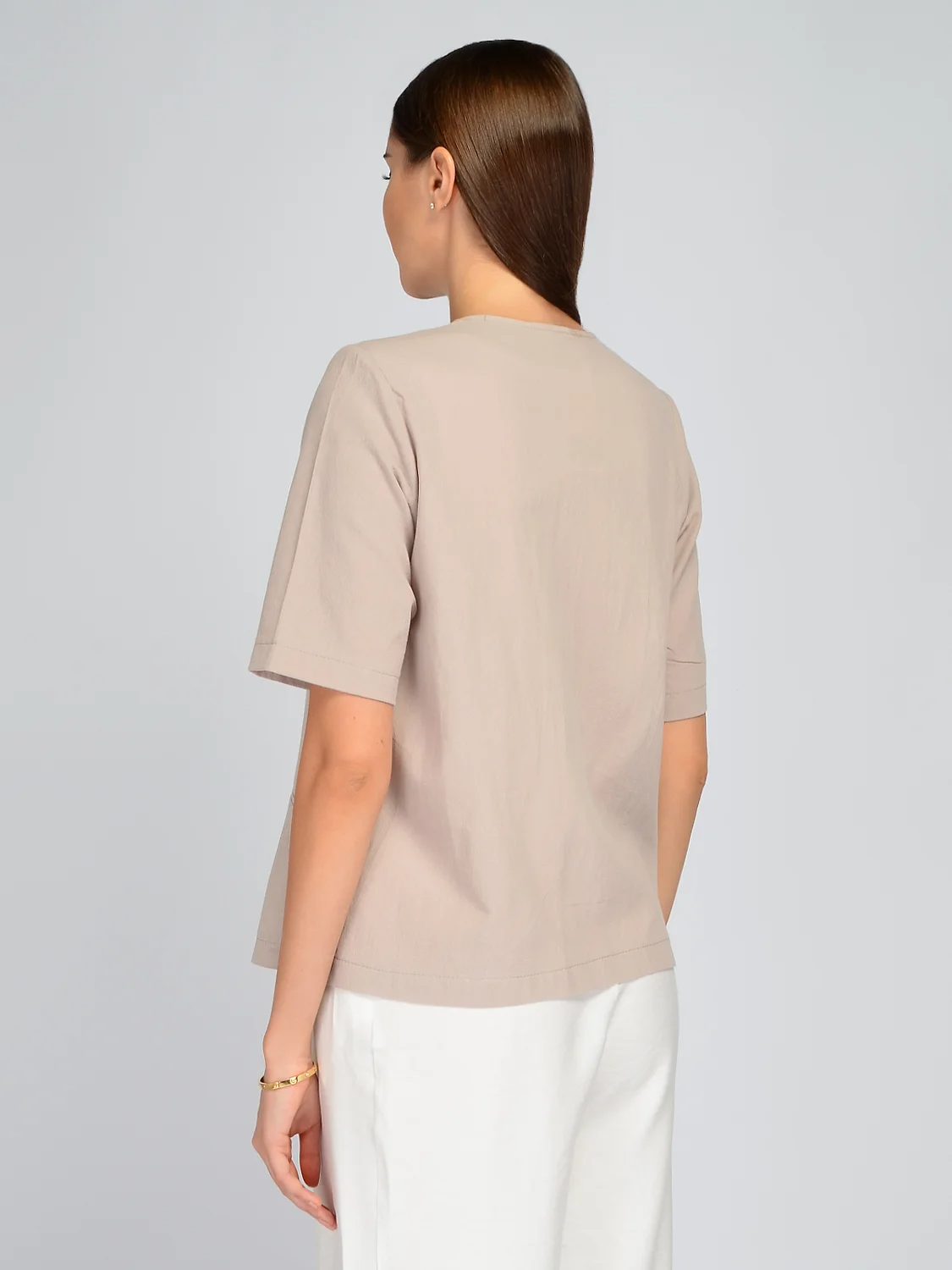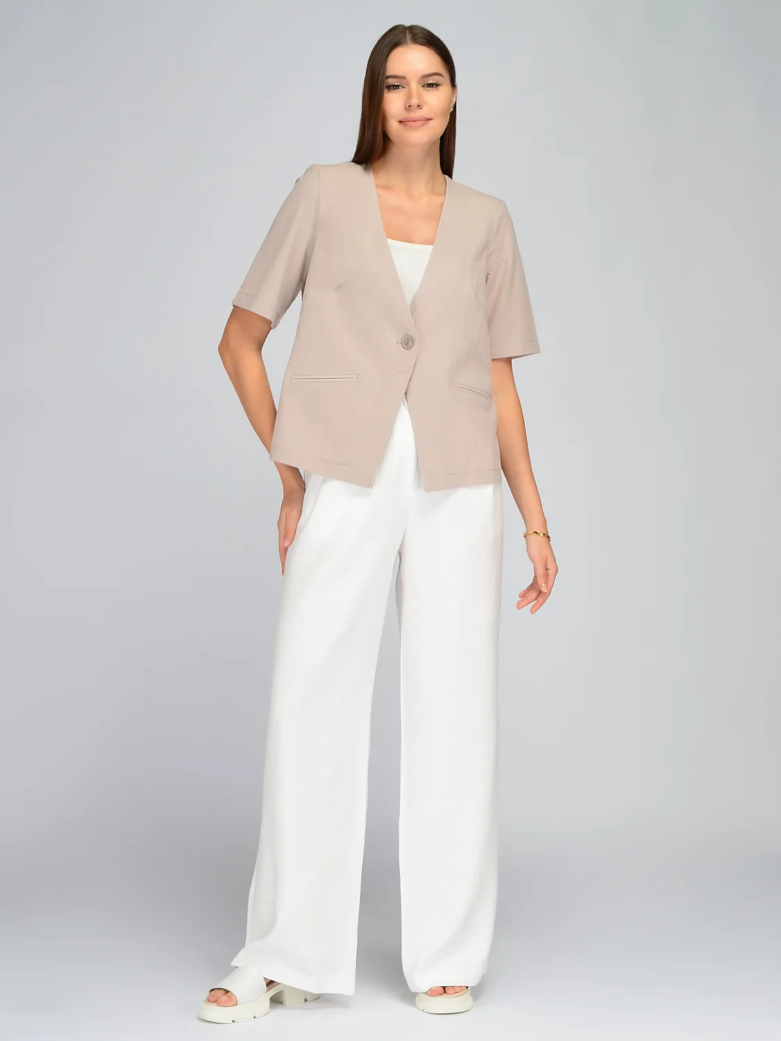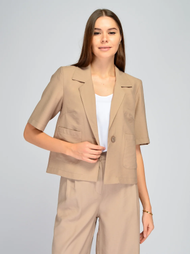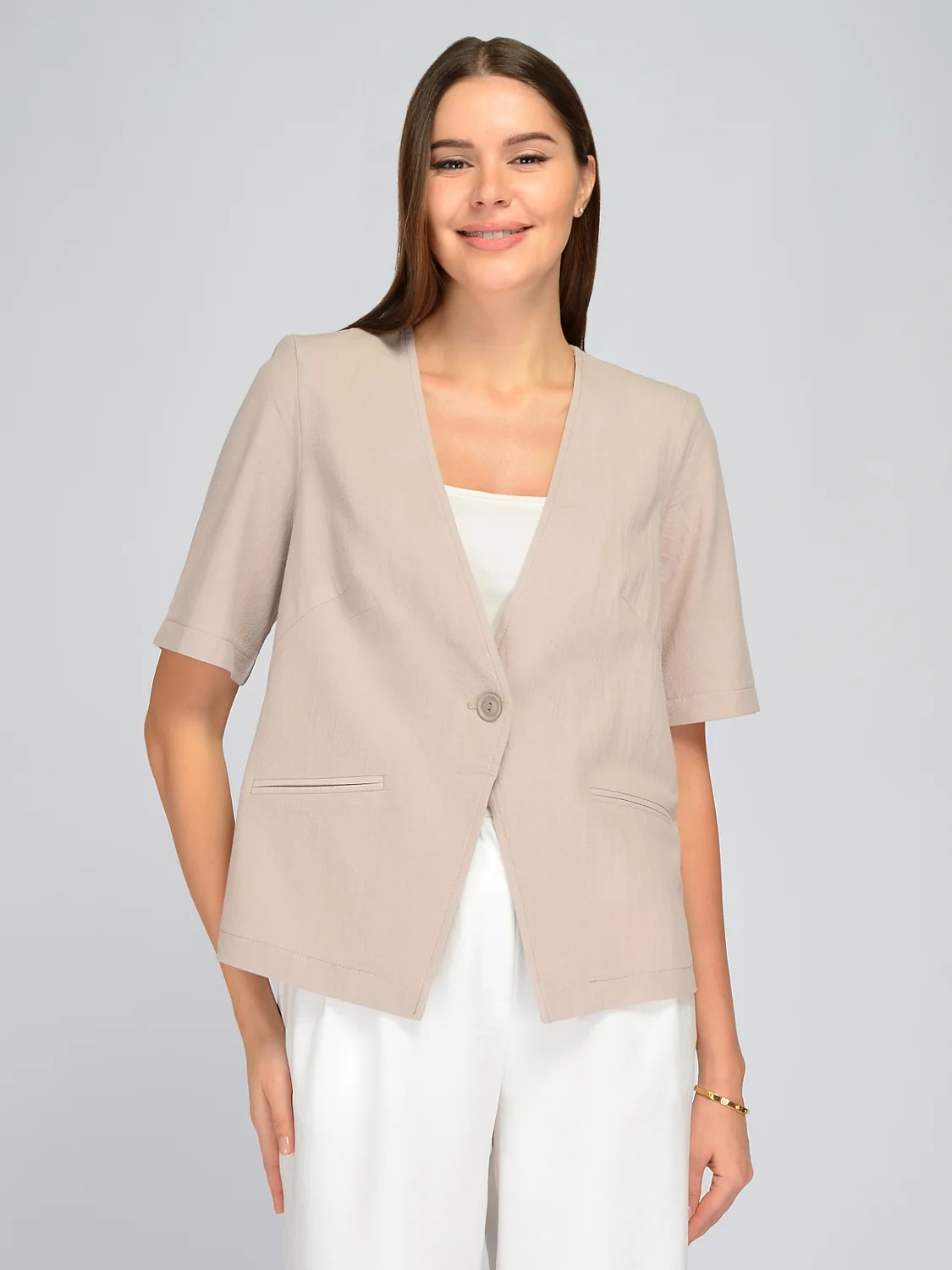 Хлопковый жакет в классическом стиле станет находкой для делового гардероба летом. Глубокий V- образный вырез горловины, приоткрывая ключицу и визуально вытягивая силуэт. Короткие рукава чуть выше локтя не сковывают движений и обеспечивают комфорт в течение всего летнего дня. Застегивается жакет на одну пуговицу. На груди находятся вытачки, что позволяет жакету прекрасно садится на любую фигуру, даже если у Вас пышные формы. Спереди находятся прорези с фальшь карманами, чтобы не утяжелять образ. Летний жакет свободного кроя подойдет для офисной работы, а также для культурных мероприятий или торжественных событий. Пиджак выполнен из 100% хлопка, при этом Ваша кожа будет дышать, и Вы будете чувствовать себя комфортно на протяжении всего дня. Этому также будет способствовать свободный силуэт оверсайз. Ткань с эффектом жатки придаст образу интересной изюминки. Дополните образ льняными или хлопковыми брюками, юбкой, под жакет подберите топ или блузку без рукавов. Создавайте свежие легкие образы для особых случаев или на каждый день!