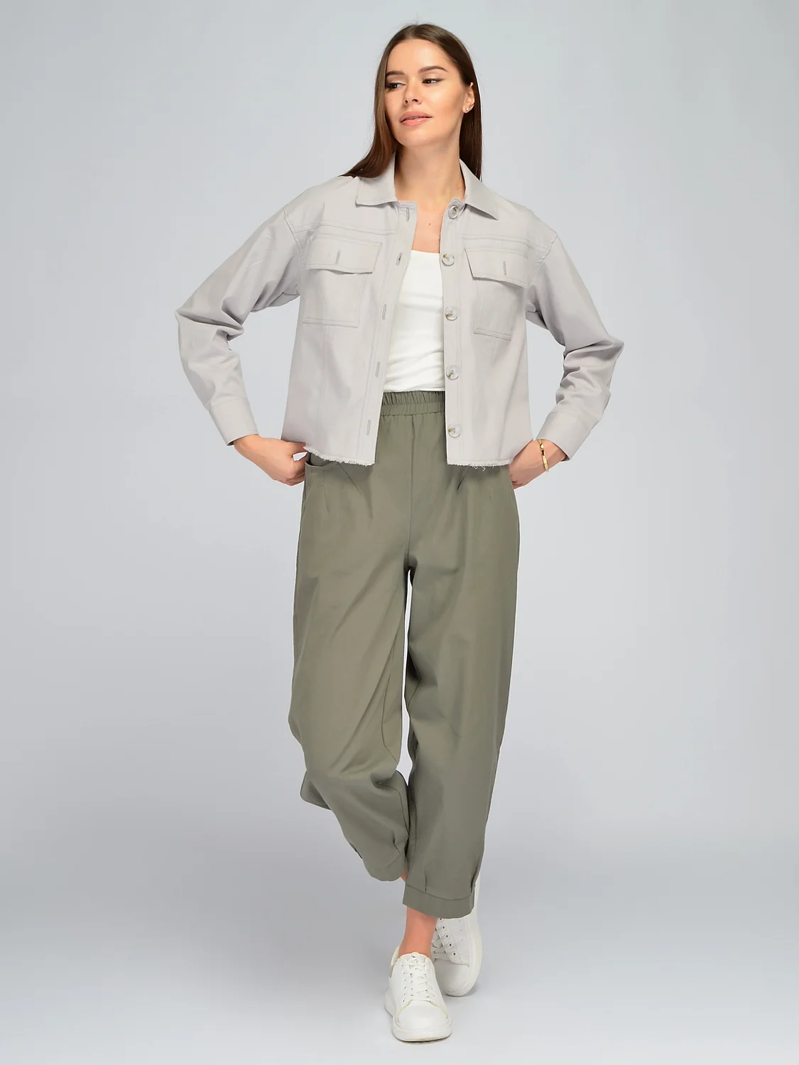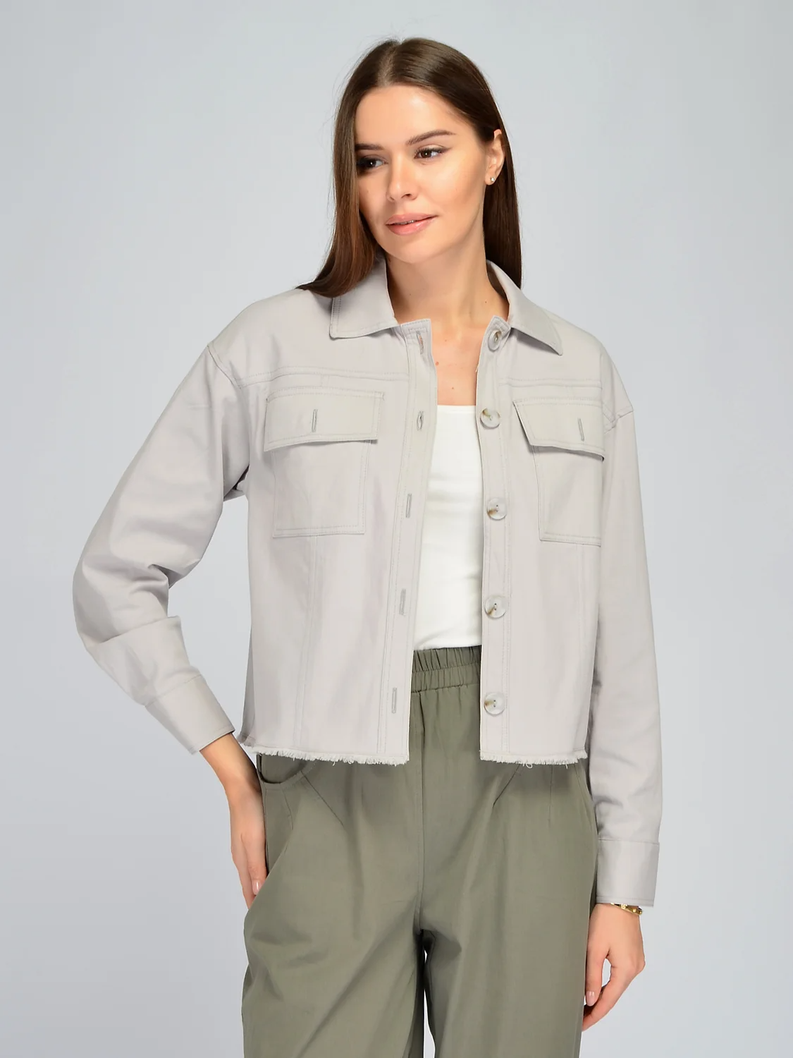 Повседневный хлопковый жакет станет прекрасным дополнением образов в стиле кэжуал весной и летом. Жакет выполнен из 100% хлопка, а это значит, он сохранит опрятный вид даже после многих стирок и будет радовать Вас не один сезон. Пиджак имеет отложной воротник, застегивается на пуговицы. На груди располагаются два накладных кармана, в которых можно держать необходимые мелочи. Стильный жакет имеет крой оверсайз и спущенную линию плеча, дополняя актуальный современный образ. Нижняя часть рубашки имеет необработанный край, добавляя легкой небрежности и делая образ легким и расслабленным. Хлопковый жакет оверсайз впишется в городские образы девушек и женщин разного возраста, роста и комплекции. Универсальный летний жакет можно сочетать с джинсами, юбками, шортами, хлопковыми брюками, футболками и топами. Свободный жакет скроет возможные недостатки фигуры в области живота и бедер. Плотная рубашка подойдет тем, кто ведет активный образ жизни и выбирает практичные и модные образы на каждый день!