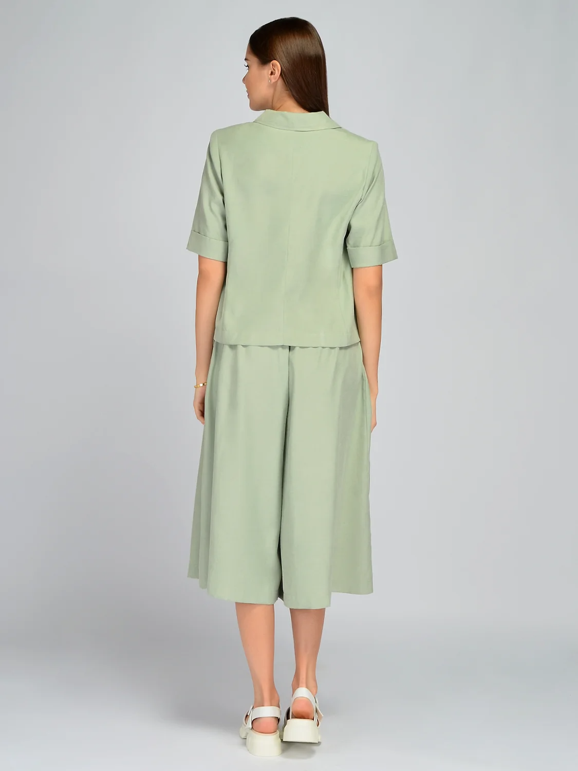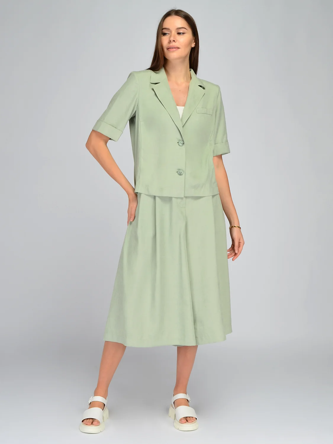 Свободный летний жакет станет элегантным дополнением летнего гардероба для тех, кто предпочитает строгий стиль в одежде. Классический отложной воротник с V-образным вырезом горловины визуально вытягивает силуэт и придает образу строгости. Застегивается пиджак на две пуговицы. На полочке находится фальшь карман. Чтобы жакет идеально сел на любые формы, на нем предусмотрены вытачки на груди. Удобные свободные рукава до локтя не стесняют движений и имеют аккуратные отвороты, что позволит регулировать нужную длину. Свободный крой летнего жакета скроет возможные недостатки фигуры в зоне живота и поможет создать актуальный современный образ для работы, деловой встречи или культурного мероприятия. Жакет выполнен из приятной легкой ткани, обеспечивая Вам максимальный комфорт на протяжении всего дня. Дополните образ комплектными брюками кюлотами и обувью на высоком или низком ходу, которая соответствует поводу.