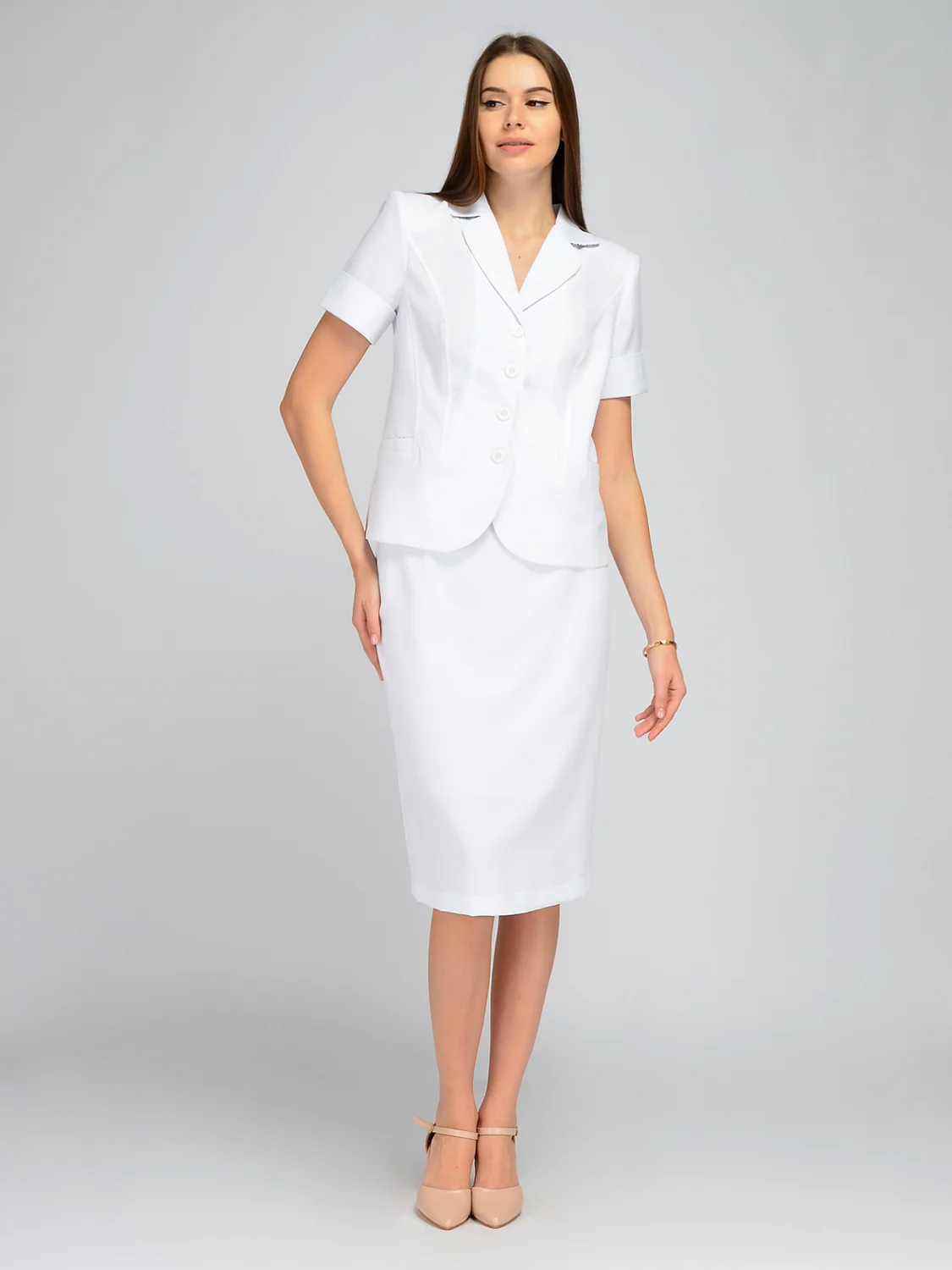 Летний приталенный жакет - это классический элемент женского гардероба. Вертикальные вытачки и отложной воротник создают деловой офисный образ, который также подходит для торжественных мероприятий, таких как свадьба или юбилей. Короткие рукава с отворотами делают летний пиджак более легким и воздушным, что подходит для летних вечеринок и повседневного кэжуал стиля. Контрастная отделка воротника и клапанов придают этому жакету определенную изюминку, благоадря которой Ваш образ захочется рассматривать. Приталенный крой подчеркнет фигуру, моделируя женственный силуэт. Контрастная отделка воротника и клапанов придают ему притягательный вид. Этот жакет идеально сочетается с юбками и брюками разного стиля, что делает его универсальным элементом гардероба. Летний жакет - идеальный выбор для тех, кто предпочитает классический стиль и хочет выглядеть эффектно и привлекательно в любое время года. Жакет выполнен из приятной легкой ткани, которая практически не мнется и сохраняет опрятный вид на протяжении всего дня.