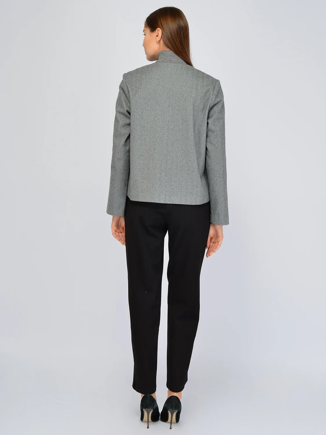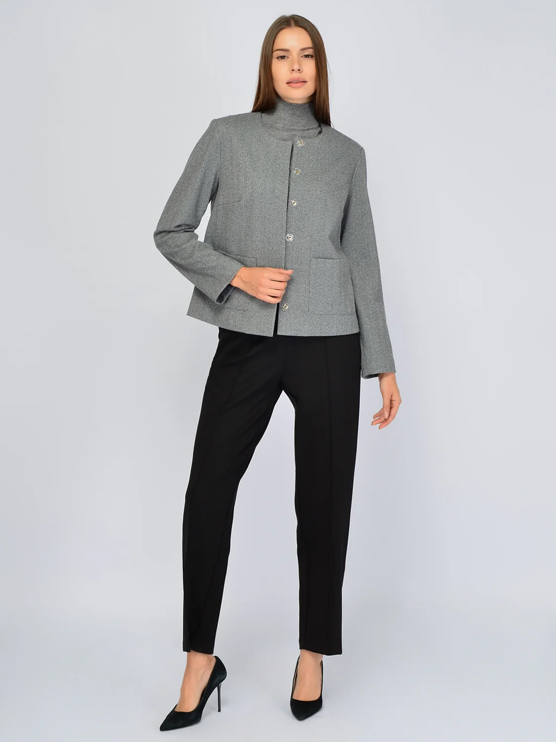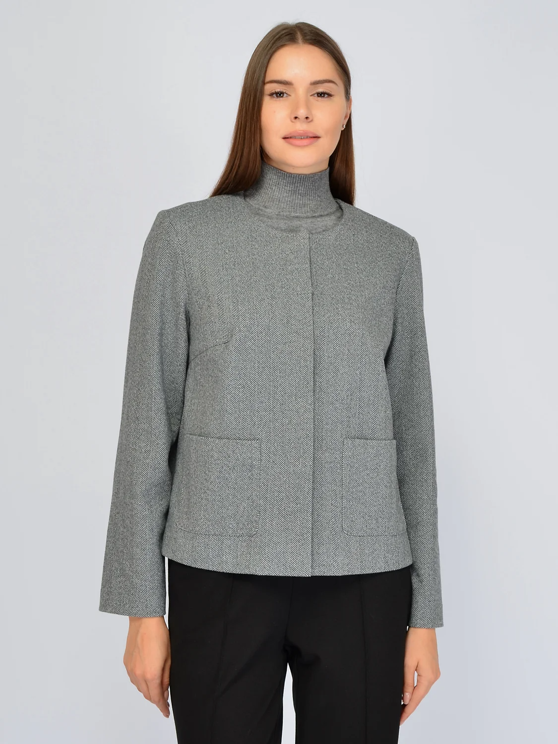Элегантный жакет без декоративных деталей дополнит строгие и нарядные образы. У него аккуратный округлый вырез горловины и рукава полной длины. На груди располагаются вытачки, поэтому жакет прекрасно сядет на любую фигуру. Классический прямой крой дополнен двумя накладными карманами спереди. Застегивается базовый жакет на потайные пуговицы спереди, тем самым не отвлекая внимания от лаконичного кроя. Свободный жакет выполнен из приятной теплой ткани с узором елочка. Широкий крой не подчеркивает нюансы фигуры, скрывает возможные ее недостатки, акцентируя все внимание на Вашу элегантность. Оптимальная длина до бедра будет прекрасно смотреться на женщинах разного роста и типа фигуры. Осенний жакет придется по вкусу не только взрослым женщинам, но и молодым девушкам, которые предпочитают изысканный вкус в одежде. Выбирайте стильную модель для праздников, деловых встреч, культурных мероприятий. Сочетайте эффектную модель с однотонными брюками или юбками в классическом стиле. Вы можете носить жакет застегнутым на все пуговицы или нараспашку, если наденете под него блузку или вечерний топ. Завершите образ строгой обувью и подходящими украшениями и аксессуарами.