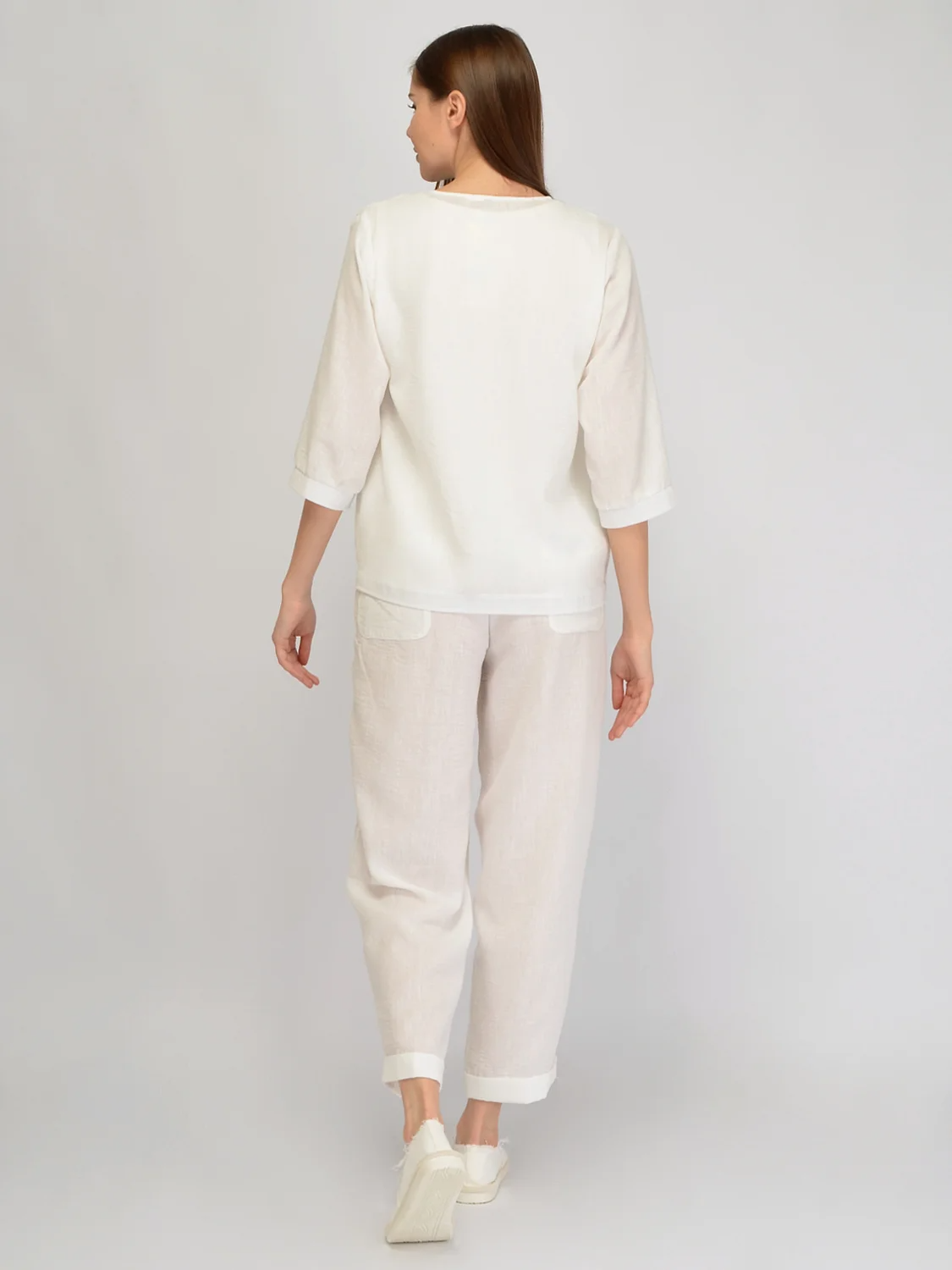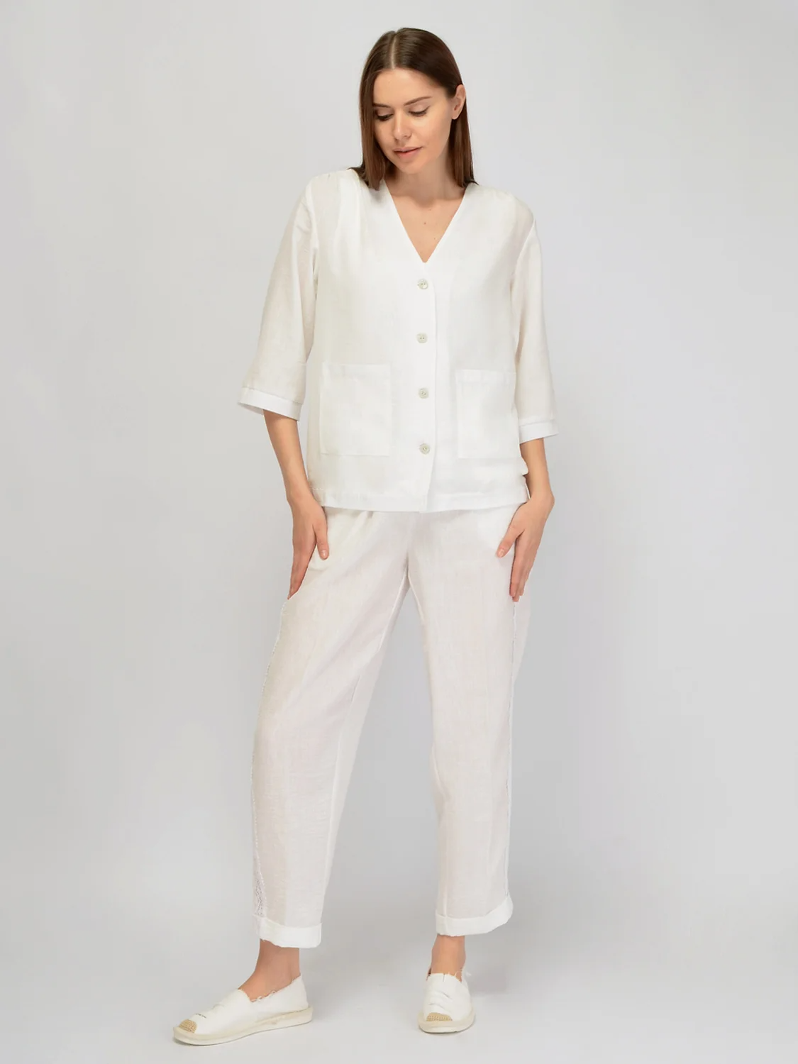 Свободный льняной жакет станет базовым дополнением вашего гардероба, если вы предпочитаете элегантность и практичность. V-образный вырез горловины визуально вытягивает фигуру, придавая образу утонченность и приоткрывая ключицу. Легкий жакет прямого кроя застегивается на пуговицы, которые обеспечивают удобство и надежность фиксации. Офисный жакет с накладными карманами изготовлен из натуральной ткани премиум качества. У летнего женского пиджака большого размера удобные свободные рукава до локтя, которые не сковывают движений. Широкий жакет эффективно скрывает возможные недостатки в области живота, создавая гармоничный и современный образ, подходящий как для работы, так и для культурных мероприятий. Базовый жакет до бедра обеспечивает комфорт на протяжении всего дня. Комплектуйте нарядный пиджак с брюками с кружевной вставкой сбоку, которые выполнены из такой же ткани. Под жакет вы можете надеть топ или футболку или подобрать белье телесного оттенка и носить застегнутым на все пуговицы.
