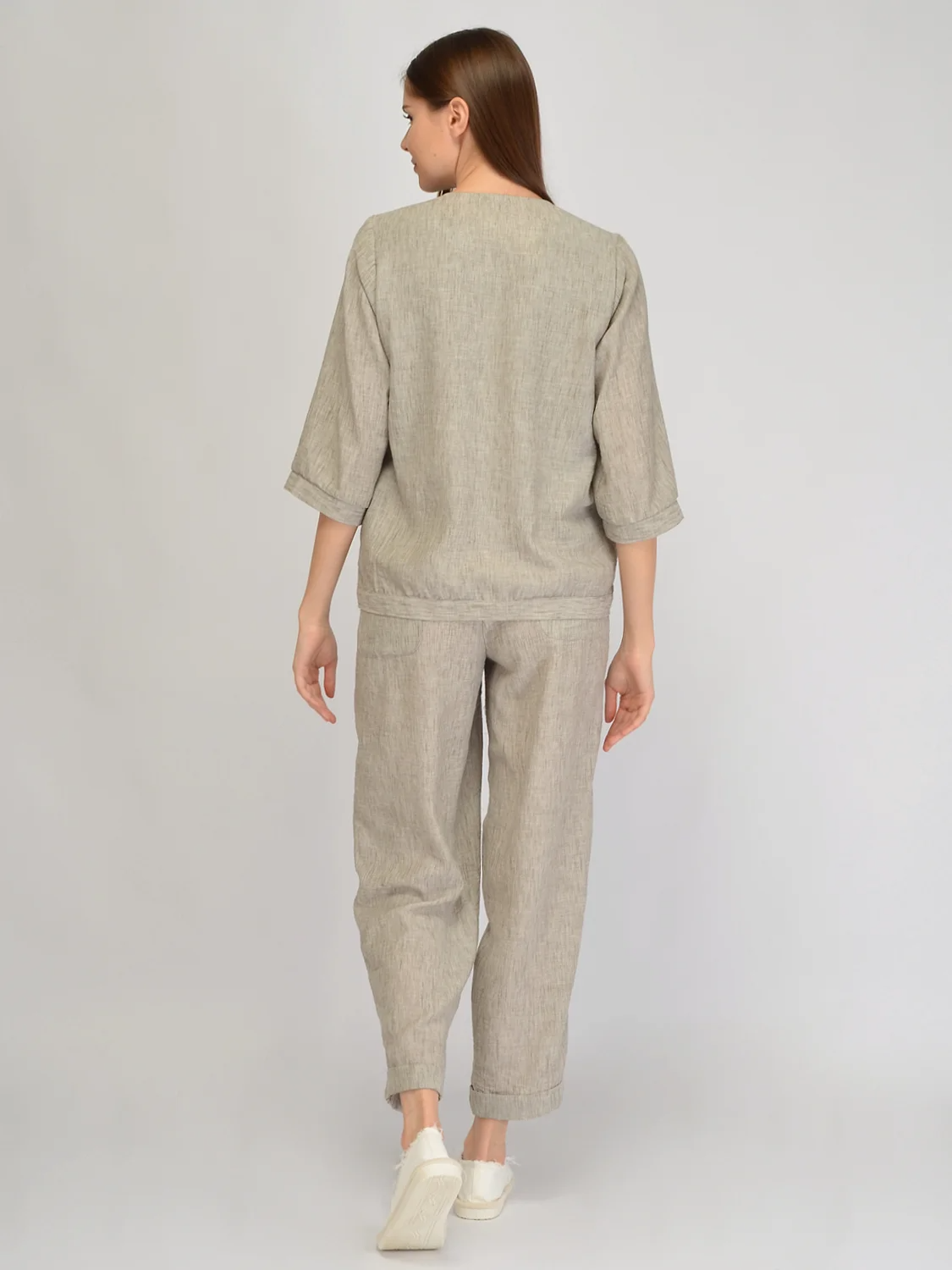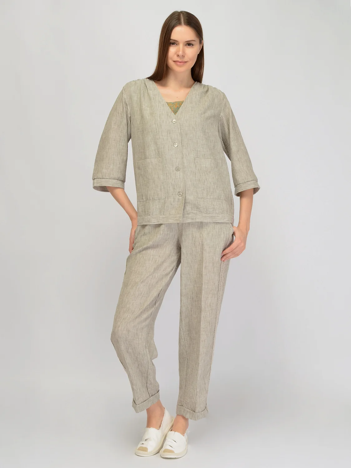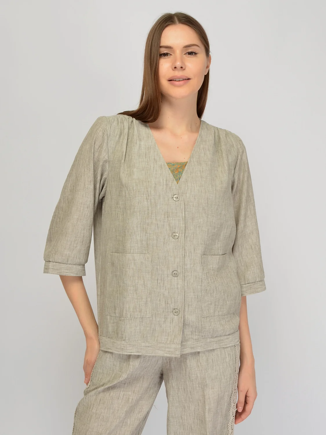 Свободный льняной жакет станет базовым дополнением вашего гардероба, если вы предпочитаете элегантность и практичность. V-образный вырез горловины визуально вытягивает фигуру, придавая образу утонченность и приоткрывая ключицу. Легкий жакет прямого кроя застегивается на пуговицы, которые обеспечивают удобство и надежность фиксации. Офисный жакет с накладными карманами изготовлен из натуральной ткани премиум качества. У летнего женского пиджака большого размера удобные свободные рукава до локтя, которые не сковывают движений. Широкий жакет эффективно скрывает возможные недостатки в области живота, создавая гармоничный и современный образ, подходящий как для работы, так и для культурных мероприятий. Базовый жакет до бедра обеспечивает комфорт на протяжении всего дня. Комплектуйте нарядный пиджак с брюками с кружевной вставкой сбоку, которые выполнены из такой же ткани. Под жакет вы можете надеть топ или футболку или подобрать белье телесного оттенка и носить застегнутым на все пуговицы.