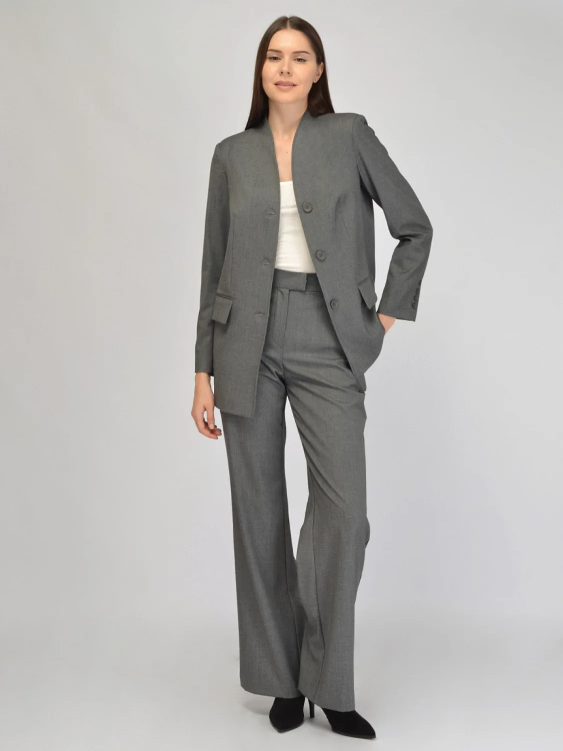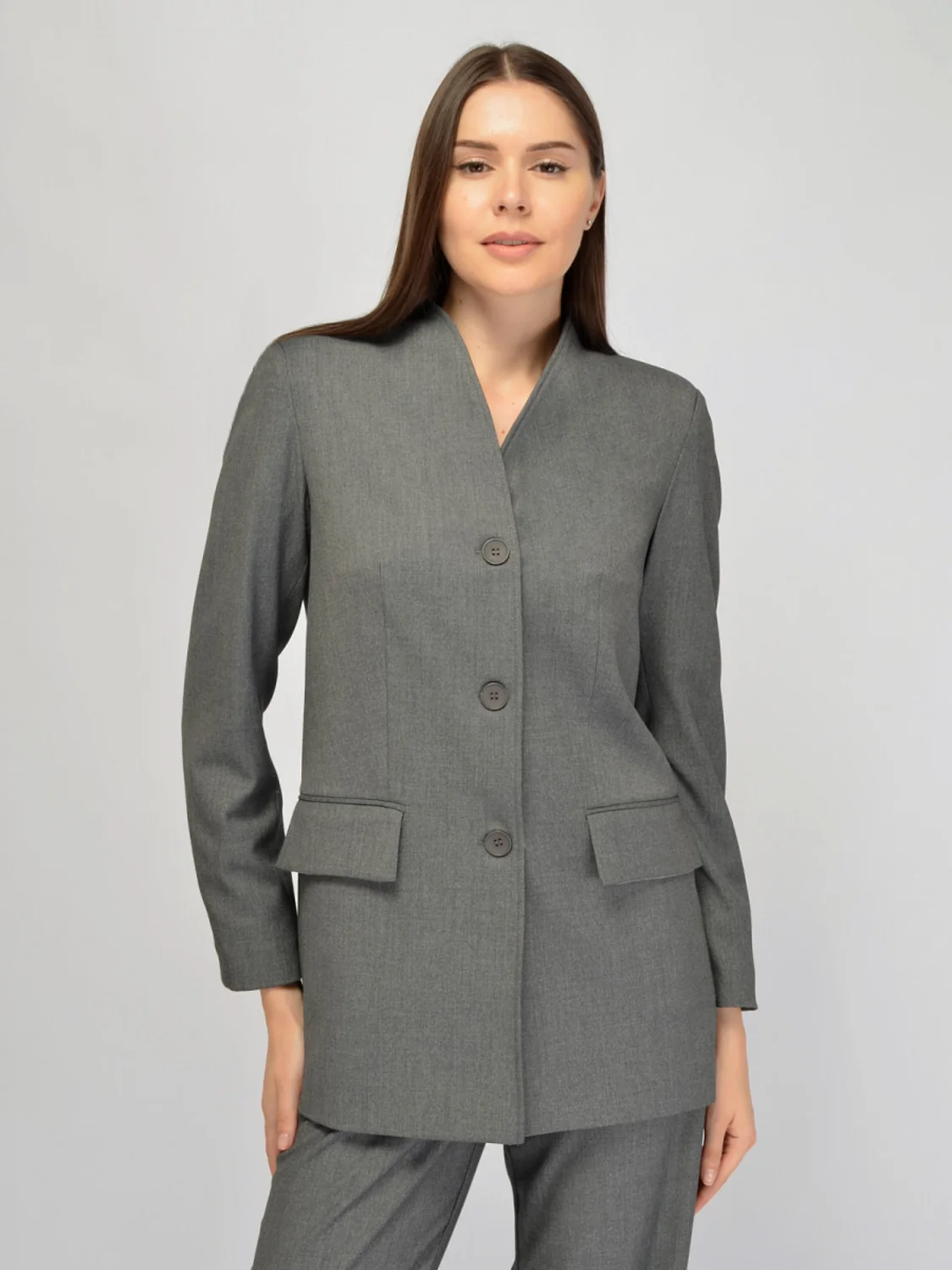 Удлиненный жакет в строгом стиле станет уникальным дополнением осенних образом для работы или праздников. Жакет современного прямого кроя актуальной длины не облегает фигуру и скрывает ее возможные недостатки. Свободный жакет выполнен из приятной плотной ткани, которая практически не мнется и сохранят аккуратный вид на протяжении всего дня. Жакет длинный застегивается на пуговицы в тон изделия. Зона горловины элегантно оформлена, обрамляет шею, позволяя выбрать короткое шейное украшение. Жакет оверсайз имеет вертикальные вытачки и прекрасно сядет на любую фигуру. На передней части жакета расположены два кармана, которые придают образу завершенный вид и имеют практичное назначение. Для осеннего образа важно, чтобы жакет имел длинные и комфортные рукава. Базовый жакет в классических расцветках подойдет для девушек и женщин, который соблюдают строгий дресс код в офисе или выбирают классический стиль для повседневности. Вы можете создать полноценный образ, дополнив жакет комплектными брюками или юбкой из нашей коллекции.