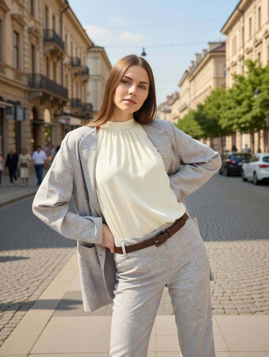 Льняной жакет оверсайз станет неотъемлемой вещью в гардеробе каждой модницы летом. Классический фасон с двумя пуговицами и отложным воротником придают образу некоторой строгости, которая будет уместна на работе, деловой встрече или культурном мероприятии летом. Свободный крой не облегает фигуру, не стесняет движений и является трендовым фасоном уже не первый сезон. Широкий пиджак женский имеет гармоничную длину, прикрывая бедра, создавая вытянутый силуэт. На полочке располагаются два вместительных накладных кармана, без которых невозможно представить образ современной активной девушки. Жакет с глубоким V-образным вырезом выполнен из плотной льняной ткани с добавлением вискозы, поэтому Ваша кожа будет дышать в течение всего даже самого жаркого летнего дня. Создайте завершенный образ, дополнив свободный жакет изо льна комплектными льняными брюками клеш из нашей коллекции. Вы можете выгулять такой комплект как на работу или деловую встречу, так и на праздник или культурное мероприятие.
