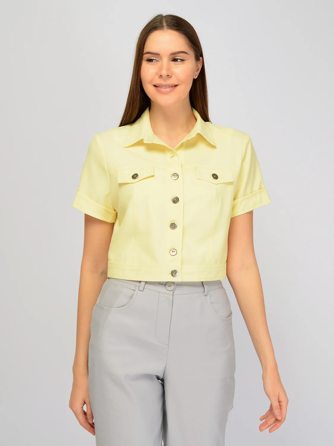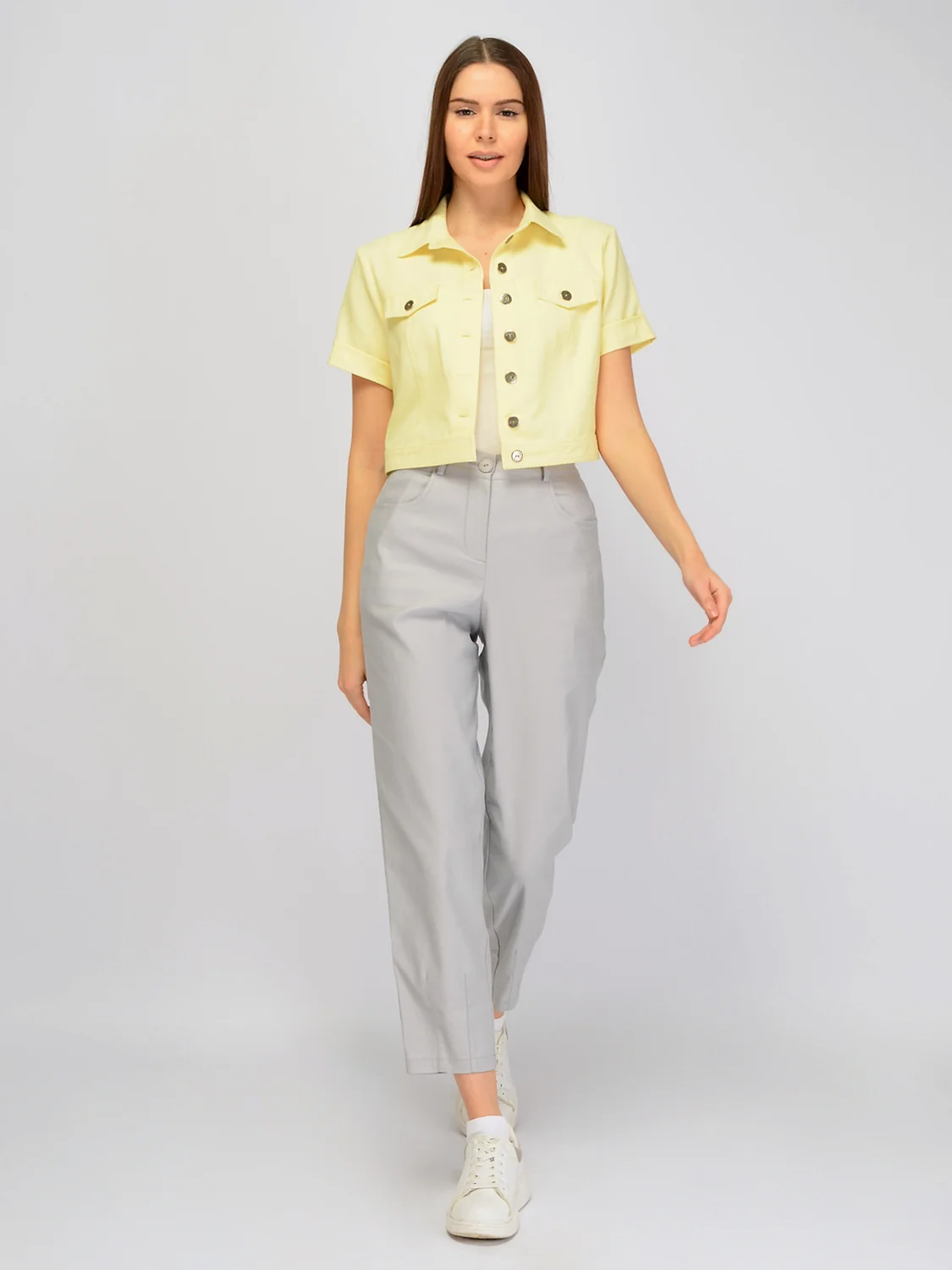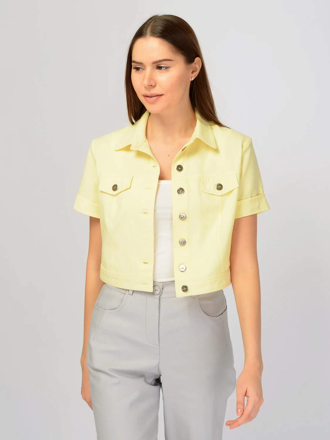 Укороченный жакет до талии дополнит весенне-летний гардероб. Воротник-стойка поможет создать строгий современный образ. На передней части жакета располагаются клапана, карманов нет. Прямой крой и короткие рукава обеспечат Вам комфорт в тёплое время года. Укороченная длина жакета визуально удлиняет нижнюю часть тела и выгодно подчёркивает талию. Рукав короткий. Вид застёжки - пуговицы. Воротник отложной. Вырез Головины - округлый. Без карманов. Рукав втачной. Кокетка, рельефы отстрочены двойной строчкой. На полочке клапана. Рекомендована стирка при температуре не более 30С.Крой жакета позволяет носить его как самостоятельную верхнюю часть комплекта, застегнув его на все пуговицы. Но также под него вы можете поддеть футболку или блузку с коротким рукавом и носить его нараспашку. Брюки или юбки подбирайте с высокой талией. Современная мода позволяет сочетать классические вещи со спортивной обувью, поэтому помимо туфель или лоферов Вы можете подобрать к жакету кроссовки или кеды.