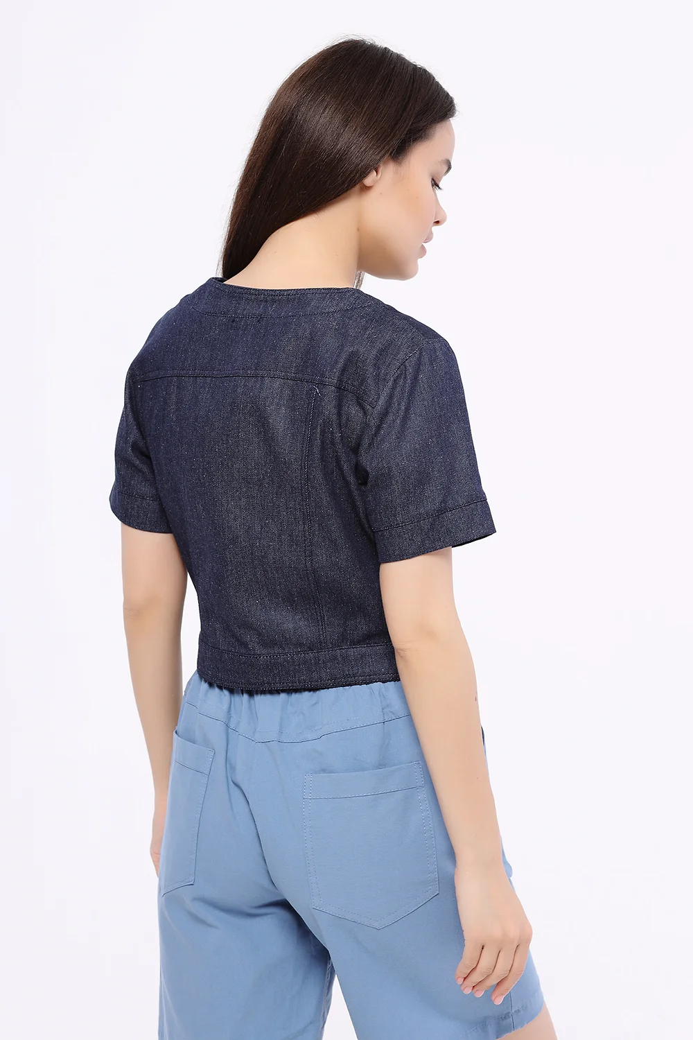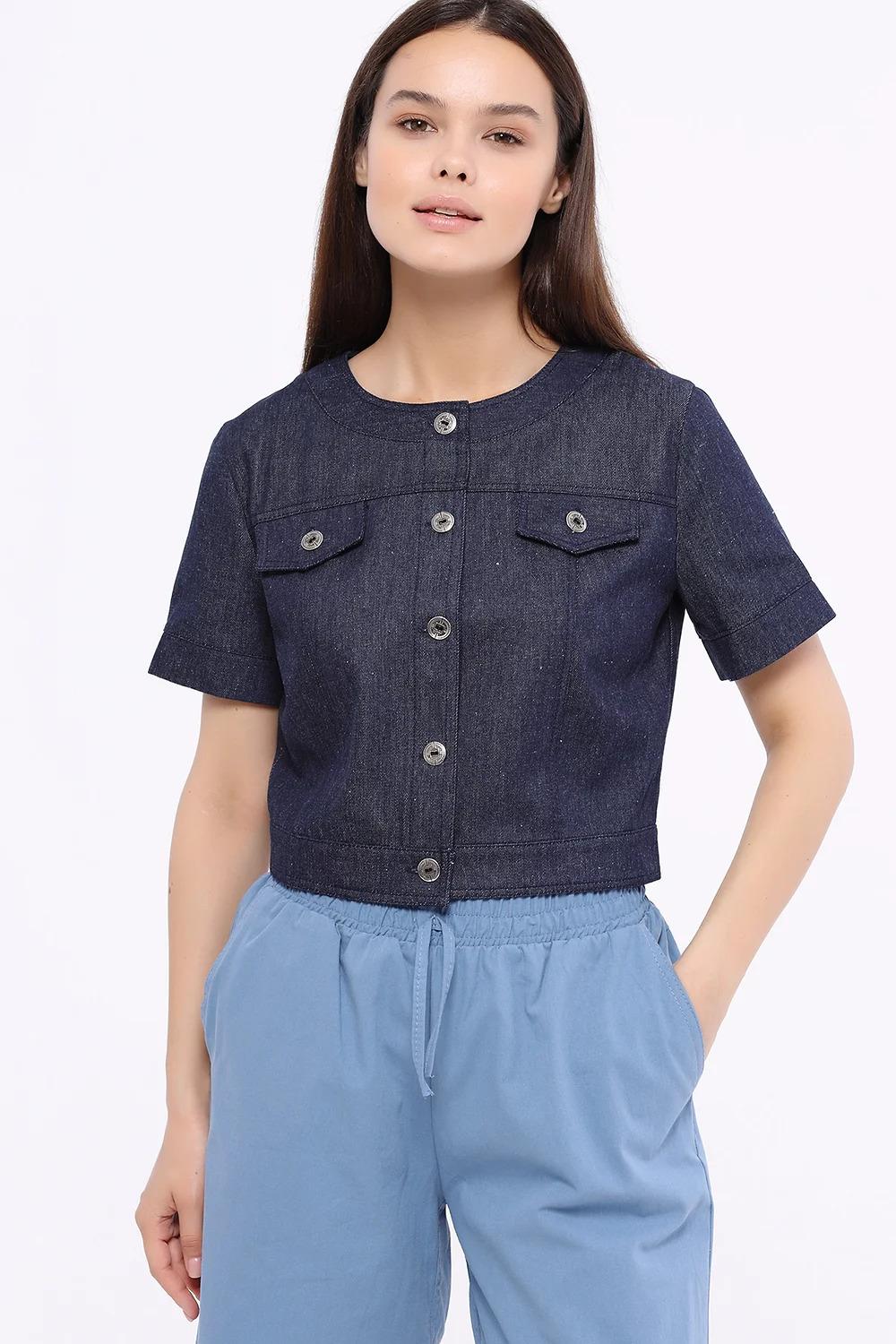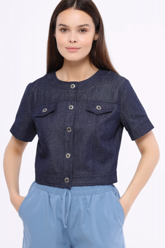 Жакет укороченный с короткий рукавом. Укороченный жакет гармонично дополнит летние образы. Изящный округлый вырез деликатно приоткрывает ключицу. На передней части жакета располагаются клапана, карманов нет. Приталенный крой и короткие рукава обеспечат Вам комфорт прохладным летним вечером. Укороченная длина жакета визуально удлиняет нижнюю часть тела и выгодно подчёркивает талию.В составе жакета хлопок 100%. Вырез горловины - круглый. Рукав короткий. Рукав втачной. Вид застёжки - пуговицы. Крой приталенный. Без карманов. Кокетка, рельефы отстрочены двойной строчкой. На полочке клапана. Изделие без воротника. Рекомендована стирка при температуре не более 30С.Вы можете поддеть под укороченный жакет футболку или блузку без рукавов и носить его нараспашку. Однако, крой жакета позволяет носить его и как самостоятельную верхнюю часть комплекта, застегнув его на все пуговицы. Наиболее выигрышно будут смотреться юбки и брюки с высокой талией. Современная мода позволяет сочетать разные по стилю элементы образа, поэтому, помимо классической обуви, Вы можете подобрать к жакету кроссовки или кеды.