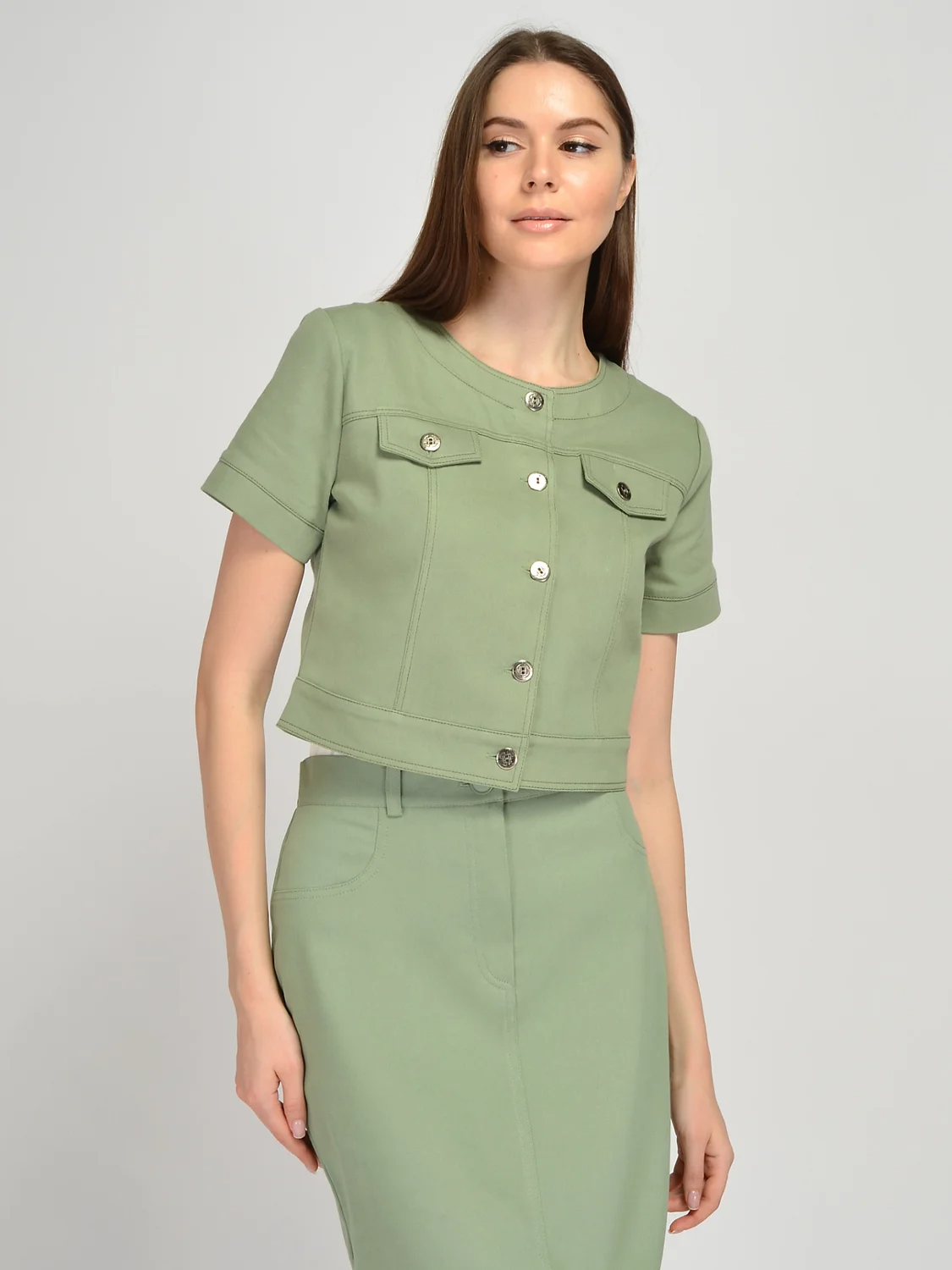 Жакет укороченный с короткий рукавом. Укороченный жакет гармонично дополнит летние образы. Изящный округлый вырез деликатно приоткрывает ключицу. На передней части жакета располагаются клапана, карманов нет. Приталенный крой и короткие рукава обеспечат Вам комфорт прохладным летним вечером. Укороченная длина жакета визуально удлиняет нижнюю часть тела и выгодно подчёркивает талию.В составе жакета хлопок 100%. Вырез горловины - круглый. Рукав короткий. Рукав втачной. Вид застёжки - пуговицы. Крой приталенный. Без карманов. Кокетка, рельефы отстрочены двойной строчкой. На полочке клапана. Изделие без воротника. Рекомендована стирка при температуре не более 30С.Вы можете поддеть под укороченный жакет футболку или блузку без рукавов и носить его нараспашку. Однако, крой жакета позволяет носить его и как самостоятельную верхнюю часть комплекта, застегнув его на все пуговицы. Наиболее выигрышно будут смотреться юбки и брюки с высокой талией. Современная мода позволяет сочетать разные по стилю элементы образа, поэтому, помимо классической обуви, Вы можете подобрать к жакету кроссовки или кеды.