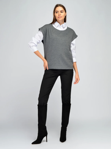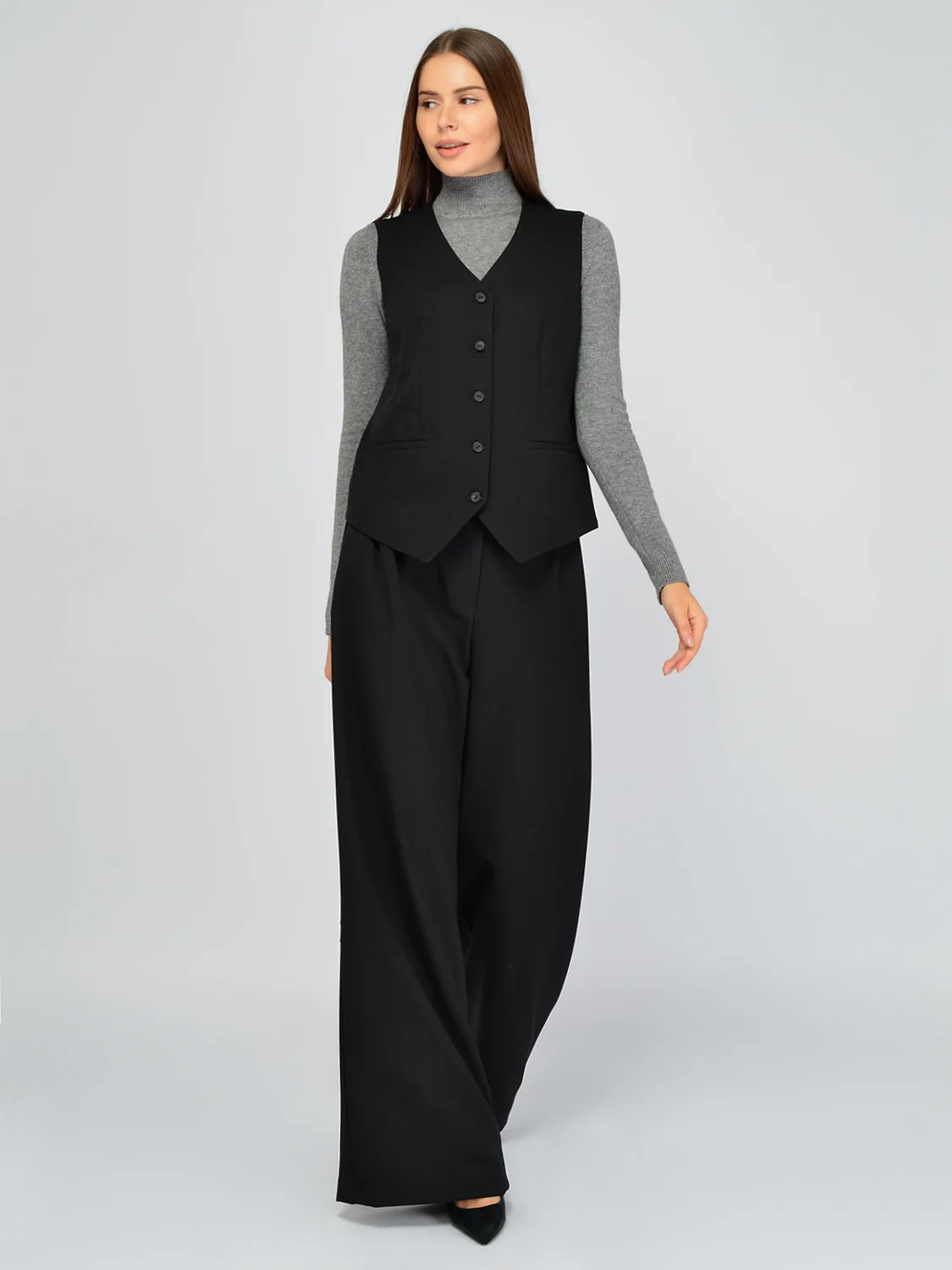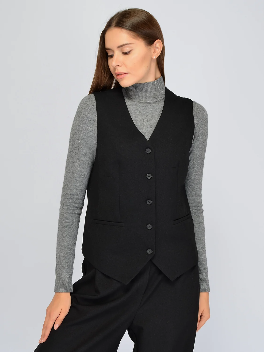 Классический жилет с V-образным вырезом станет стильным дополнением осенних и зимних образов. Элегантный вырез горловины визуально вытягивает линию шеи, делая ее длиннее. Он также позволит интересно обыграть линию декольте украшениями. Теплый жилет застегивается на пуговицы. Спереди внизу располагается аккуратный V-образный вырез, повторяя форму горловины. На жилете предусмотрены вертикальные вытачки, поэтому модель корректирует фигуру, создавая вытянутый силуэт. На передней части находятся фальшь-карманы, дополняя строгий стиль. Осенний классический жилет выполнен из приятной плотной ткани, которая не колется и хорошо держит форму. Базовый жилет приталенного кроя идеально сочетается с комплектными широкими кюлотами и брюками на резинке. Вы сможете создать элегантный и стильный образ для работы, официальных или торжественных мероприятий. Дополните комплект блузкой, рубашкой или водолазкой, а также подходящей обувью. Завершите образ украшениями и аксессуарами.
