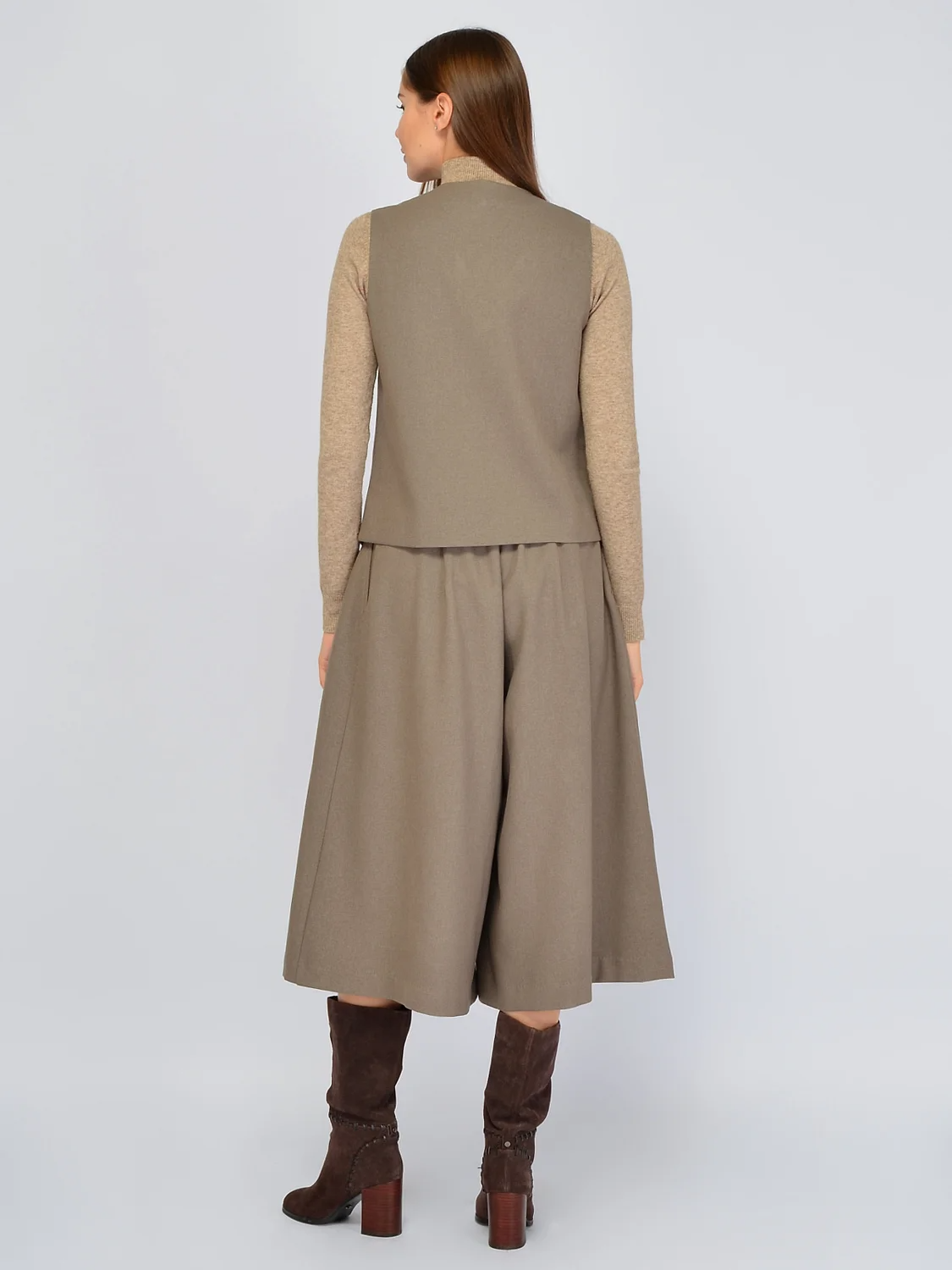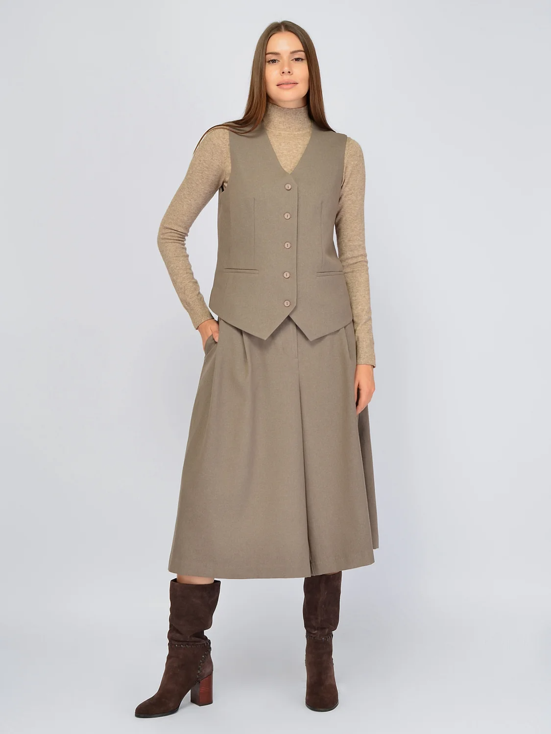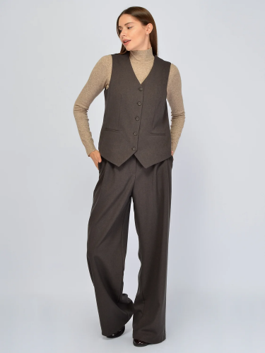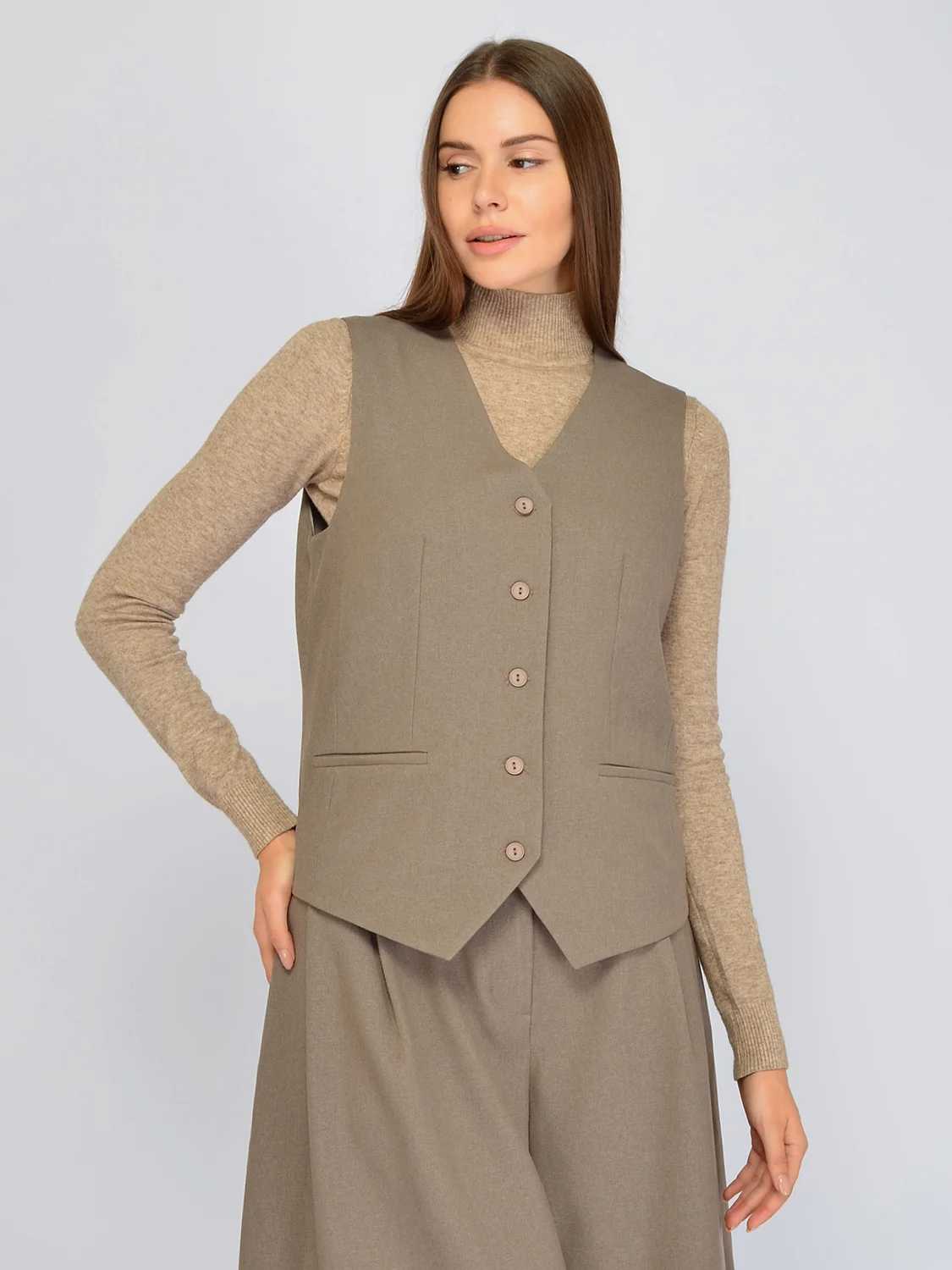 Классический жилет с V-образным вырезом станет стильным дополнением осенних и зимних образов. Элегантный вырез горловины визуально вытягивает линию шеи, делая ее длиннее. Он также позволит интересно обыграть линию декольте украшениями. Теплый жилет застегивается на пуговицы. Спереди внизу располагается аккуратный V-образный вырез, повторяя форму горловины. На жилете предусмотрены вертикальные вытачки, поэтому модель корректирует фигуру, создавая вытянутый силуэт. На передней части находятся фальшь-карманы, дополняя строгий стиль. Осенний классический жилет выполнен из приятной плотной ткани, которая не колется и хорошо держит форму. Базовый жилет приталенного кроя идеально сочетается с комплектными широкими кюлотами и брюками на резинке. Вы сможете создать элегантный и стильный образ для работы, официальных или торжественных мероприятий. Дополните комплект блузкой, рубашкой или водолазкой, а также подходящей обувью. Завершите образ украшениями и аксессуарами.
