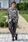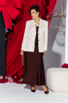 Жакет полуприлегающего силуэта, удлинённый с центральной застёжкой на отделочные пуговицы по борту и с отложными лацканами. По переду жакета рельефы и прорезные карманы с клапанами. Спинка в жакете со средним швом и рельефами. Рукав втачной, двухшовный, длинный.