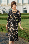 Платье (состав: 100% полиэстер) силуэта «рыбка» длины миди на регулируемых бретелях с драпировкой горловины – «качели». По спинке платья талиевые вытачки.